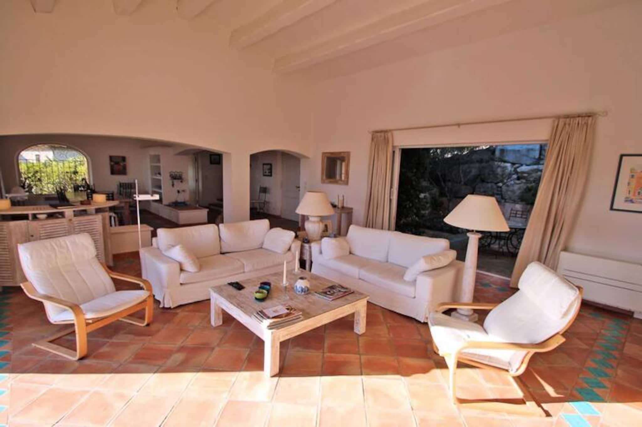 Denne rummelige 280 m² villa i neo-provencalsk stil, beliggende i Domaine du Golf, tilbyder en betagende havudsigt over St. Tropez-bugten. Med 5 soveværelser og en privat infinity-pool kan den rumme op til 10 gæster. Villaen har en stor stue med aircondition, havudsigt, spiseplads og adgang til pool og terrasse. Det fuldt udstyrede køkken omfatter opvaskemaskine, ovn, mikroovn og kaffemaskine. Stueetagen har også to soveværelser med en-suite badeværelser, mens den øverste etage kan prale af to ekstra soveværelser med udsigt over havet og haven. Det nederste niveau omfatter det femte soveværelse og badeværelse. Villaens 100 m² store terrasse er ideel til udendørs spisning, komplet med liggestole, borde, stole og en gasgrill. Den smukt anlagte have har middelhavsplanter og et petanqueområde. Overløbsbassinet på 9x4 meter kan opvarmes mod et ekstra gebyr, og der er parkering for op til tre køretøjer. Villaen ligger kun 4500 meter fra byens centrum og strand, med butikker og en golfbane kun 2500 meter væk. Yderligere faciliteter inkluderer Wi-Fi, aircondition overalt, en pejs (kun til dekorativ brug) og et vaskerum med vaskemaskine og tørretumbler. Villaen er fri for kæledyr, og der kræves et depositum på EURO2000. Gæster kan anmode om poolopvarmning (tilgængelig fra juni til september), og flere lejemuligheder er tilgængelige for sengetøj, håndklæder og et babysæt.