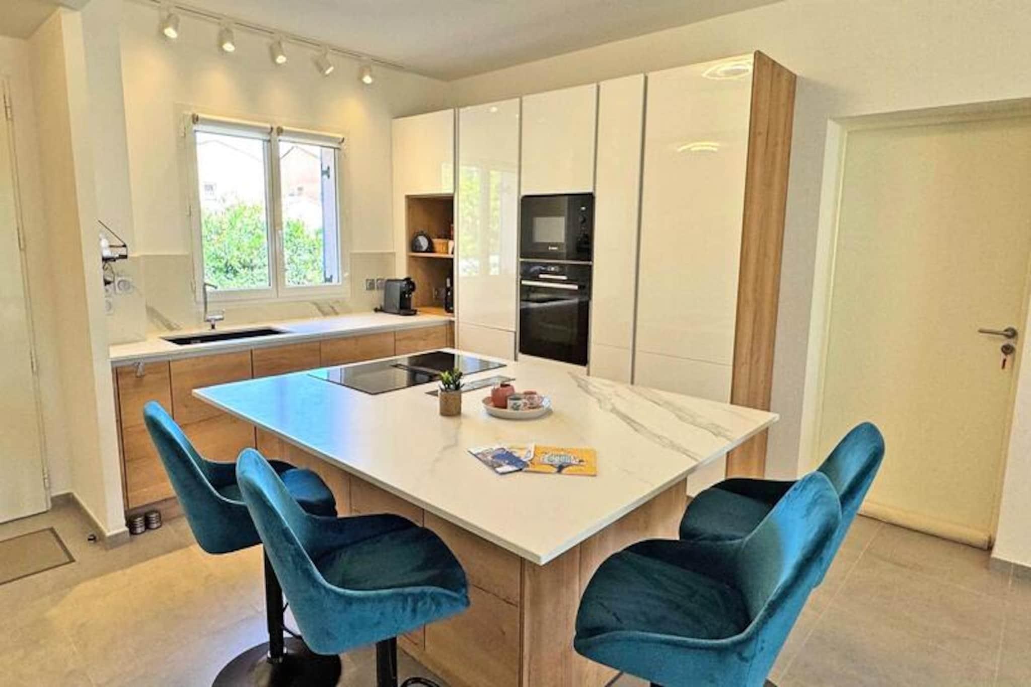 Kun en kort gåtur fra Middelhavets gyldne sandstrand tilbyder dette charmerende dobbelthus i den eksklusive Casa Di Mare Residence et luksuriøst tilflugtssted for op til 10 gæster. Ejendommen er omgivet af et roligt, lukket område og er en oase af komfort og stil, perfekt til familier eller grupper, der søger en blanding af afslapning og eventyr ved havet. Den frodige have på 500 m², komplet med en privat swimmingpool og petanquebane, inviterer dig til at slappe af under den varme sol fra den franske riviera. Huset strækker sig over to etager og kan prale af et rummeligt og smagfuldt indrettet interiør. Stueetagen har en lys stue med aircondition, der åbner ud til haven og poolen, et fuldt udstyret moderne køkken med en køkkenø og et hyggeligt soveværelse med fleksible sovemuligheder. Ovenpå tilbyder tre yderligere soveværelser med aircondition, herunder et med delvis havudsigt og eget badeværelse, afslappende tilflugtssteder. Højhastigheds-WiFi, et storskærms-tv og gennemtænkte faciliteter sikrer et problemfrit ophold. Beliggende kun 350 meter fra stranden og en kort køretur fra Sainte-Maximes pulserende bymidte, placerer denne ejendom dig i hjertet af Côte d'Azurs charme. Udforsk charmerende lokale markeder, nyd provencalsk køkken, eller tag på en bådtur til Saint-Tropez. Uanset om du slapper af ved poolen, nyder måltider under åben himmel på den overdækkede terrasse eller slentrer langs kysten, lover dette hjem en uforglemmelig ferie. Med sin førsteklasses beliggenhed, moderne komfort og rolige omgivelser er denne bolig det perfekte valg til din næste middelhavsferie.