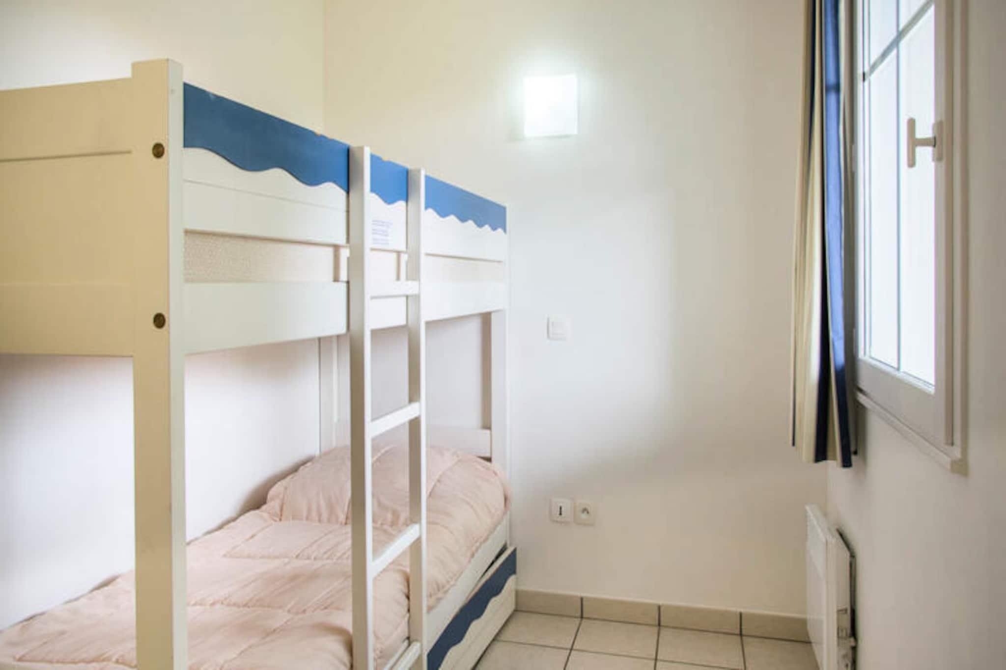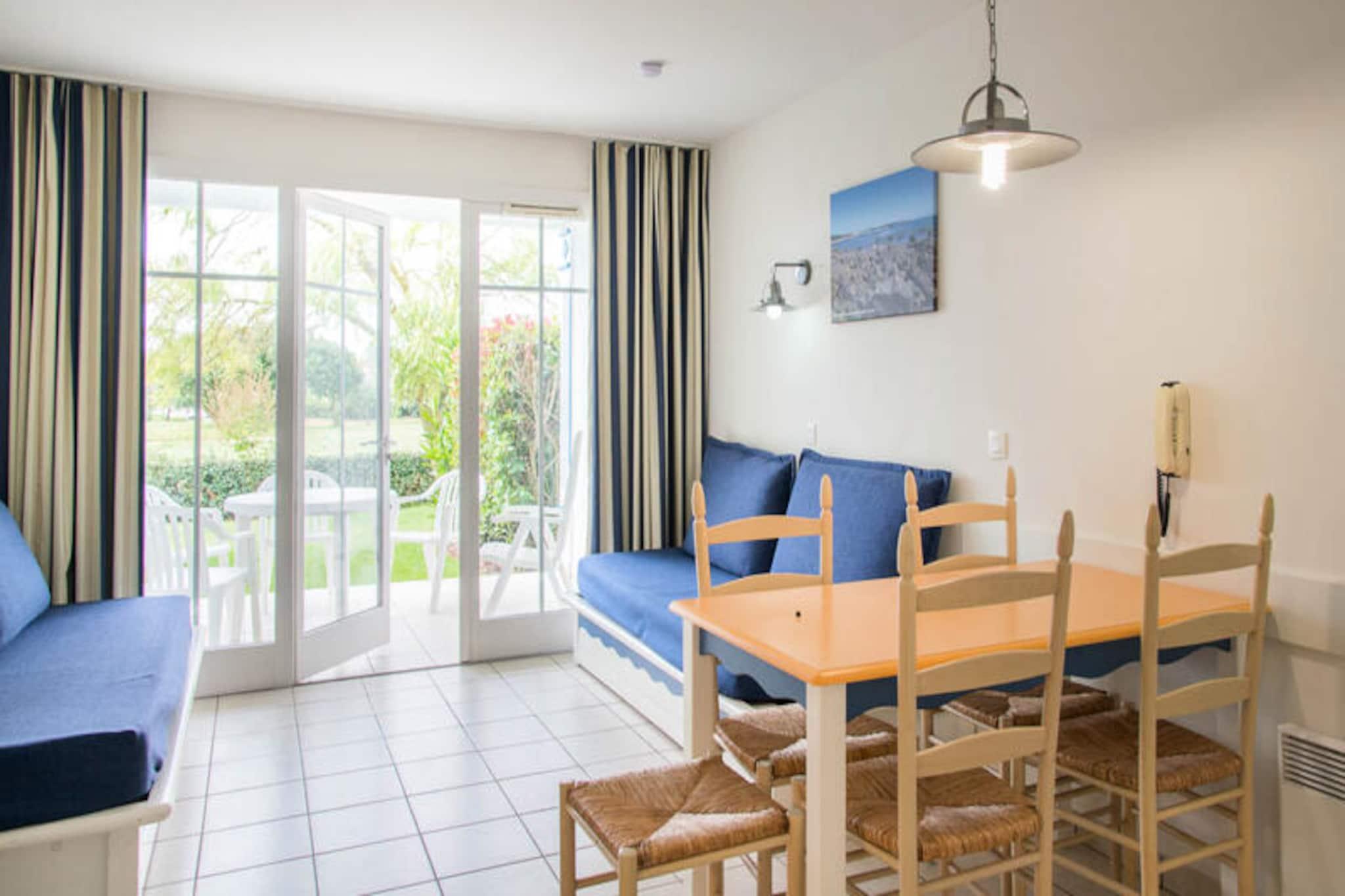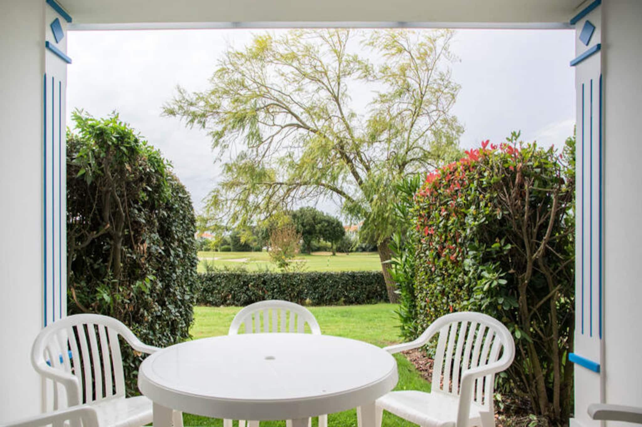 Denne rummelige lejlighed i stueetagen tilbyder komfortabel indkvartering for op til 6 gæster i Vendée, Frankrig. Lejligheden har en stue med to sovesofaer (den ene med udtræksseng) og en sovekabine med køjesenge. Kæledyr kan tillades mod et ekstra gebyr (spørg venligst boligen). Denne lejlighed ligger i et 90 hektar stort feriested i Talmont-Saint-Hilaire og er omgivet af en fyrreskov og har udsigt over en sø. Nyd faciliteter på stedet som et pizzeria, bageri, bar og flere swimmingpools med rutsjebaner. Udforsk de nærliggende strande eller spil en runde golf eller tennis. Lejligheden har et veludstyret køkken, et badeværelse med badekar og håndklædetørrer samt en møbleret terrasse med udsigt til golfbanen. Denne maeva Home Selection-ejendom er velholdt og tilbyder kvalitetsfaciliteter til et afslappende ophold.