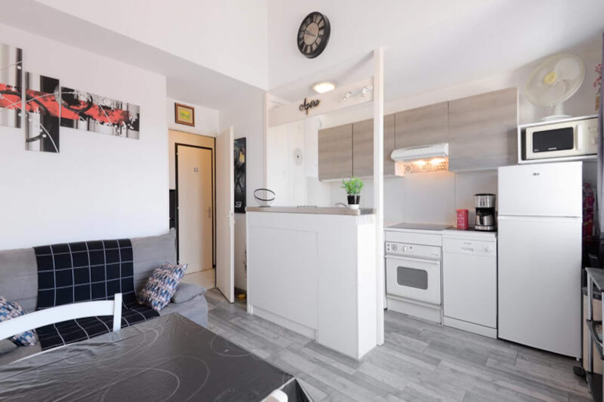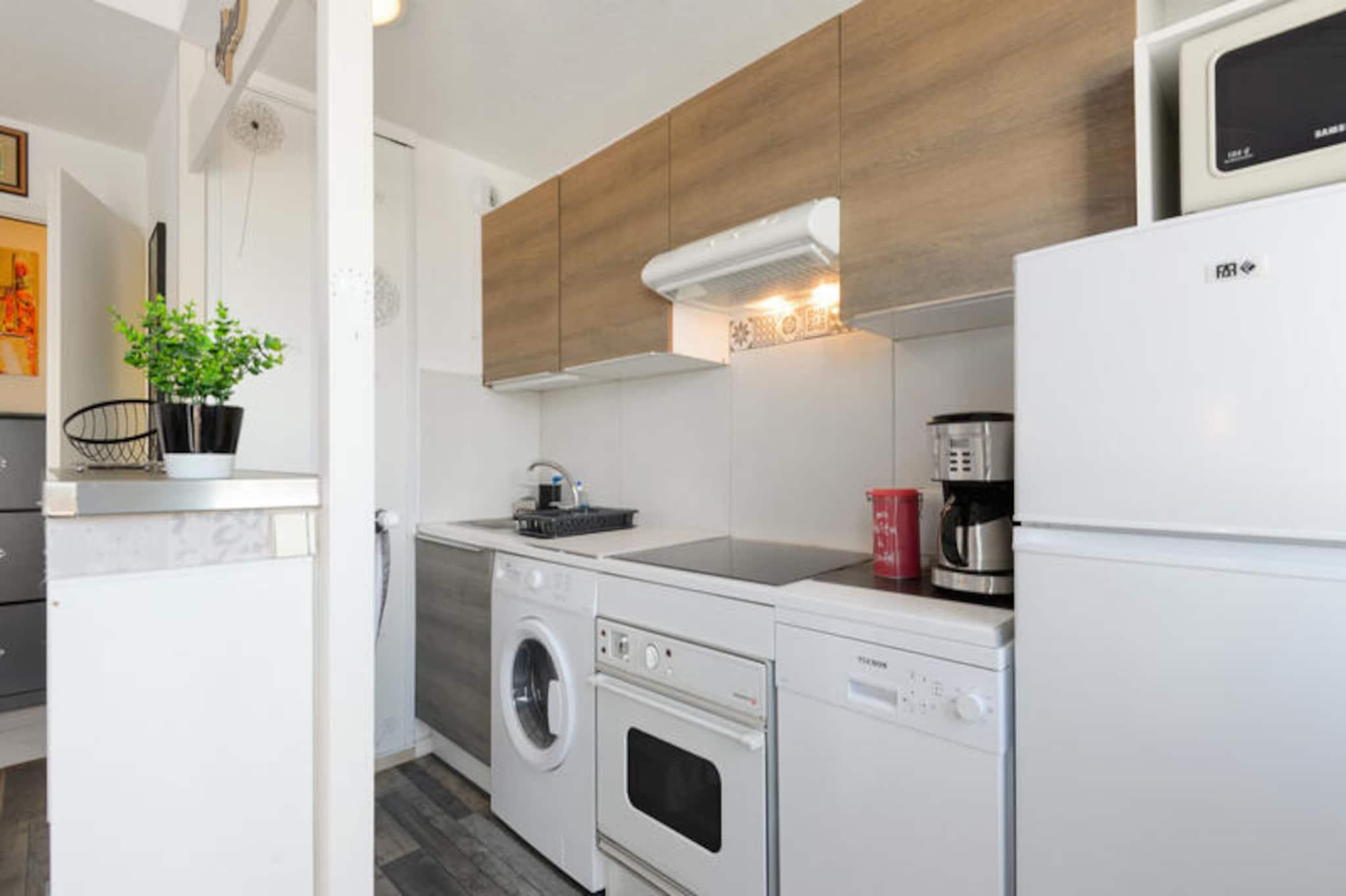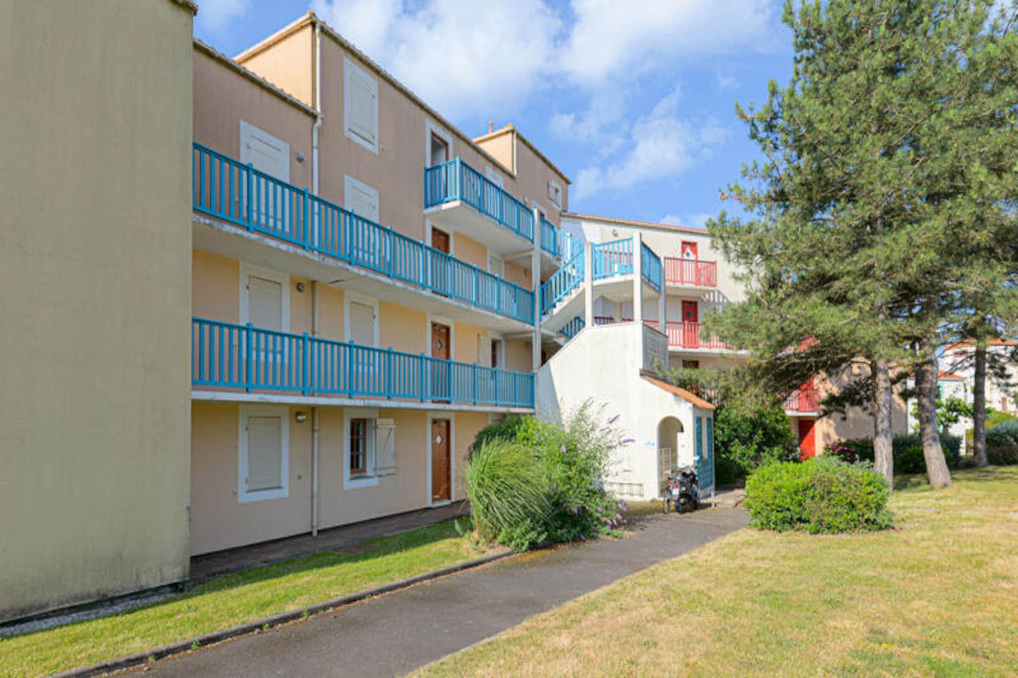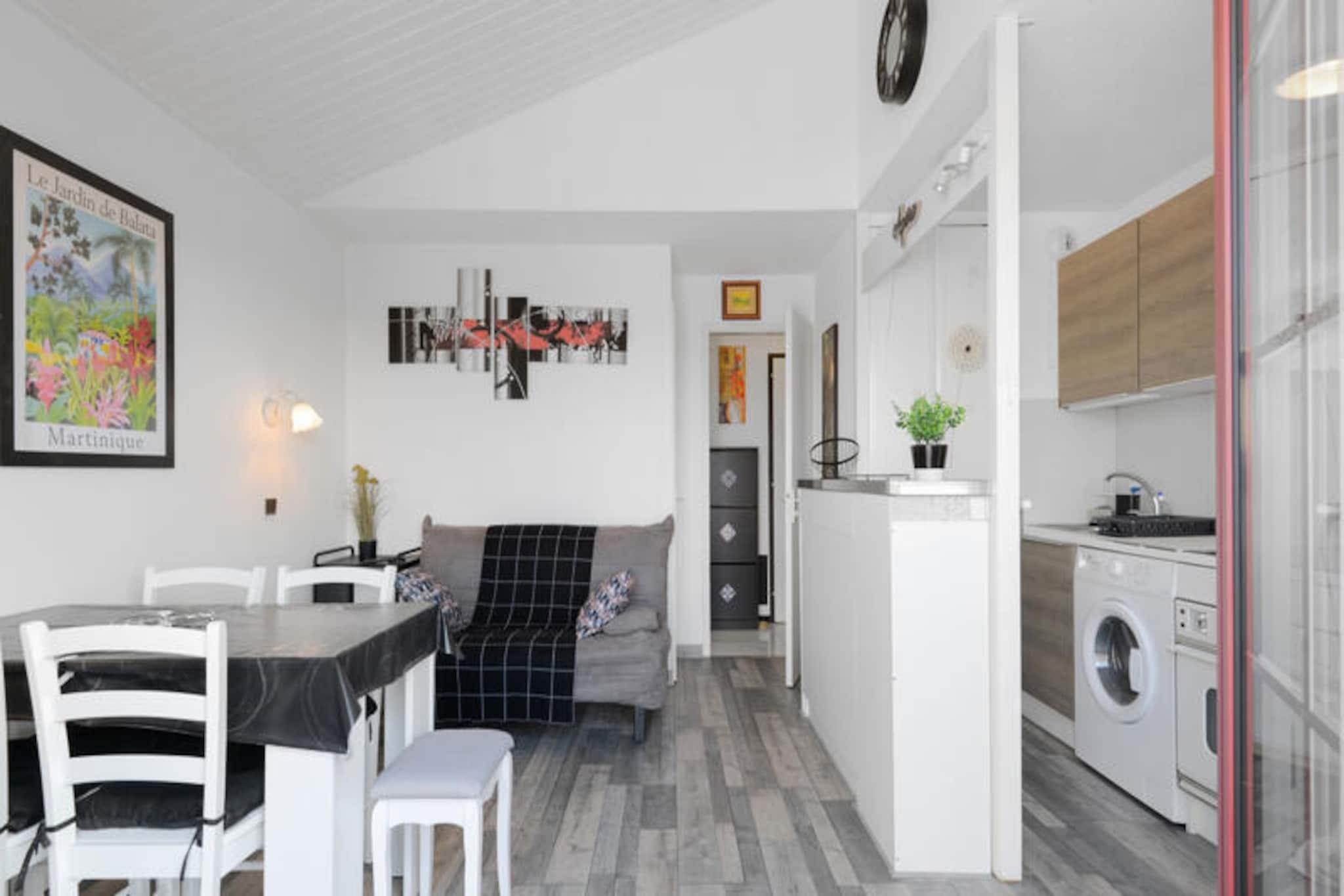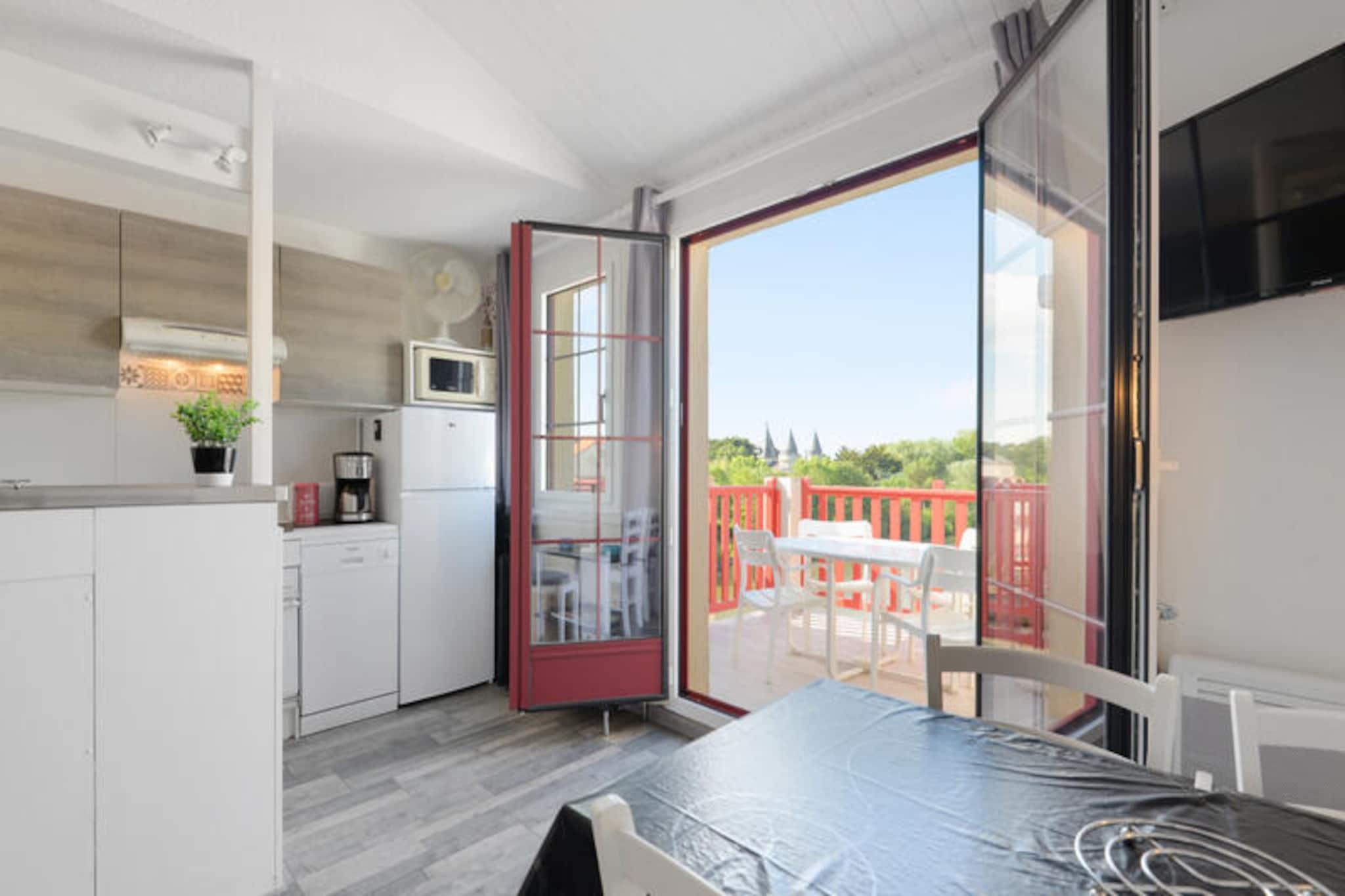 Denne moderne lejlighed kan rumme op til 5 gæster med en stue med en sovesofa (2 personer) og et soveværelse med 3 senge (1 enkeltseng, 2 køjesenge). Ejendommen er kæledyrsvenlig (mod tillægsgebyr), og babysæt er tilgængelige efter anmodning. Der tilbydes gratis udækket parkering, og rengøring eller skift af sengetøj kan tilføjes mod et tillægsgebyr. En balkon tilbyder en naturskøn udsigt over søen. Ejendommen ligger på en 90 hektar stor ejendom omgivet af fyrreskove, 2,5 km fra Veillon-stranden, som er tilgængelig til fods, på cykel eller med transport. Her kan du nyde forskellige vandaktiviteter, og boligen har 3 pools, herunder en opvarmet pool, rutsjebaner og et soppeområde med vandspil. Faciliteterne på stedet inkluderer et pizzeria, bageri og bar. Lejligheden har et moderne køkken med mikroovn, komfur og køleskab, åbent til stuen for bekvemmelighed. Badeværelset har bruser, og der er separat toilet. Yderligere funktioner inkluderer Wifi (mod ekstra gebyr), et tv og fritidsaktiviteter såsom golf, tennis og minigolf (mod tillægsgebyr).