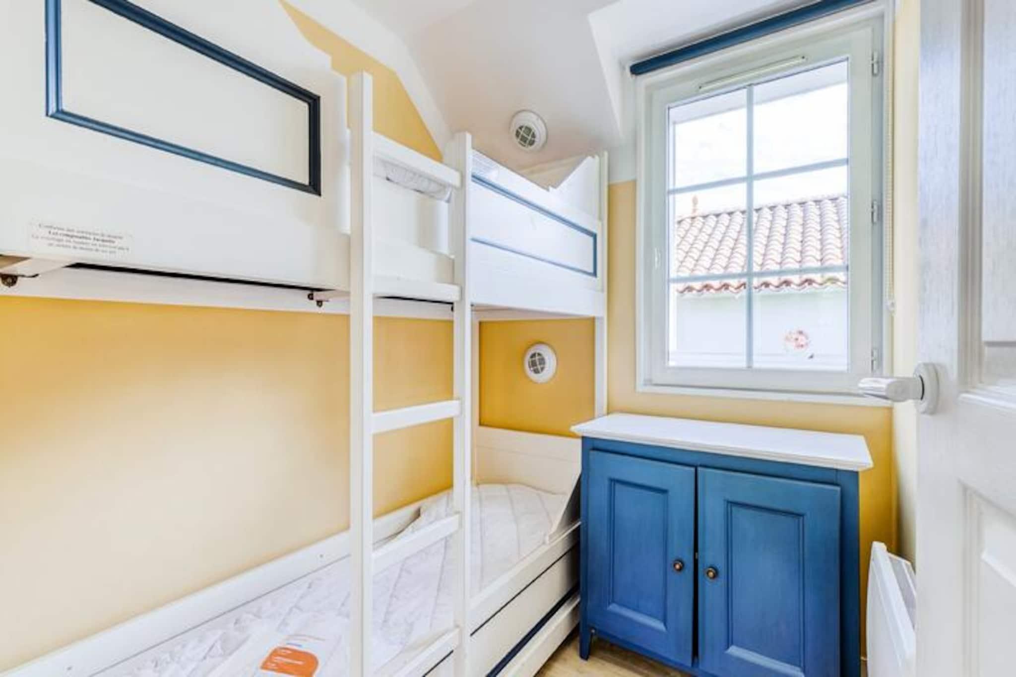 Dette to-etagers feriehus er perfekt til familier og tilbyder komfortable sovearrangementer for op til 6 gæster. Det har 2 soveværelser med dobbeltsenge og enkeltsenge, et kabineområde med køjesenge og en sovesofa i stuen. To badeværelser, det ene med badekar og det andet med bruser, sikrer bekvemmelighed for alle. Ejendommen tillader kæledyr mod et ekstra gebyr (sørg for at tjekke med boligen). Beliggende i Port-Bourgenay-residensen har hjemmet en privat terrasse og parkering på stedet. Selve boligen ligger i nærheden af ??Bourgenays lystbådehavn og byder på en charmerende atmosfære ved havet. Selvom der ikke er nævnt restauranter eller butikker i umiddelbar nærhed, giver boligen adgang til forskellige faciliteter afhængigt af det specifikke distrikt, du er placeret i. Disse omfatter opvarmede swimmingpools med soppebassiner og udstyrede strande (åbent i højsæsonen og reserveret til gæster, der bor i dette område). Inde i huset finder du et veludstyret køkken åbent til stuen, ideelt til at tilberede måltider sammen. Stuen giver et behageligt sted at slappe af med plads til seks. Mens nogle faciliteter såsom wifi, sengetøj og håndklæder er tilgængelige mod et ekstra gebyr, er slutrengøring obligatorisk.