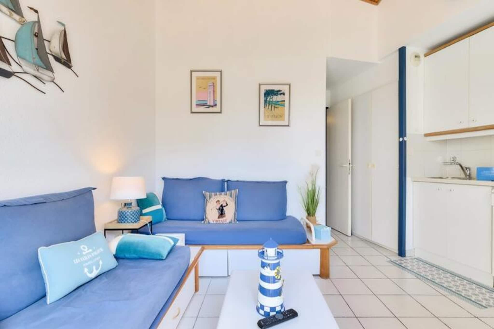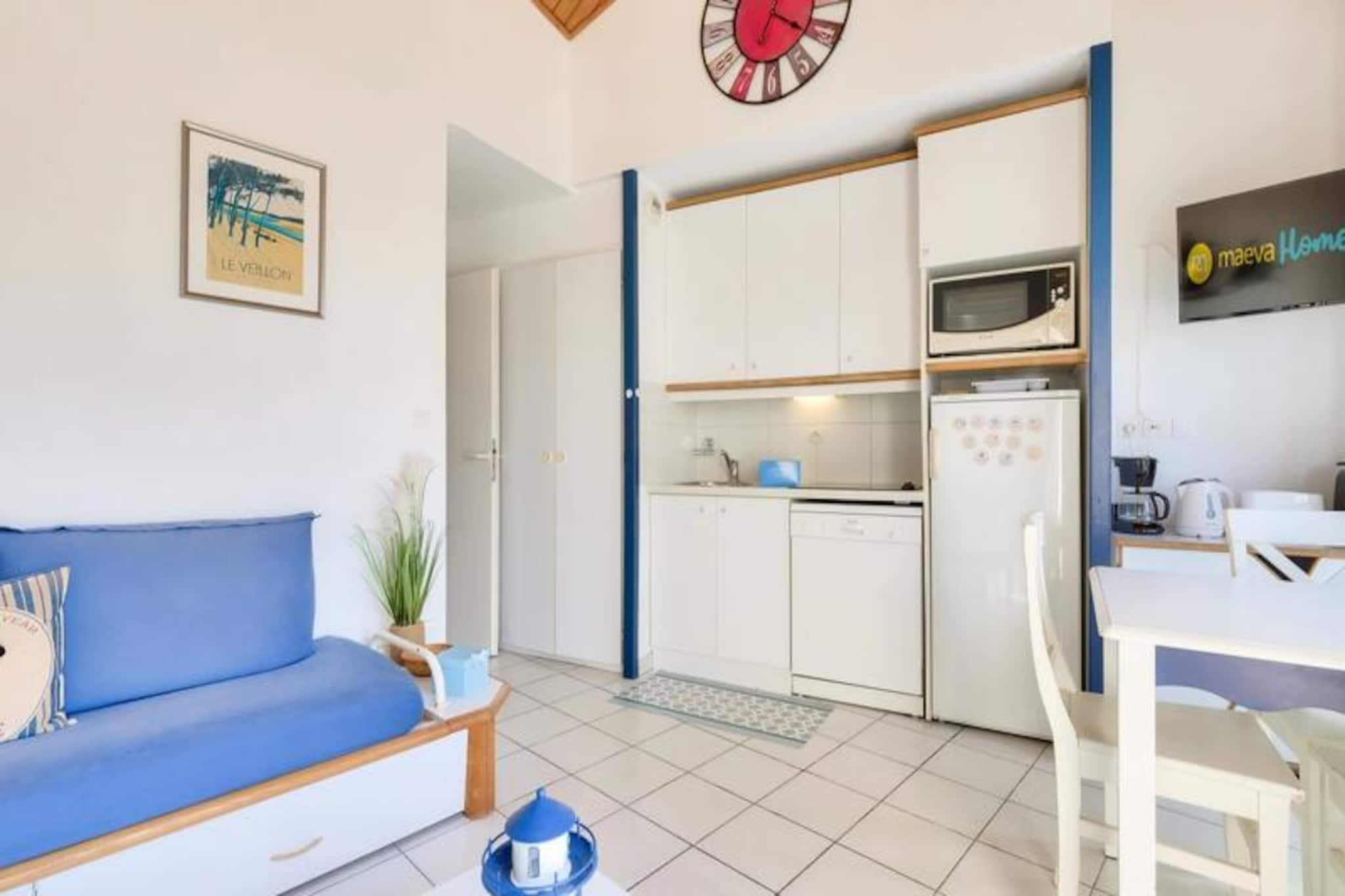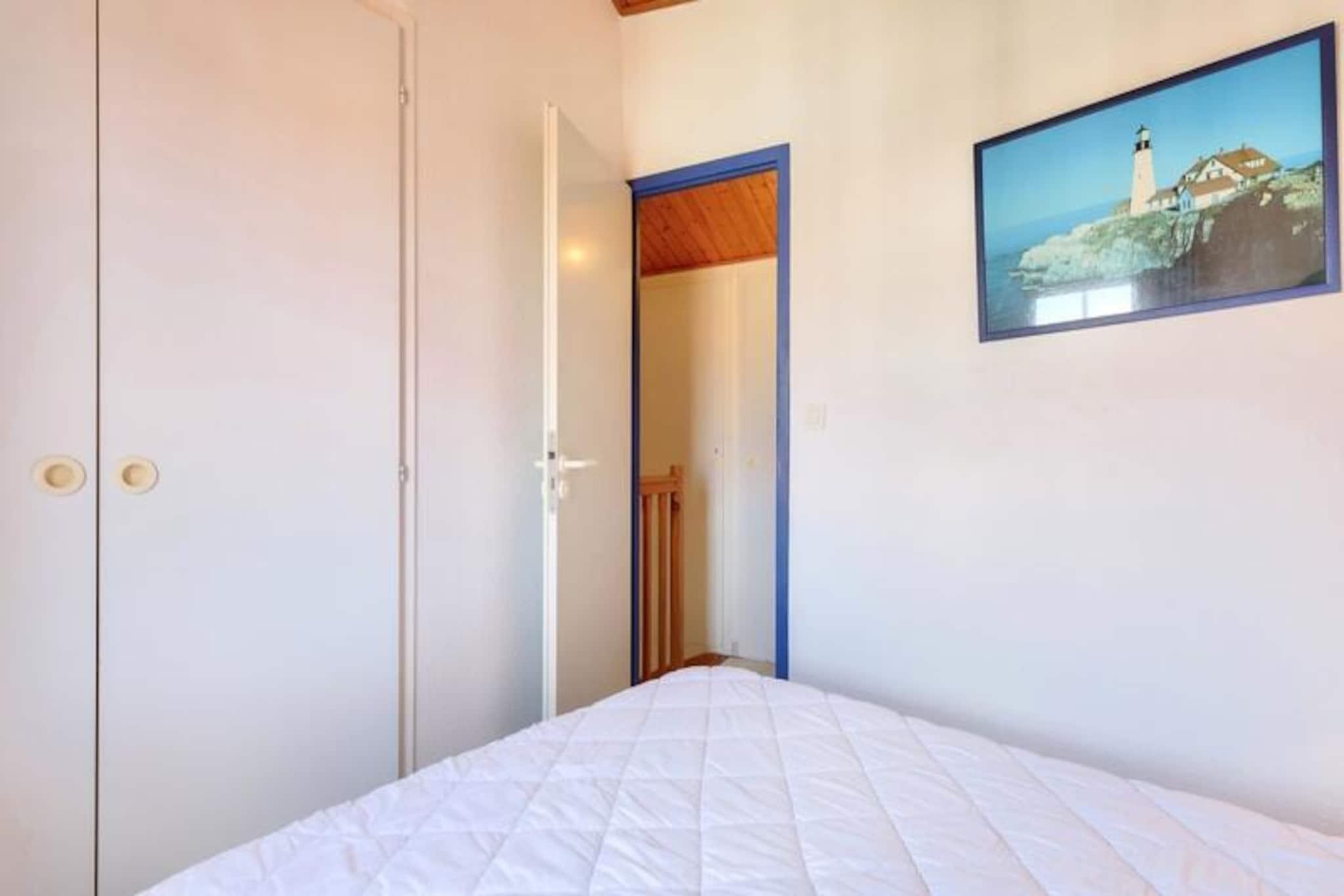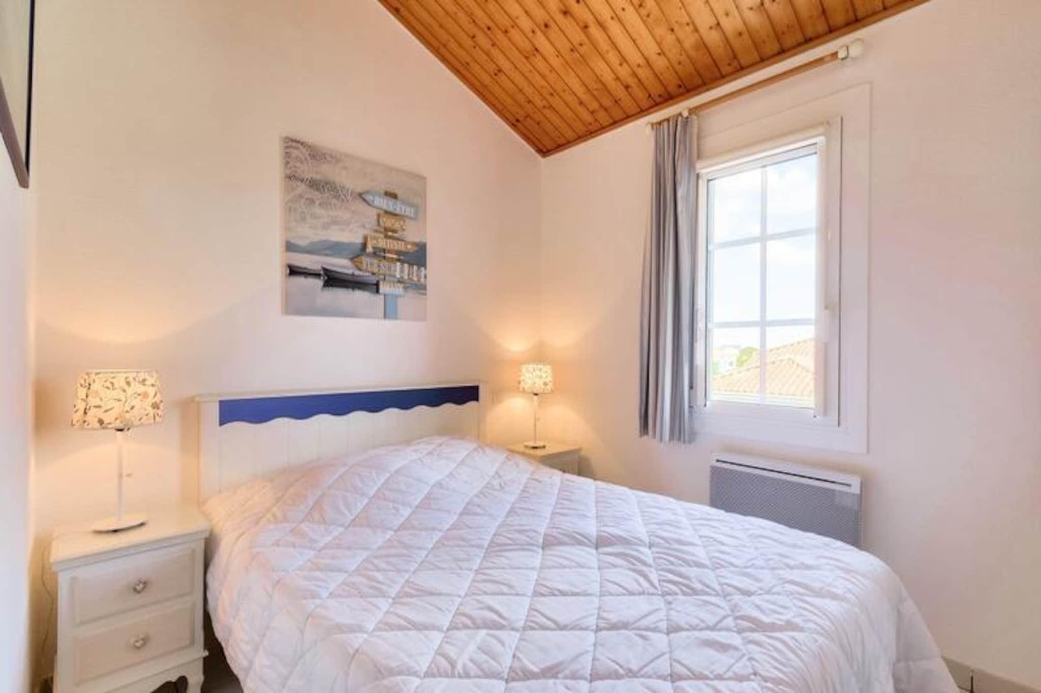 Denne duplex lejlighed, beliggende i en fredelig 90 hektar stor ejendom, tilbyder et behageligt ophold for op til 6 personer. Det omfatter to soveværelser - det ene med en dobbeltseng og det andet med køjesenge - sammen med to badeværelser og to toiletter. Kæledyr er tilladt mod et ekstra gebyr, og babysæt er tilgængelige efter anmodning. Lejligheden har balkon med sydvendt udsigt over golfbanen, og gæsterne kan nyde bekvemmeligheden ved en udendørs parkeringsplads. Bemærk venligst, at WiFi er tilgængeligt mod et tillægsgebyr. Dette feriehus ligger kun 2,5 km fra Veillon-stranden og er ideelt for strandelskere og udendørsentusiaster. Boligen giver adgang til adskillige vandreområder og en shuttleservice til stranden. Gæsterne kan nyde forskellige fritidsaktiviteter, herunder to 18-hullers golfbaner, tennis, minigolf og et svømmeområde med rutsjebaner og soppebassiner. Nærliggende attraktioner omfatter den travle by Les Sables-d'Olonne, kun 9 km væk, og flere lokale restauranter og butikker. Lejligheden er fuldt udstyret med et halvåbent køkken med miniovn, mikroovn, opvaskemaskine og køleskab. To badeværelser giver rigelig plads, et med badekar og et andet med bruser. Stuen er møbleret med en sovesofa, et fladskærms-tv og et sofabord, som tilbyder et hyggeligt sted at slappe af efter en dag med udforskning. For ekstra bekvemmelighed tilbydes en vaskemaskine og slutrengøring mod et tillægsgebyr.