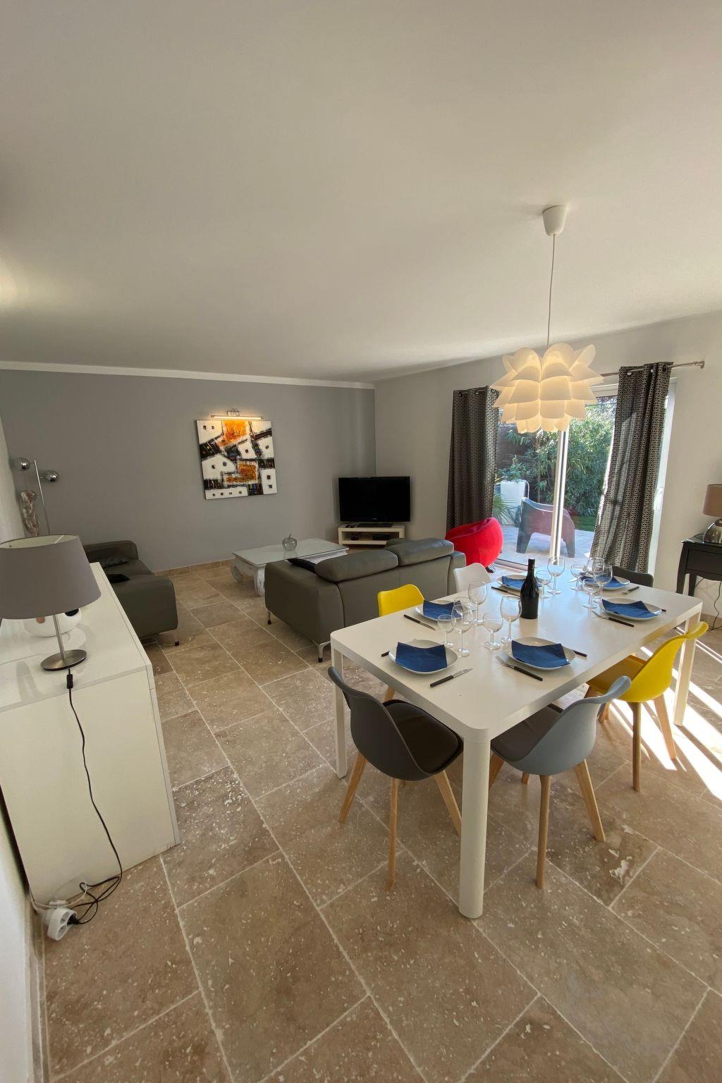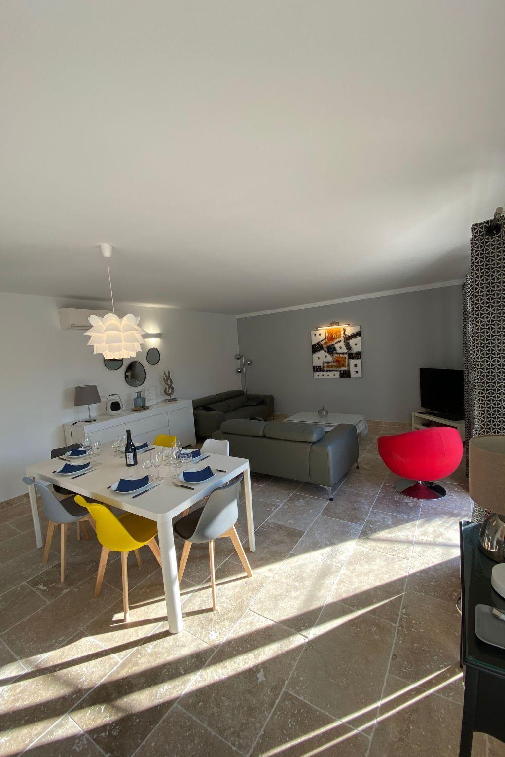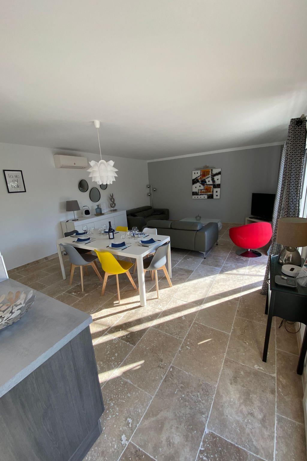 New 100 m2 ground-floor villa for 6 people: open-plan kitchen, dining/living room opening onto covered terrace and swimming pool, 1 master suite with shower and washbasin (160 cm double bed), 1 bedroom (160 cm double bed), 1 bedroom with 160 cm double bed, bathroom, air-conditioned villa in the day area (kitchen, dining room and living room).