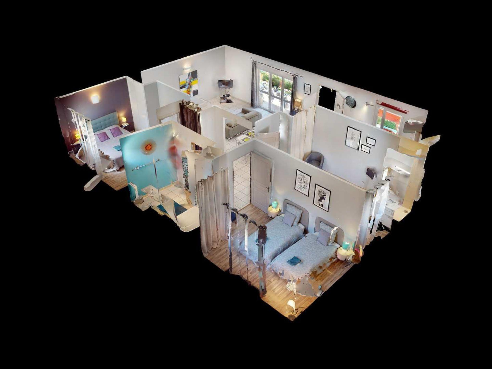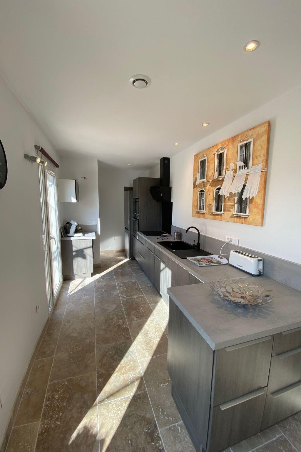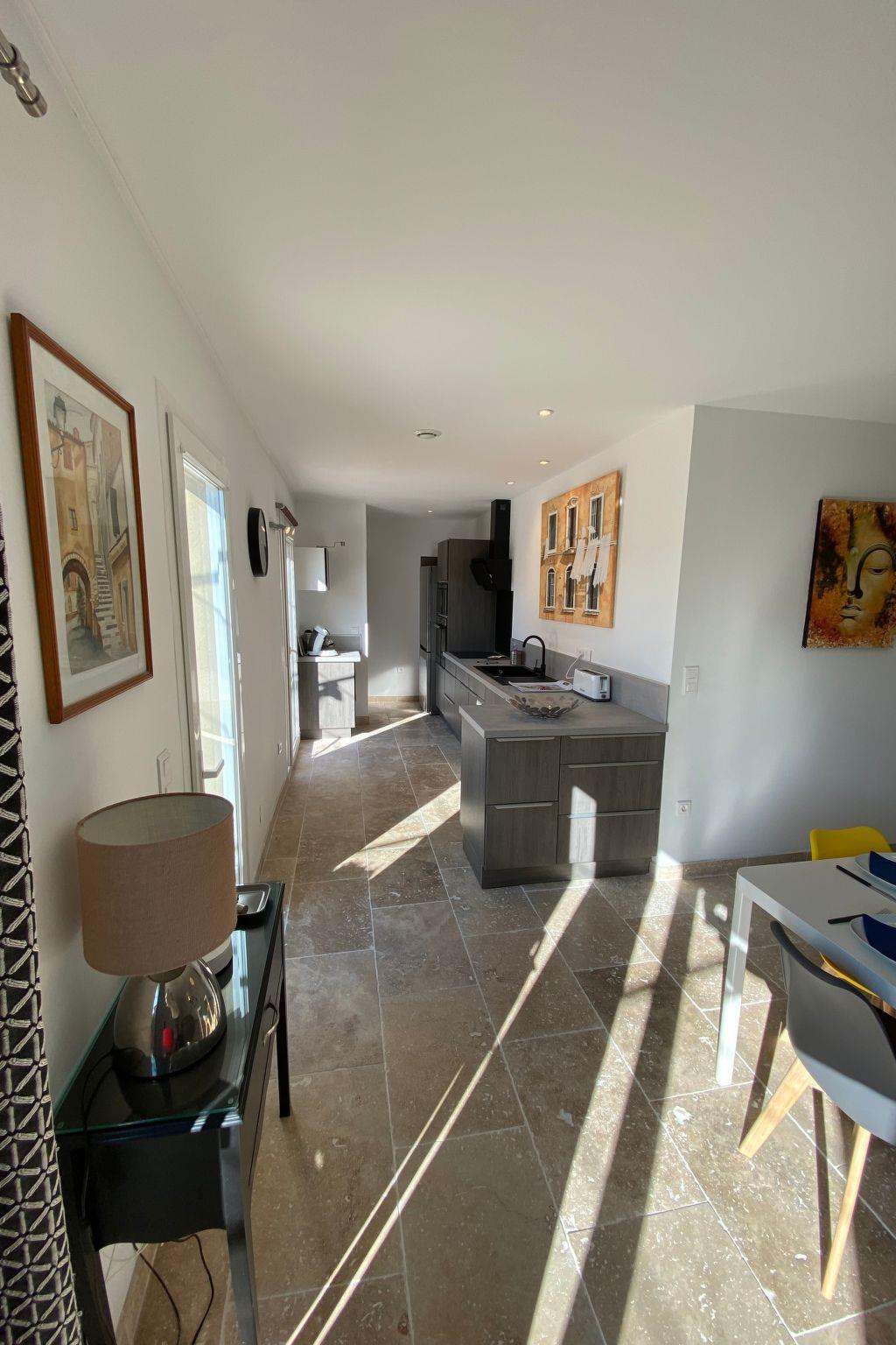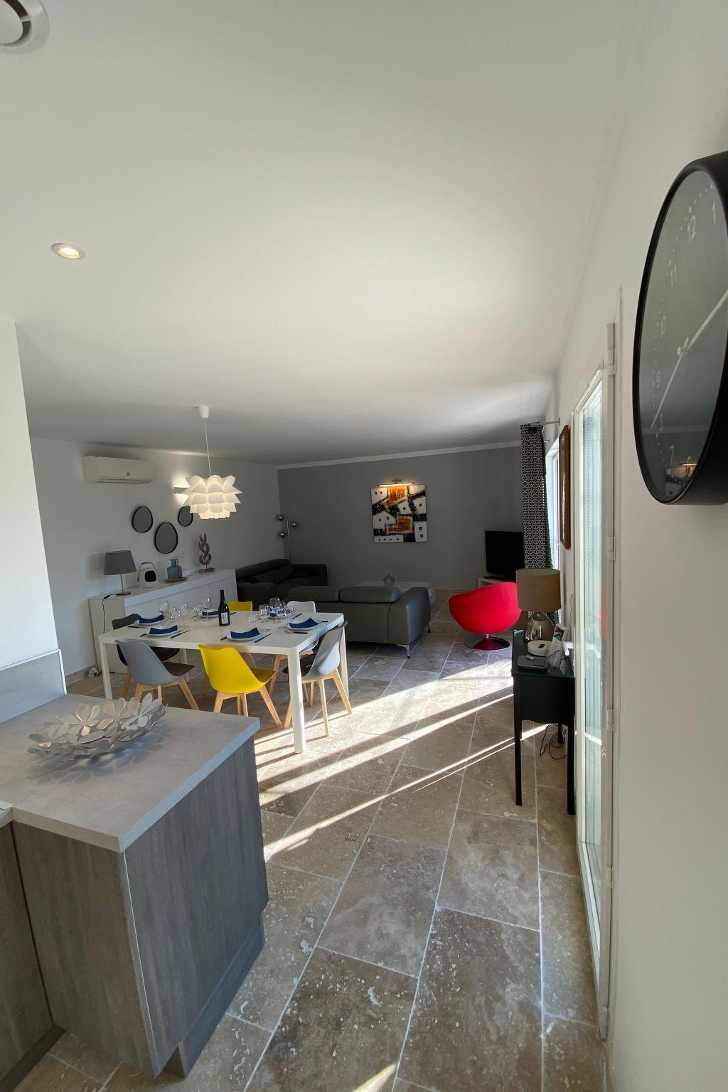 New 100 m2 ground-floor villa for 6 people: open-plan kitchen, dining/living room opening onto covered terrace and swimming pool, 1 master suite with shower and washbasin (160 cm double bed), 1 bedroom (160 cm double bed), 1 bedroom with 160 cm double bed, bathroom, air-conditioned villa in the day area (kitchen, dining room and living room).