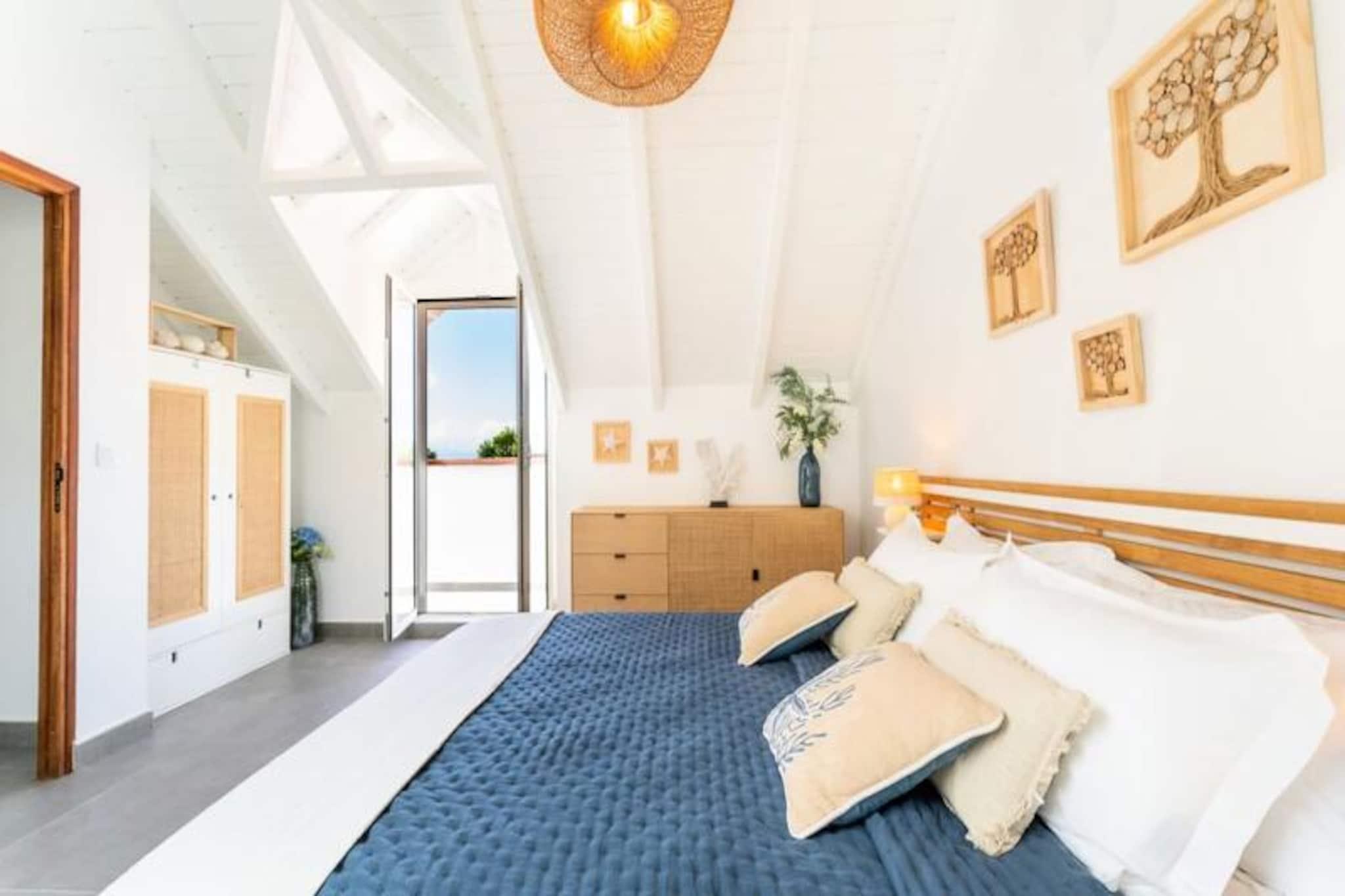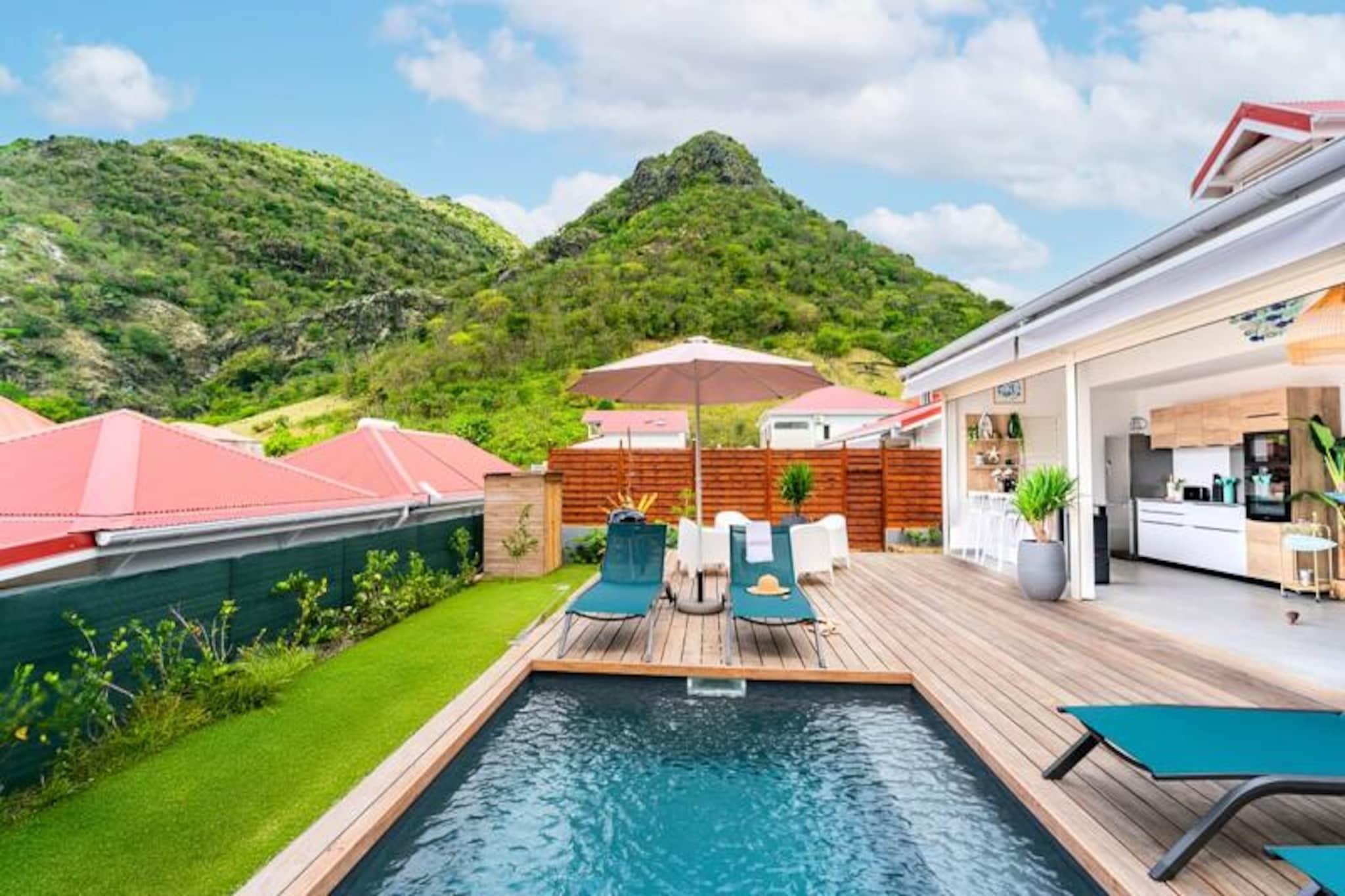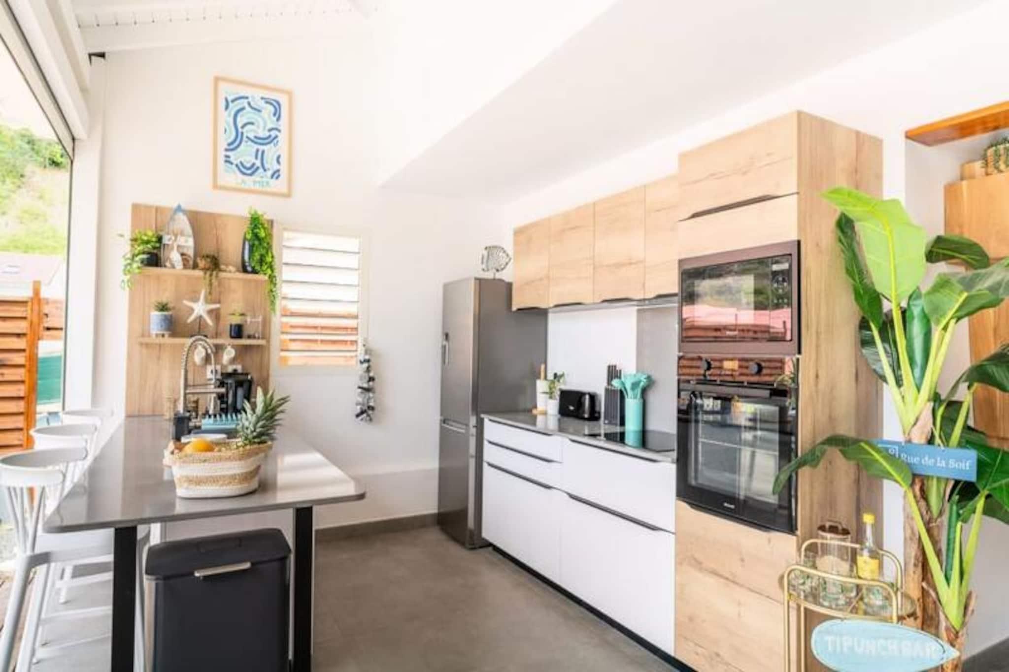 På den fortryllende ø Les Saintes tilbyder Villa Topaze en fredfyldt oase, hvor caribiske briser og moderne komfort smelter sammen. Beliggende på den maleriske Route de l'Anse Figuier i Terre-de-Haut er denne nybyggede villa en sand oase af fred. Kun en kort gåtur fra lokale butikker og restauranter tilbyder den de perfekte rammer for en idyllisk ferie omgivet af naturlig skønhed og ro. Villa Topaze er designet til at rumme op til seks gæster, med mulighed for to ekstra børn, og kan prale af tre soveværelser med aircondition, der alle er omhyggeligt indrettet for at inspirere til afslapning. Stueetagen har et soveværelse med eget badeværelse og bruseniche, mens ovenpå deler to ekstra soveværelser et stilfuldt badeværelse med bruseniche og separat toilet. Det fuldt udstyrede køkken åbner ud til en rummelig terrasse, hvor et spisebord til otte personer inviterer dig til at nyde måltider under den caribiske himmel. Udenfor skaber en privat saltvandspool, liggestole og en kulgrill det ultimative sted til afslapning med familie eller venner. Ud over villaen byder øen på uendelige eventyr. Udforsk det historiske Fort Napoleon, slap af på den uberørte sandstrand ved Pompierre-stranden, eller beundr det ikoniske Sukkertoppen. For vandentusiaster er \
