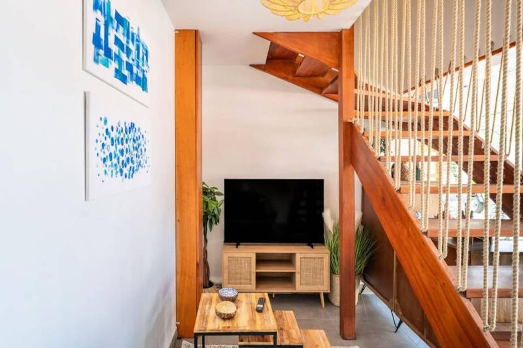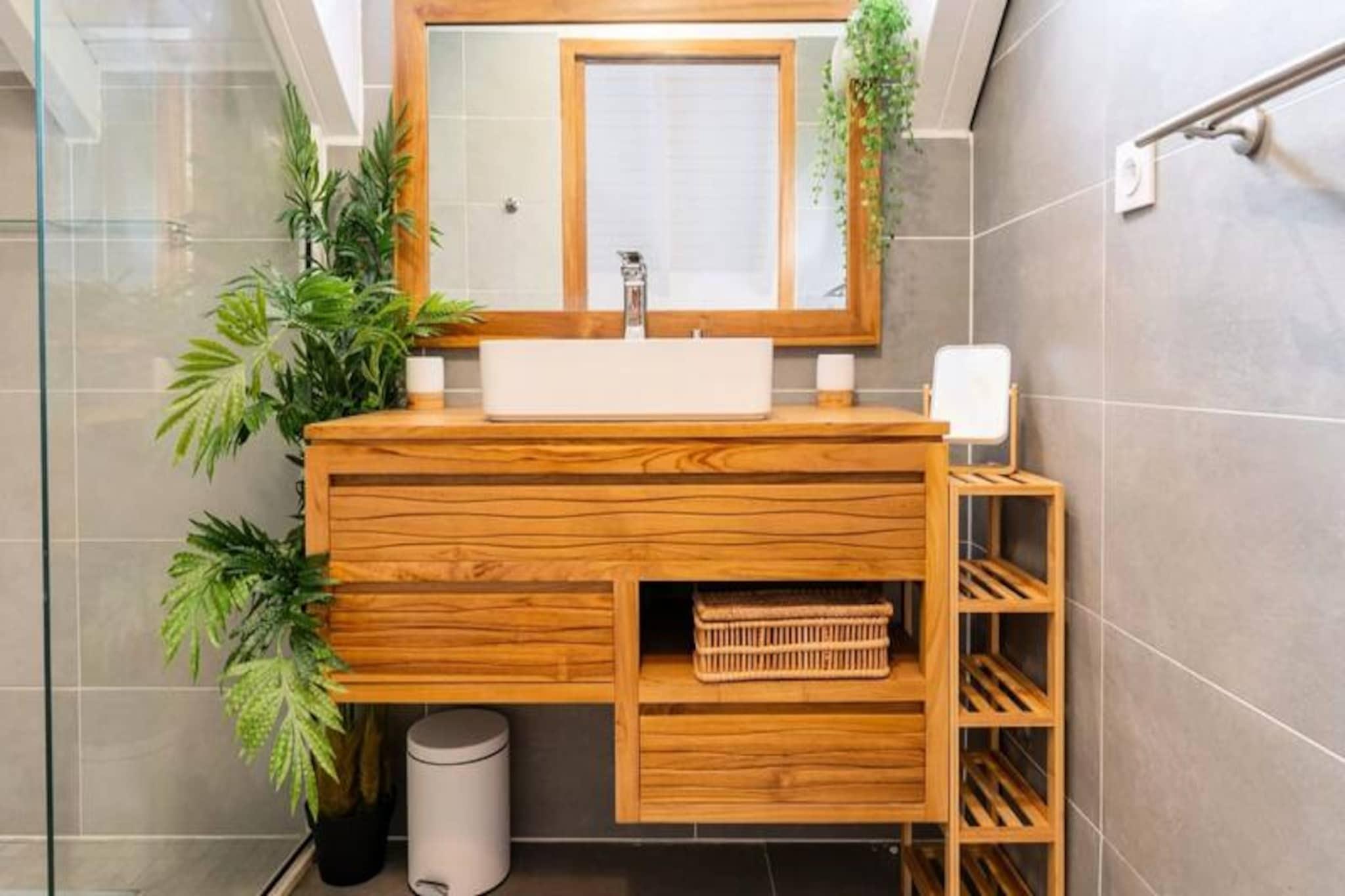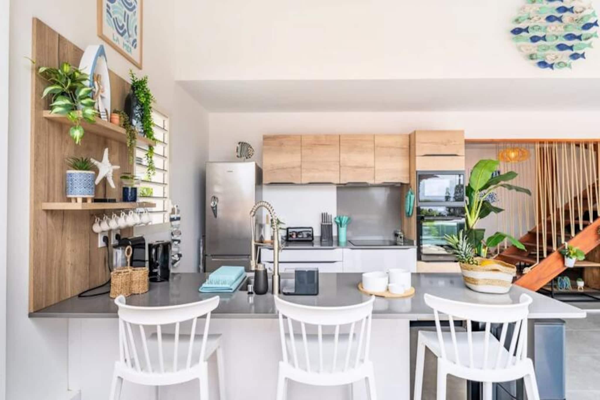 På den fortryllende ø Les Saintes tilbyder Villa Topaze en fredfyldt oase, hvor caribiske briser og moderne komfort smelter sammen. Beliggende på den maleriske Route de l'Anse Figuier i Terre-de-Haut er denne nybyggede villa en sand oase af fred. Kun en kort gåtur fra lokale butikker og restauranter tilbyder den de perfekte rammer for en idyllisk ferie omgivet af naturlig skønhed og ro. Villa Topaze er designet til at rumme op til seks gæster, med mulighed for to ekstra børn, og kan prale af tre soveværelser med aircondition, der alle er omhyggeligt indrettet for at inspirere til afslapning. Stueetagen har et soveværelse med eget badeværelse og bruseniche, mens ovenpå deler to ekstra soveværelser et stilfuldt badeværelse med bruseniche og separat toilet. Det fuldt udstyrede køkken åbner ud til en rummelig terrasse, hvor et spisebord til otte personer inviterer dig til at nyde måltider under den caribiske himmel. Udenfor skaber en privat saltvandspool, liggestole og en kulgrill det ultimative sted til afslapning med familie eller venner. Ud over villaen byder øen på uendelige eventyr. Udforsk det historiske Fort Napoleon, slap af på den uberørte sandstrand ved Pompierre-stranden, eller beundr det ikoniske Sukkertoppen. For vandentusiaster er \