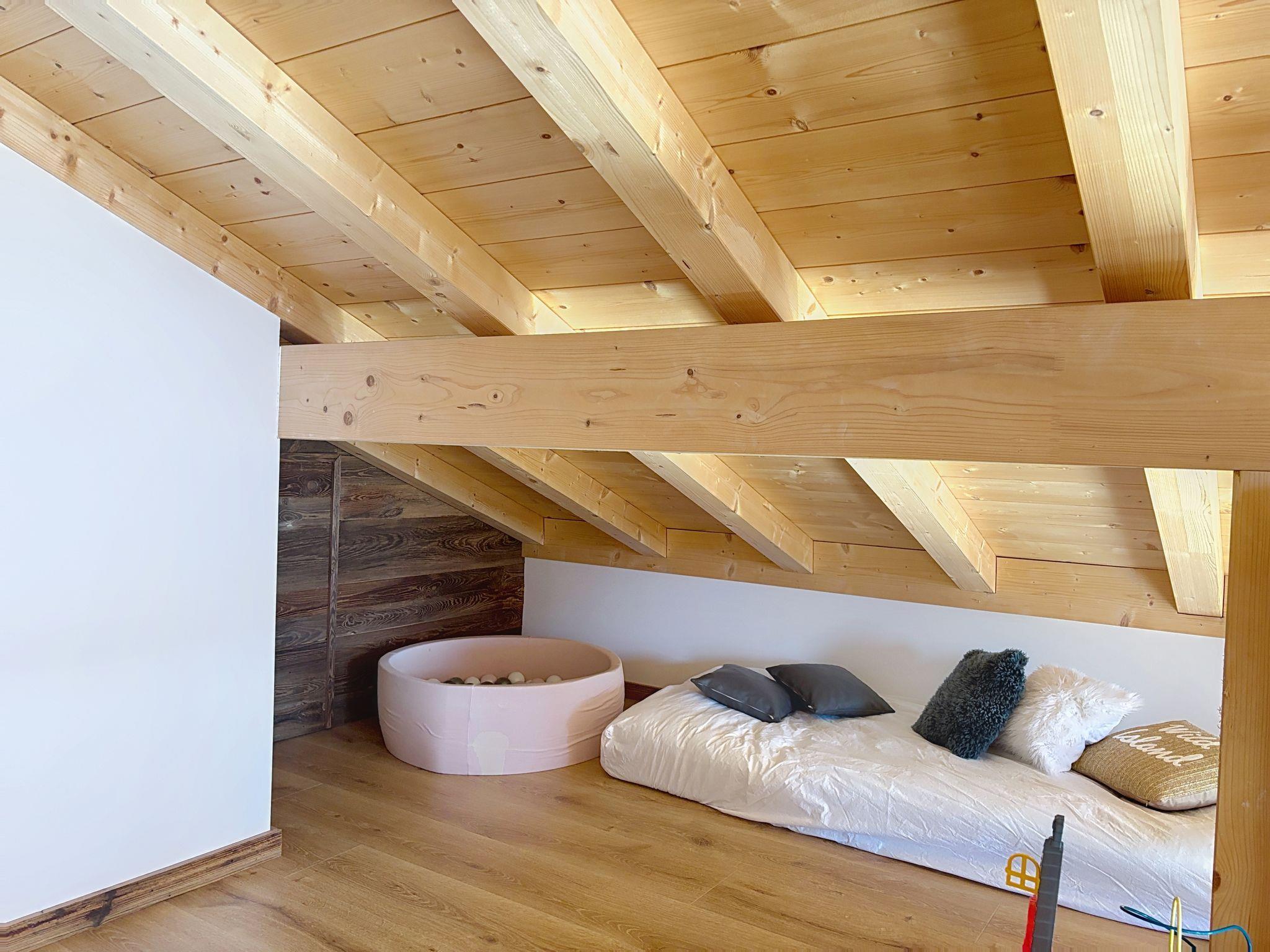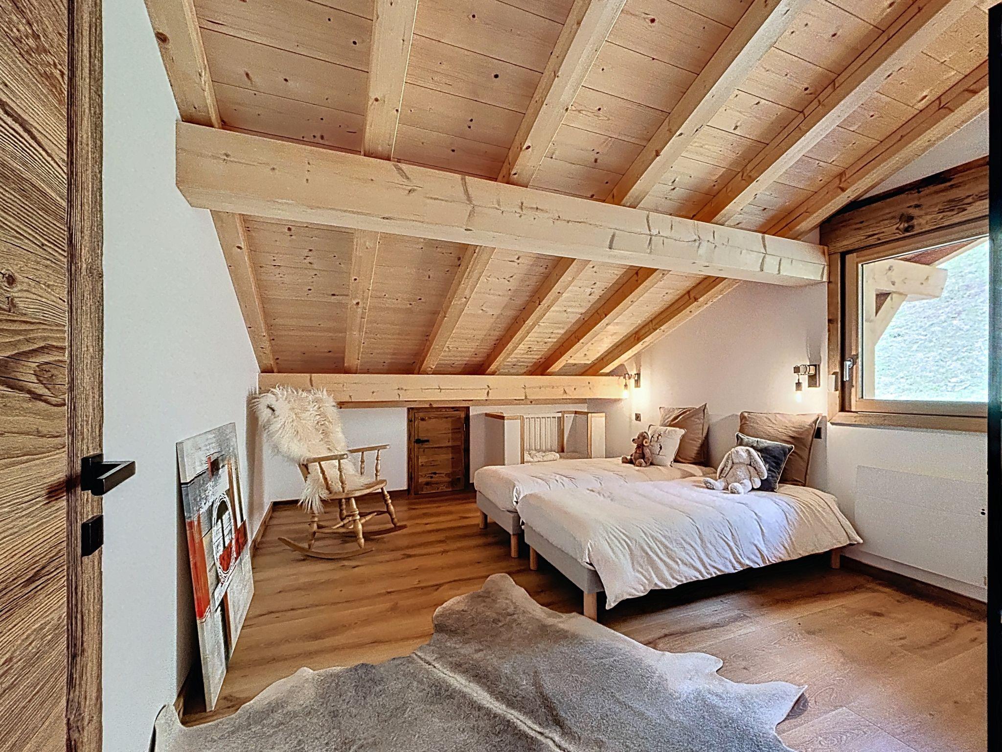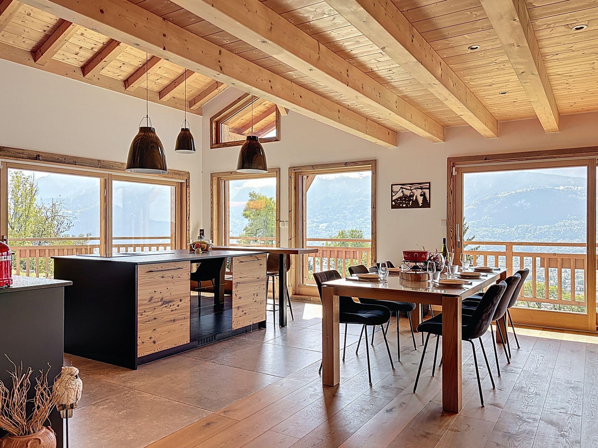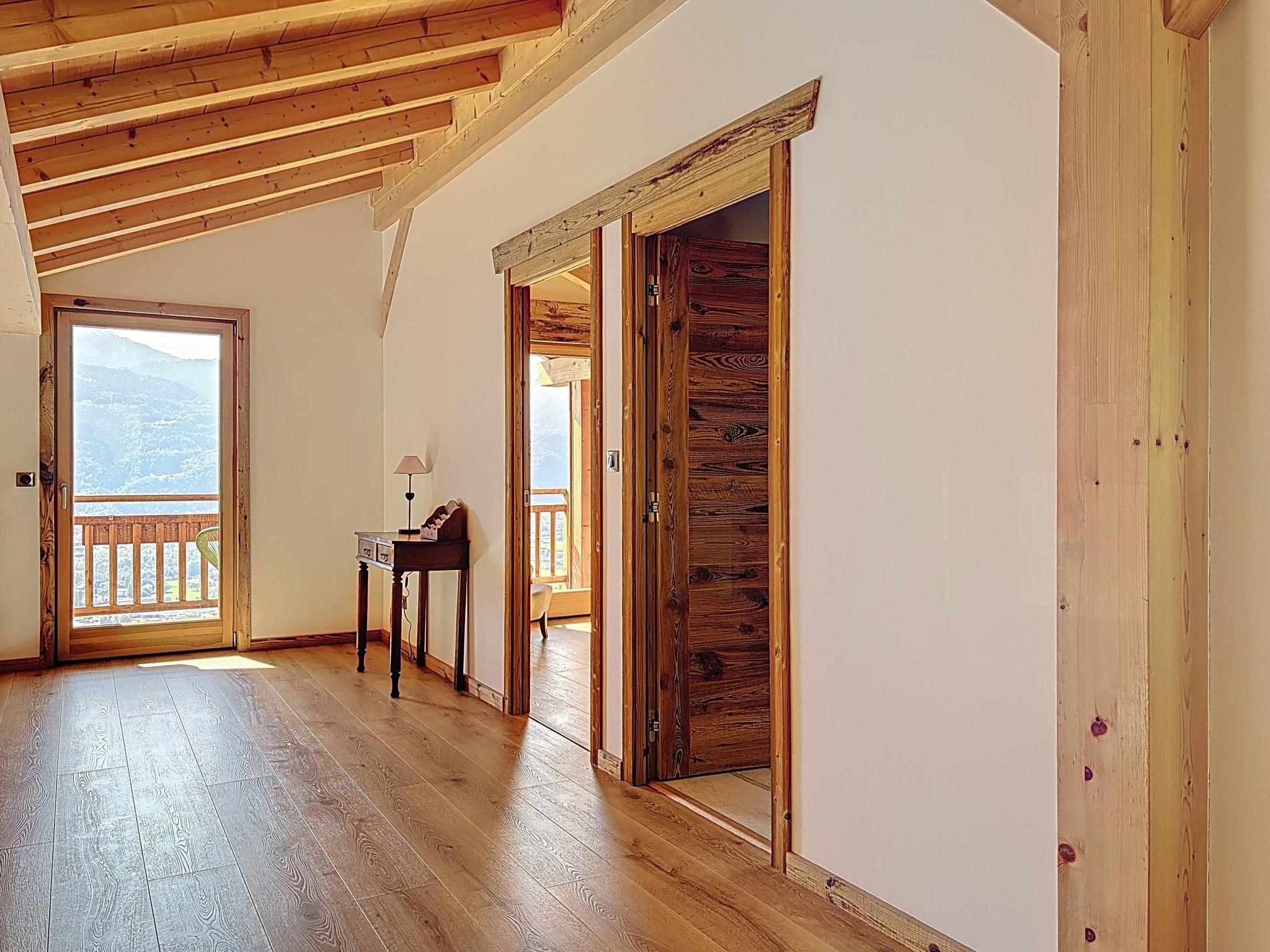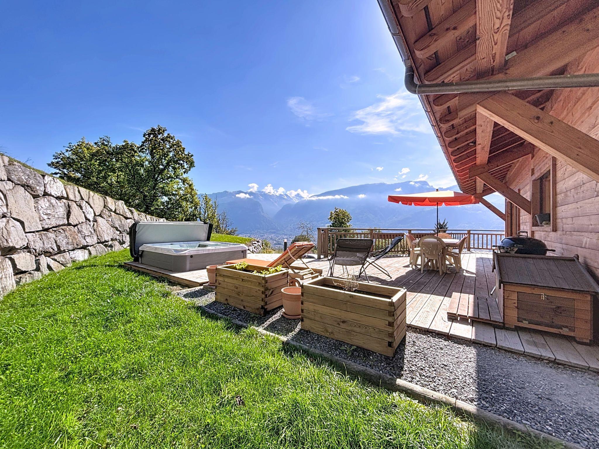 5-room chalet 180 m2 on 2 levels. Luxurious and tasteful furnishings: living/dining room with open-hearth fireplace, TV, Home cinema and electric shutters. Exit to the terrace, south-west facing position. 1 room with 1 double bed (160 cm, length 200 cm), shower. Exit to the garden. Large, open kitchen (dishwasher, 4 induction hot plates, toaster, kettle, electric coffee machine, Capsules for coffee machine (Nespresso) extra, raclette grill, cooking island, combination microwave, fondue Set (cheese)) with dining table. Sep. WC. Floor heating, boiler. On the lower ground floor: large entrance hall. Upper floor: gallery. 1 room with 1 double bed (160 cm, length 200 cm). 1 room with 1 double bed (160 cm, length 200 cm). Bath/shower, sep. WC. Large terrace 10 m2, south-west facing position. Terrace furniture, barbecue. Very beautiful panoramic view of the mountains and the valley. Facilities: washing machine, dryer, safe, iron, children's high chair, baby cot, hair dryer. Internet (WiFi, free). Garage (2 cars). Please note: non-smokers only. Smoke alarm, no lift. Outdoor hot tub on the terrace. Offer by a private individual according to Art. 155, IV of CGI.