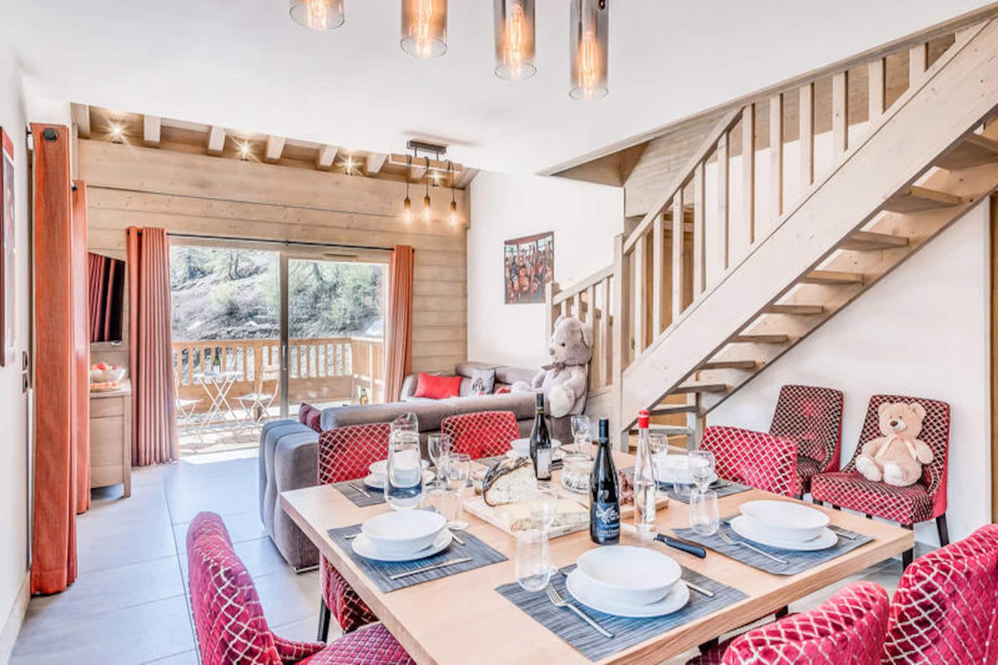 Højt over de fredfyldte alpine landskaber i Tignes 1800 tilbyder denne luksuriøse duplexlejlighed et uovertruffent tilflugtssted for bjergentusiaster. Med en betagende udsigt over Mont Blanc-massivet og direkte adgang til pisterne via Boisses-svævebanen begynder dit alpine eventyr i det øjeblik, du træder udenfor. Selve landsbyen er badet i morgensolen, hvilket skaber en varm og indbydende atmosfære, der perfekt komplementerer charmen ved dens skiskole, restauranter og butikker. Uanset om du er her for at grave dig gennem frisk puddersne eller udforske de livlige sommerløjper, placerer denne bolig dig i hjertet af det hele. \n\nLejligheden strækker sig over to rummelige etager og har komfortabel plads til op til otte gæster, hvilket gør den ideel til familier eller grupper. Første sal har en hyggelig opholdsstue med sovesofa, lænestole og et fladskærms-tv, alt sammen indrammet af et stort karnapvindue, der åbner ud til en møbleret balkon. Det fuldt udstyrede køkken er et paradis for kulinariske entusiaster, komplet med moderne apparater som en Nespresso-maskine og en opvaskemaskine. Ovenpå finder du tre smukt indrettede soveværelser, herunder en master suite med en dobbeltseng og rigelig opbevaringsplads. To badeværelser, gulvvarme og gennemtænkte detaljer som et skiskab med støvlevarmere sikrer maksimal komfort under dit ophold.\n\nGæsterne har også eksklusiv adgang til boligens afslapningsområde, som omfatter en indendørs opvarmet pool, et børnebassin, et konditionstræningsrum og en luksuriøs spa med jacuzzi, sauna og hammam. For ekstra forkælelse er\