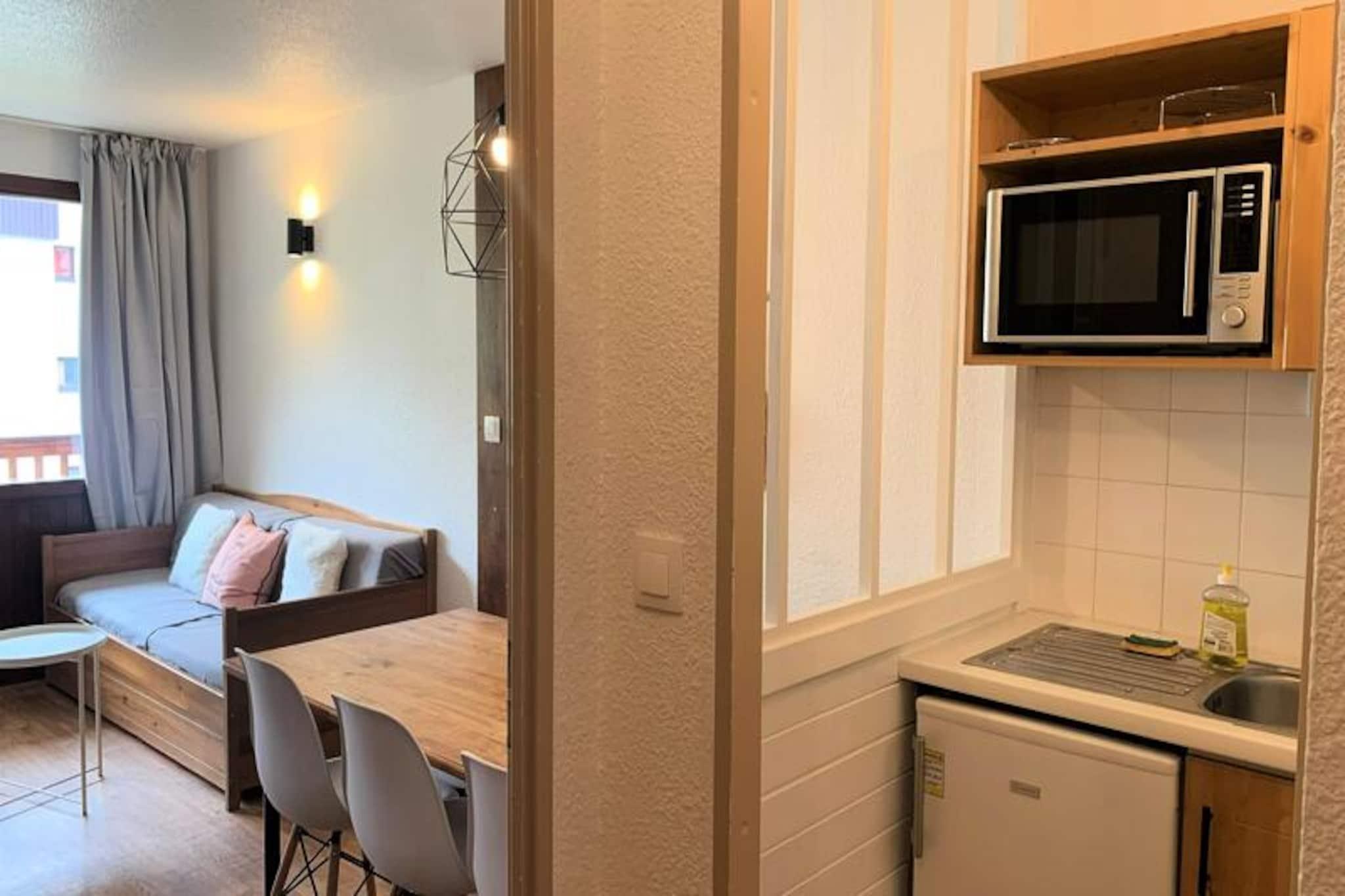 Højt over det travle hjerte af Tignes Val Claret tilbyder denne charmerende alpelejlighed en førsteplads til pisterne og de franske alpers fredfyldte skønhed. Med sin sydvendte balkon kan gæsterne nyde den friske bjergluft og beundre de sneklædte udsigter, der strækker sig uendeligt foran dem. Uanset om du er her for spændende vintereventyr eller sommerlige alpeferier, lover denne bolig et uforglemmeligt tilflugtssted. Beliggende lige overfor ESF-børnehaven og skiskolens mødesteder er den ideel for både familier og skientusiaster. Butikker, herunder et bageri, en sportsbutik og et minimarked, er bekvemt placeret for foden af ??boligen, hvilket sikrer, at alt hvad du behøver er kun få skridt væk. Indenfor er lejligheden omhyggeligt designet til at rumme op til seks gæster. Stuen har en hyggelig udtræksseng og et tv til afslappende aftener efter en dag på pisterne. Køkkenet er veludstyret med komfur, mikrobølgeovn og opvaskemaskine, hvilket gør madlavning til en leg. En hyggelig krog med en køjeseng og et separat soveværelse med en dobbeltseng giver komfortable sovepladser til alle. Badeværelset og det separate toilet bidrager til bekvemmeligheden, mens den sydvendte balkon inviterer dig til at starte dine morgener med en betagende udsigt. Vintergæster vil sætte pris på ski-in/ski-out-adgangen, der giver ubesværet adgang til de uberørte pister i Tignes og Val d'Isère. Om sommeren låser My Tignes-kortet op for en verden af ??aktiviteter, fra mountainbiking til vandsport, hvilket sikrer, at hver dag er fyldt med eventyr. Parkering er reguleret om vinteren, og bureauet er tilgængeligt for at hjælpe med reservationer. Uanset om du søger adrenalinpumpende skidage eller rolige sommervandreture, er denne lejlighed din port til vidunderne i Tignes Val Claret. Med sin uovertrufne beliggenhed og hyggelige faciliteter er det den perfekte alpine flugt for familier, par og venner.