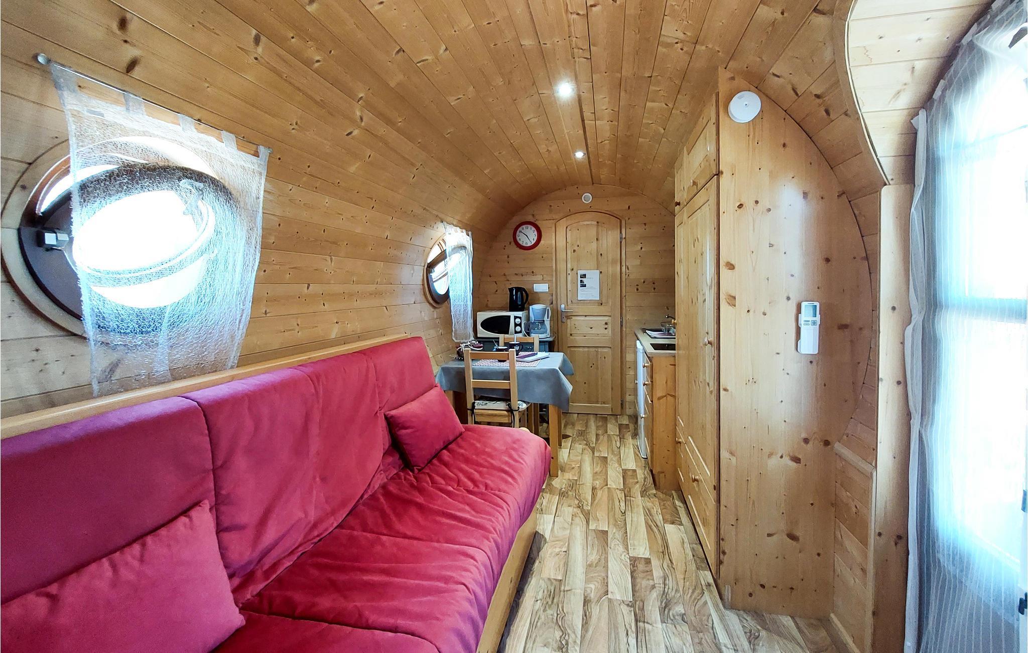 Dette hyggelige feriehus ligger i idylliske, landlige omgivelser. I det indre af det tøndeformede hus finder I et komfortabelt indrettet anlæg med skønne detaljer som de flotte vinduer eller den hyggelige alkove, der skaber en meget stemningsfuld ramme om jeres ferie. At bo her er en oplevelse i sig selv!