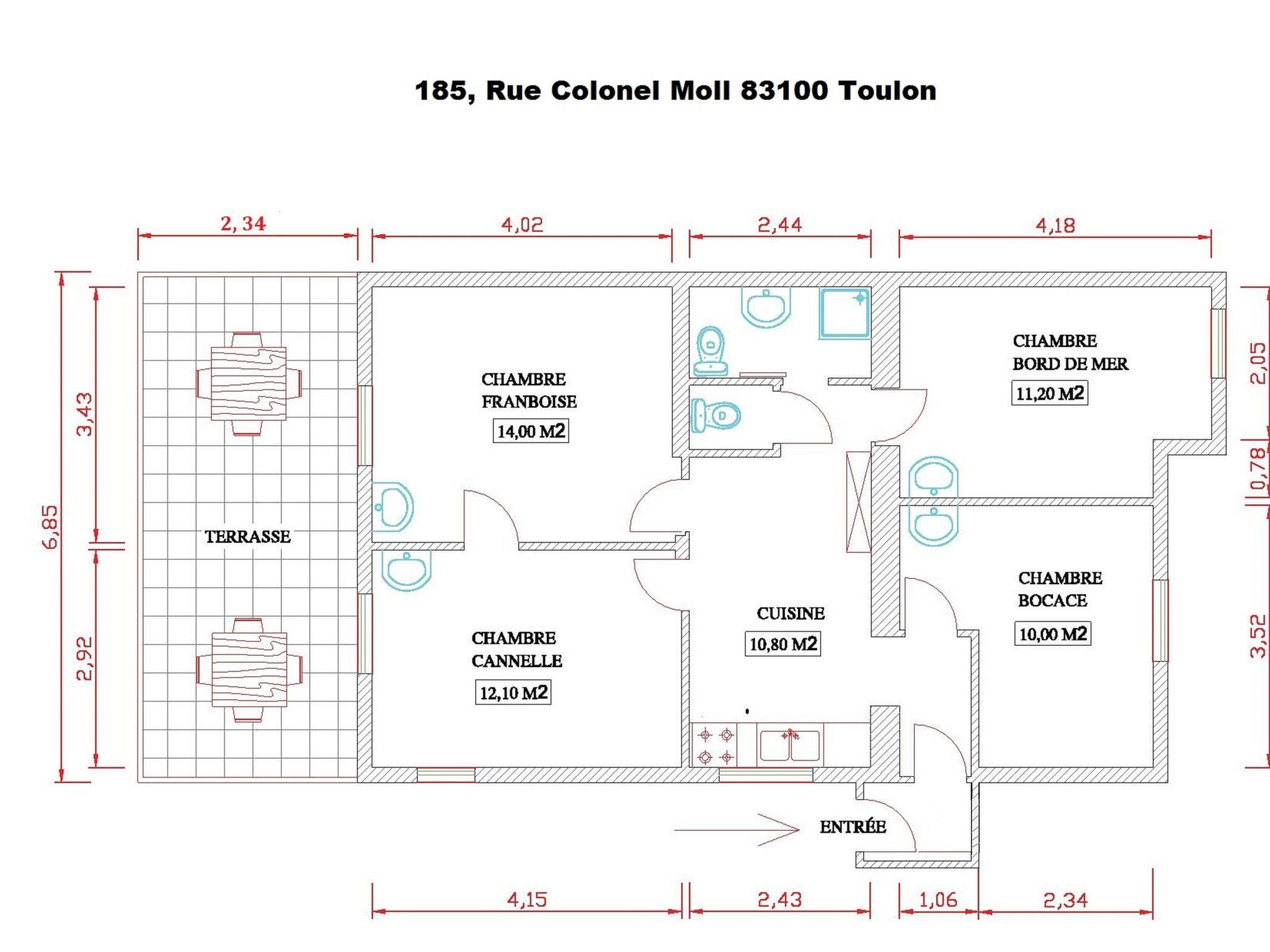 There are two WCs, four bedrooms, a shower, five washbasins (one in each bedroom and one in the shower room), a kitchen and a terrace.