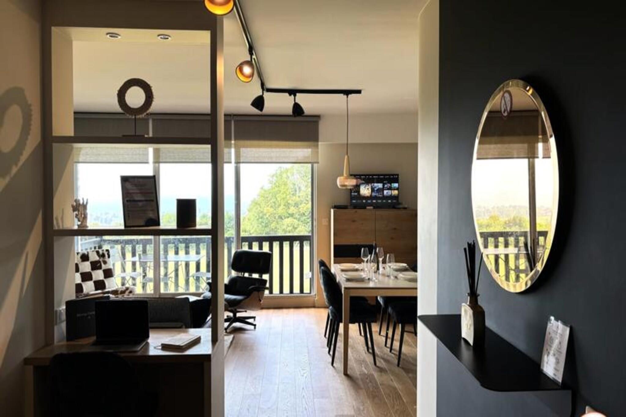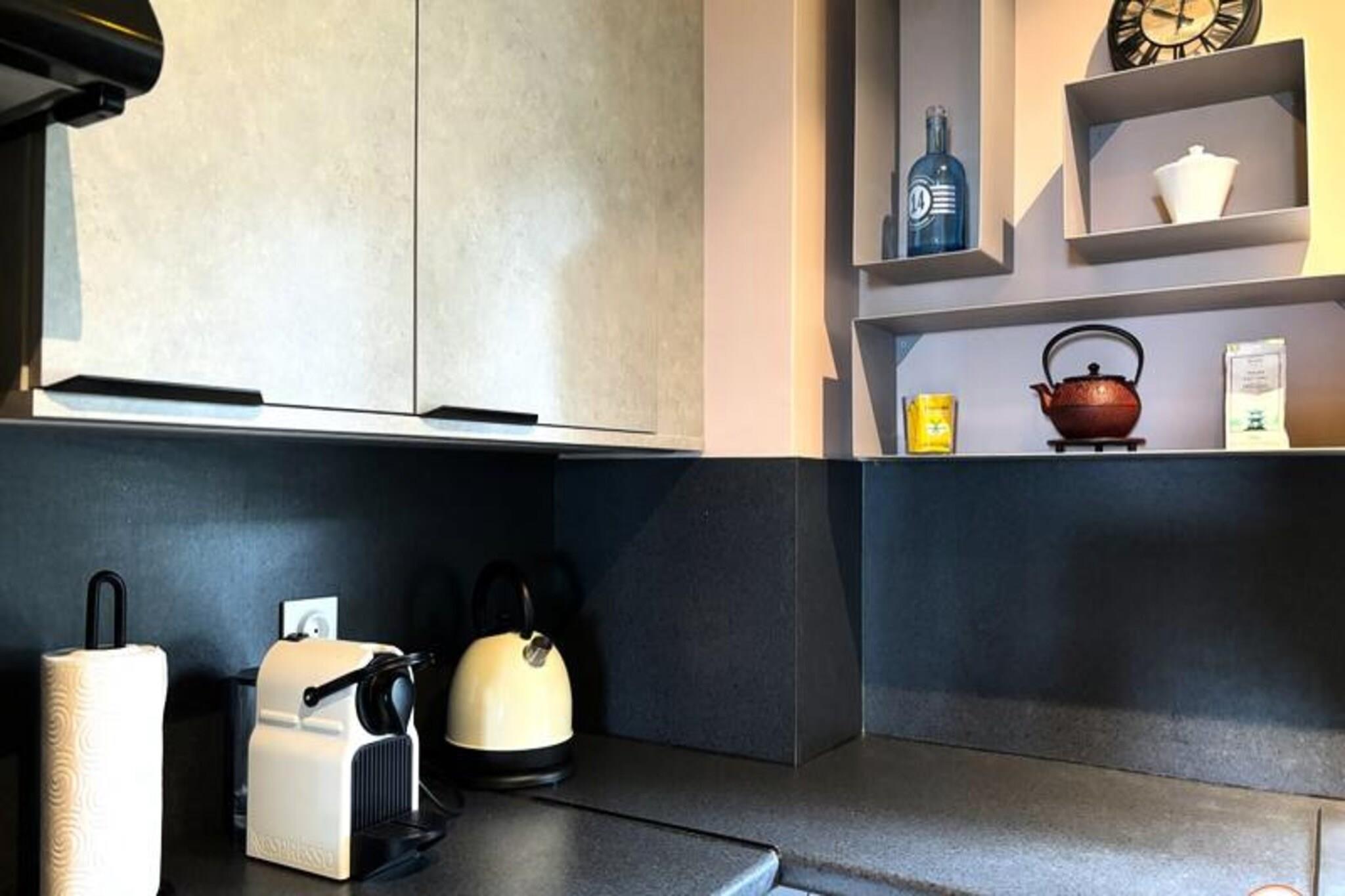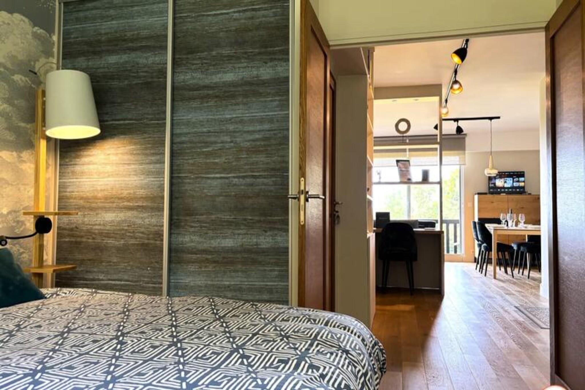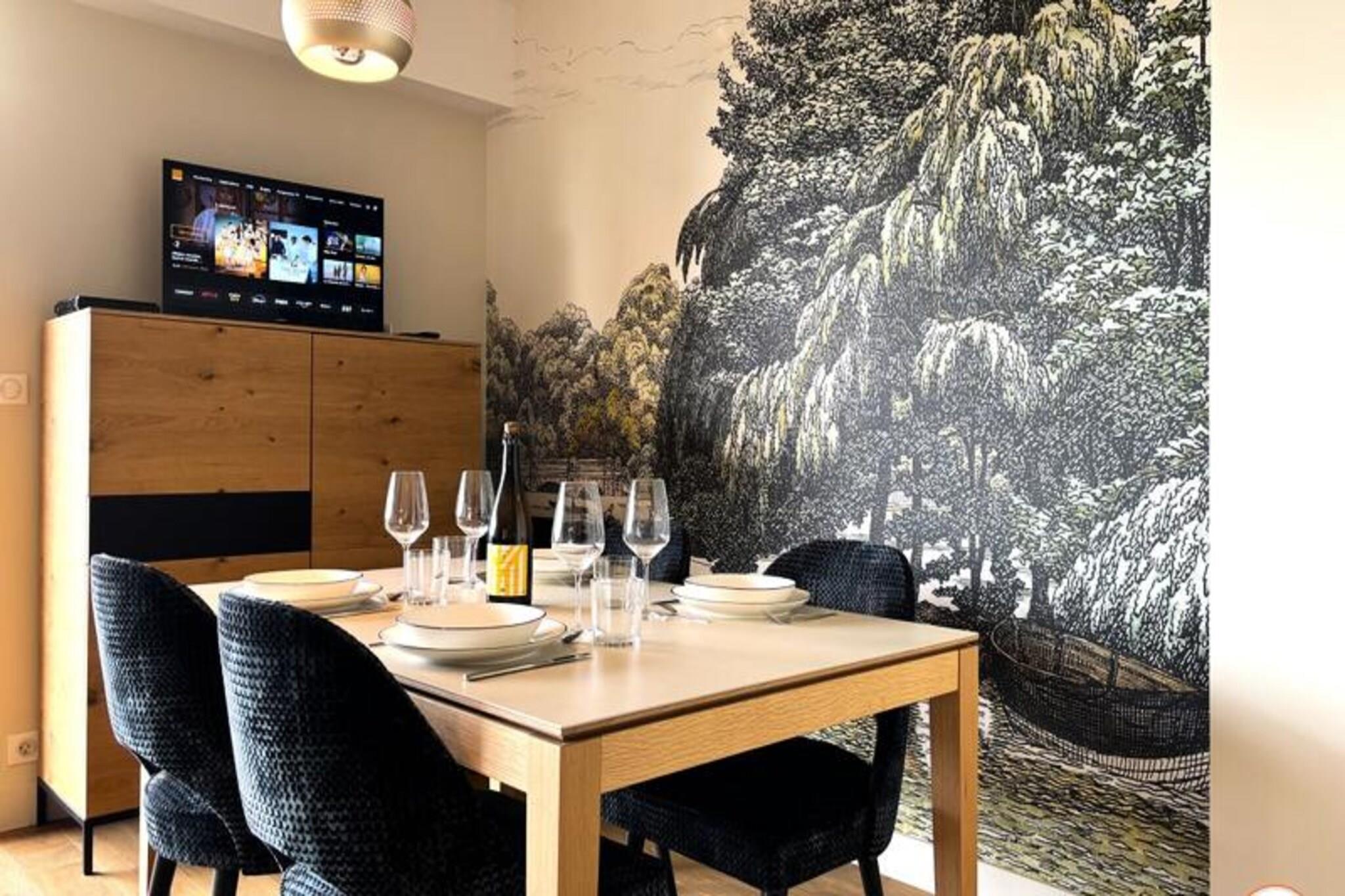 Denne luksuri?se lejlighed tilbyder et ideelt tilflugtssted for par med en maksimal kapacitet p? 2 personer. Det har en rummelig stue med en lys og indbydende atmosf?re, der tilbyder en fantastisk havudsigt over feriestedet Deauville. Sovev?relset har en komfortabel kingsize seng (180x200 cm) og et p?kl?dningsv?relse, mens badev?relset er udstyret med en stilfuld bruser i italiensk stil. Senge- og h?ndkl?der leveres, og lejligheden har gratis tr?dl?s internetadgang. Selvom k?ledyr ikke er specificeret, b?r g?ster forh?re sig om k?ledyrspolitikker ved reservation. Lejligheden er perfekt beliggende, kun en kort g?tur (15 minutter) fra det ber?mte Deauville Casino og kun 5 minutter i bil fra byens pulserende centrum. Golfentusiaster vil s?tte pris p? dets n?rhed til Golf Barri?re, mens de n?rliggende strande og charmerende butikker g?r det nemt at udforske de lokale attraktioner. Lejligheden tilbyder ogs? nem adgang til regionens fantastiske kystlandskaber og historiske steder. For ekstra bekvemmelighed inkluderer lejligheden et fuldt udstyret uafh?ngigt k?kken med moderne apparater s?som en ovn, induktionskomfur, opvaskemaskine, vaskemaskine og Nespresso-maskine. Badev?relset har en bruser i italiensk stil, og der er separate toiletfaciliteter. Den private balkon/terrasse er perfekt til at spise under ?ben himmel, og en udend?rs parkeringsplads tilbydes gratis for g?sternes bekvemmelighed.