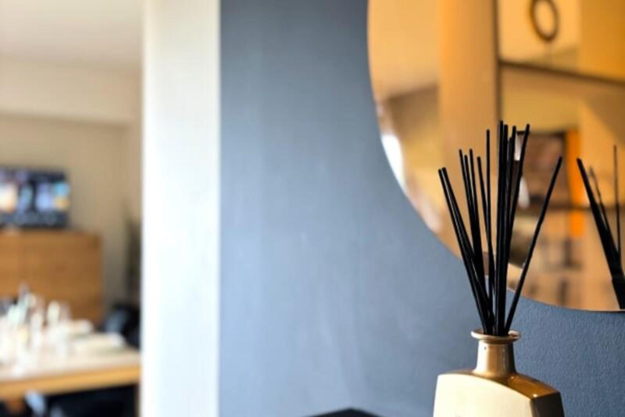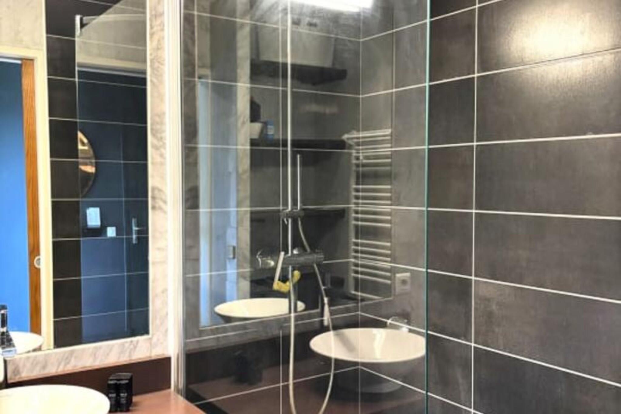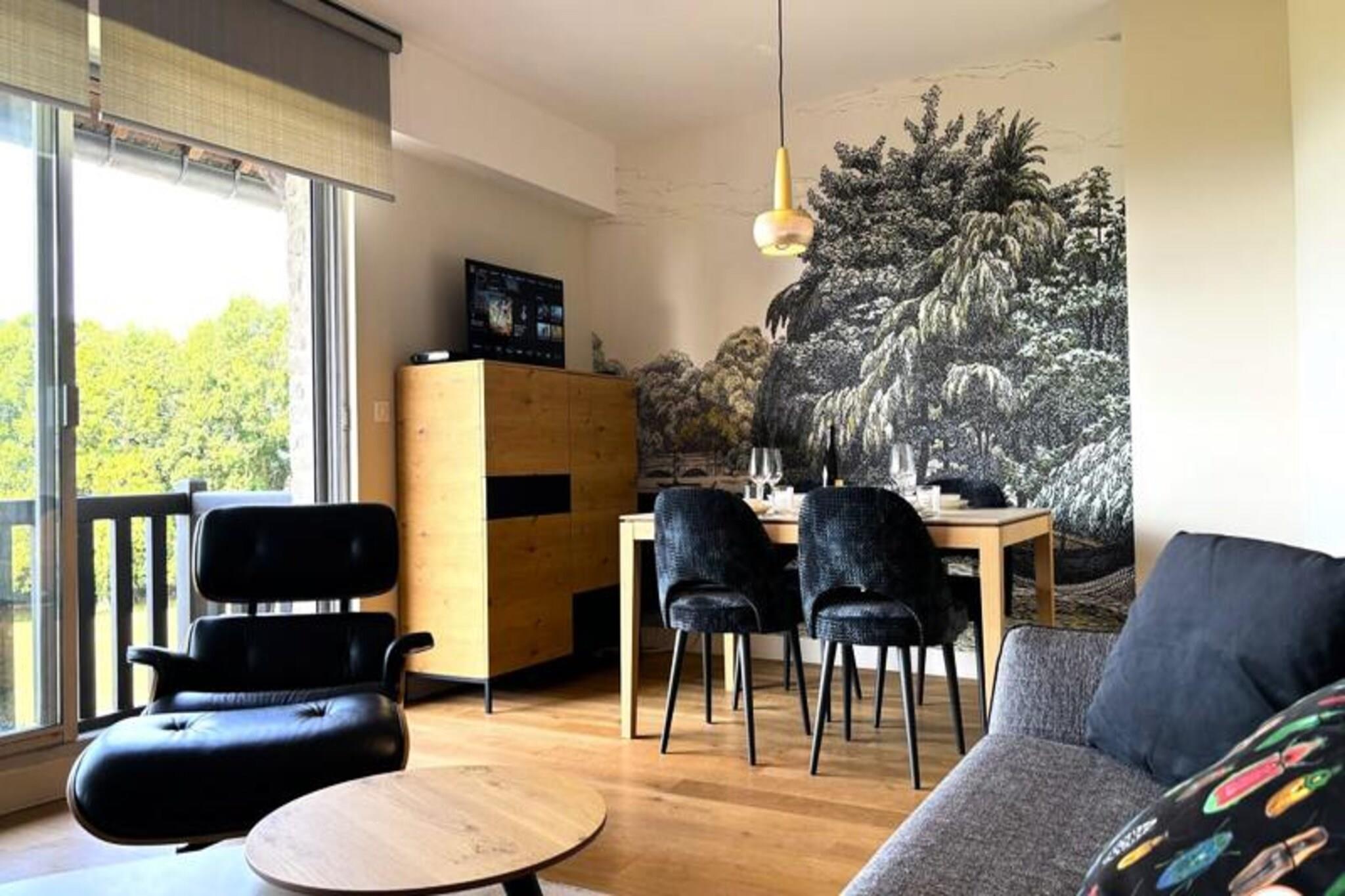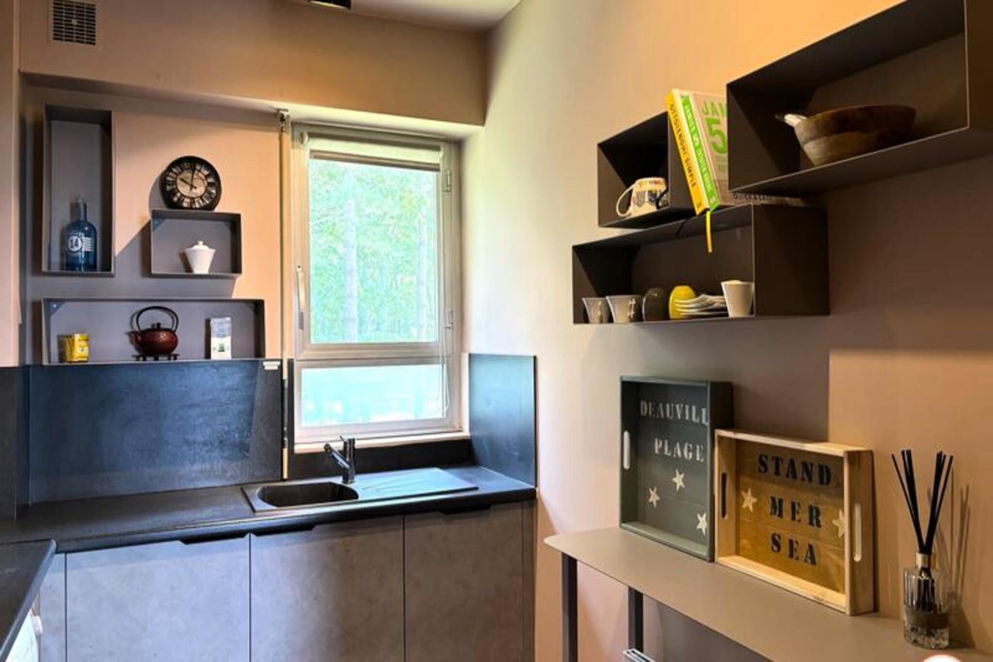 Denne luksuri?se lejlighed tilbyder et ideelt tilflugtssted for par med en maksimal kapacitet p? 2 personer. Det har en rummelig stue med en lys og indbydende atmosf?re, der tilbyder en fantastisk havudsigt over feriestedet Deauville. Sovev?relset har en komfortabel kingsize seng (180x200 cm) og et p?kl?dningsv?relse, mens badev?relset er udstyret med en stilfuld bruser i italiensk stil. Senge- og h?ndkl?der leveres, og lejligheden har gratis tr?dl?s internetadgang. Selvom k?ledyr ikke er specificeret, b?r g?ster forh?re sig om k?ledyrspolitikker ved reservation. Lejligheden er perfekt beliggende, kun en kort g?tur (15 minutter) fra det ber?mte Deauville Casino og kun 5 minutter i bil fra byens pulserende centrum. Golfentusiaster vil s?tte pris p? dets n?rhed til Golf Barri?re, mens de n?rliggende strande og charmerende butikker g?r det nemt at udforske de lokale attraktioner. Lejligheden tilbyder ogs? nem adgang til regionens fantastiske kystlandskaber og historiske steder. For ekstra bekvemmelighed inkluderer lejligheden et fuldt udstyret uafh?ngigt k?kken med moderne apparater s?som en ovn, induktionskomfur, opvaskemaskine, vaskemaskine og Nespresso-maskine. Badev?relset har en bruser i italiensk stil, og der er separate toiletfaciliteter. Den private balkon/terrasse er perfekt til at spise under ?ben himmel, og en udend?rs parkeringsplads tilbydes gratis for g?sternes bekvemmelighed.