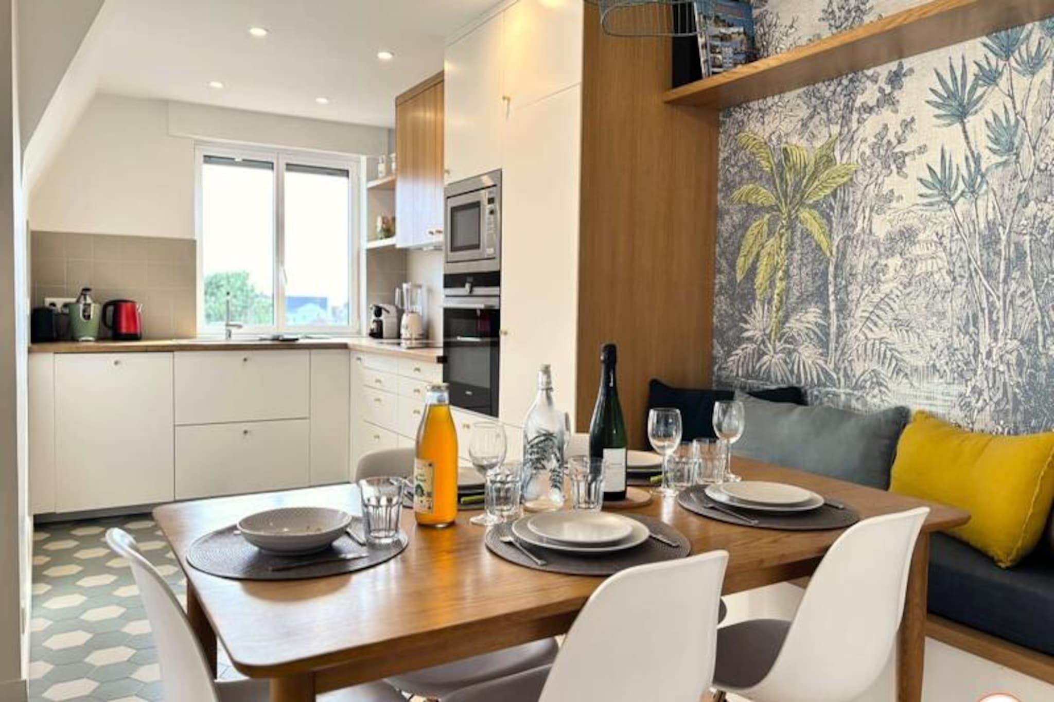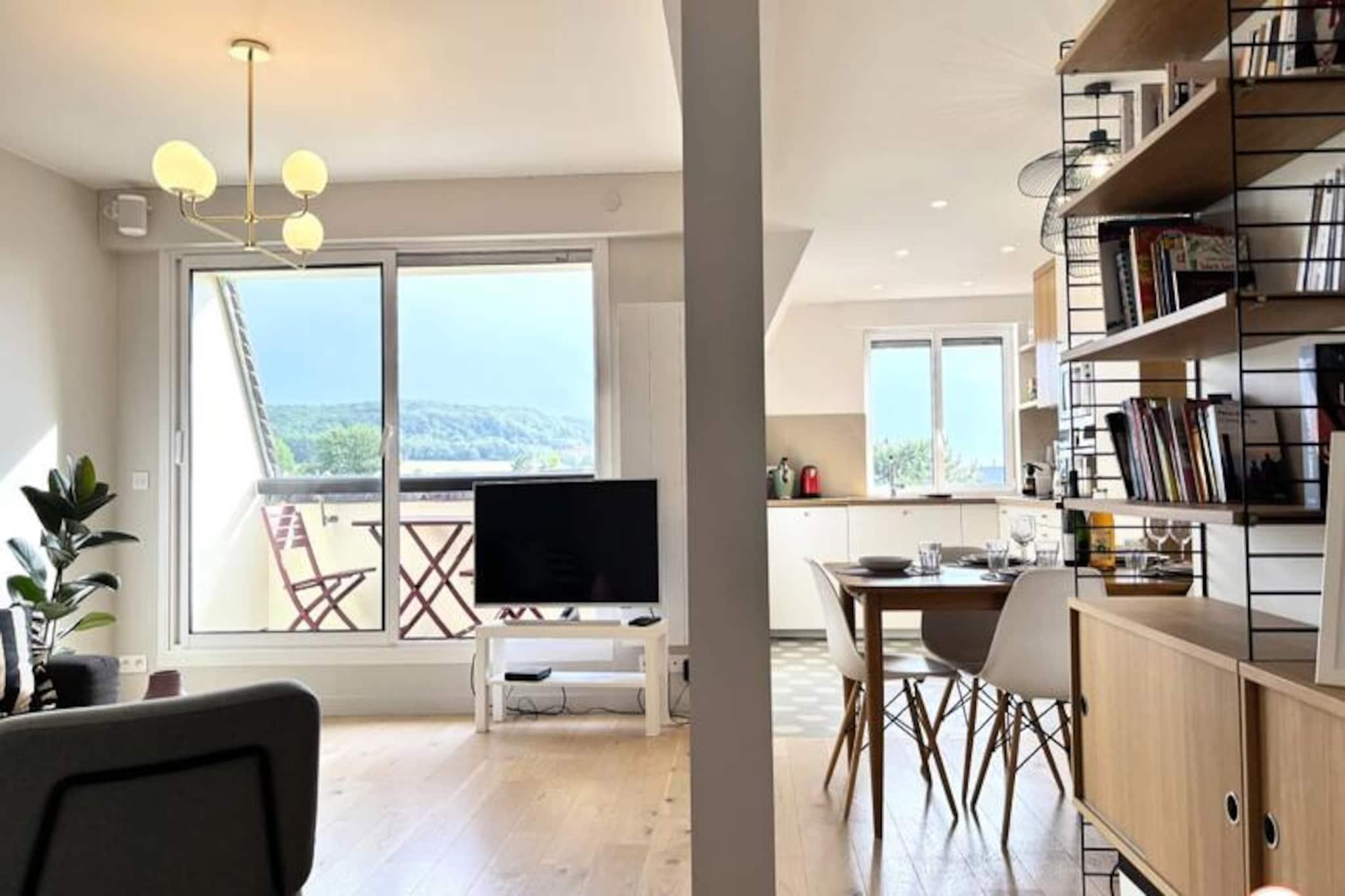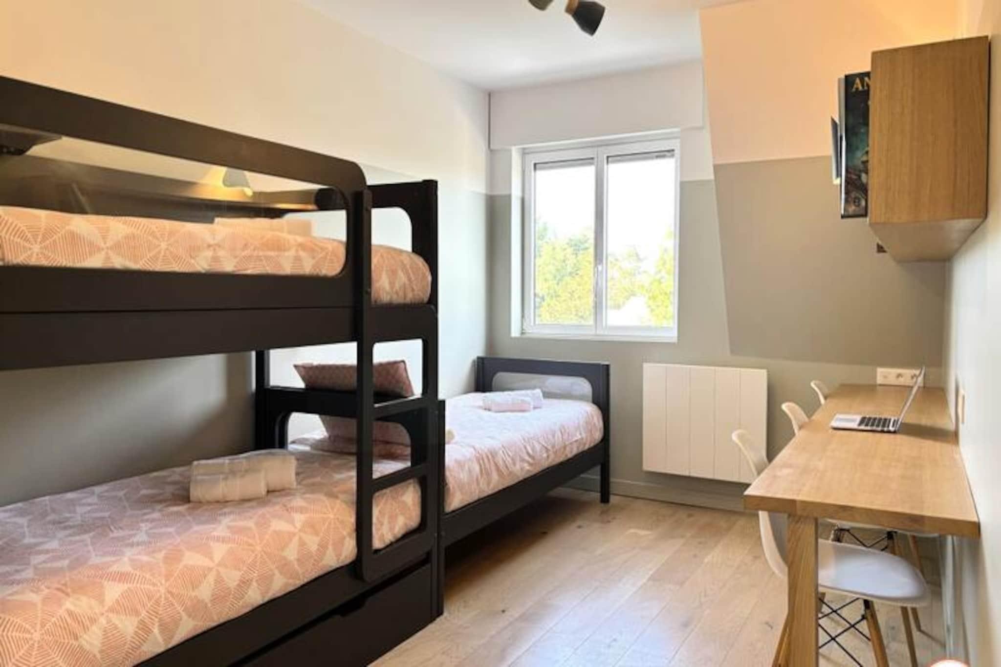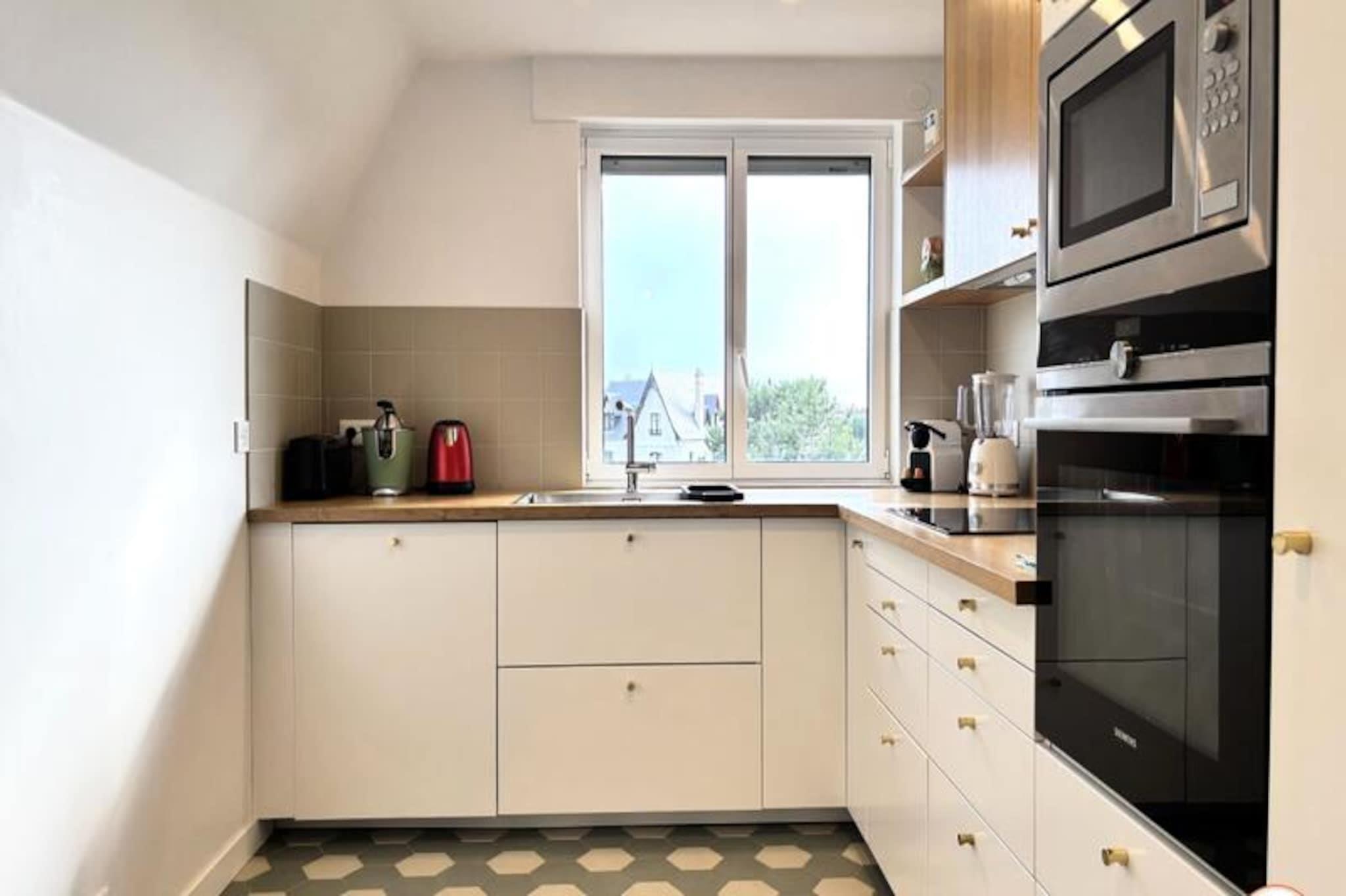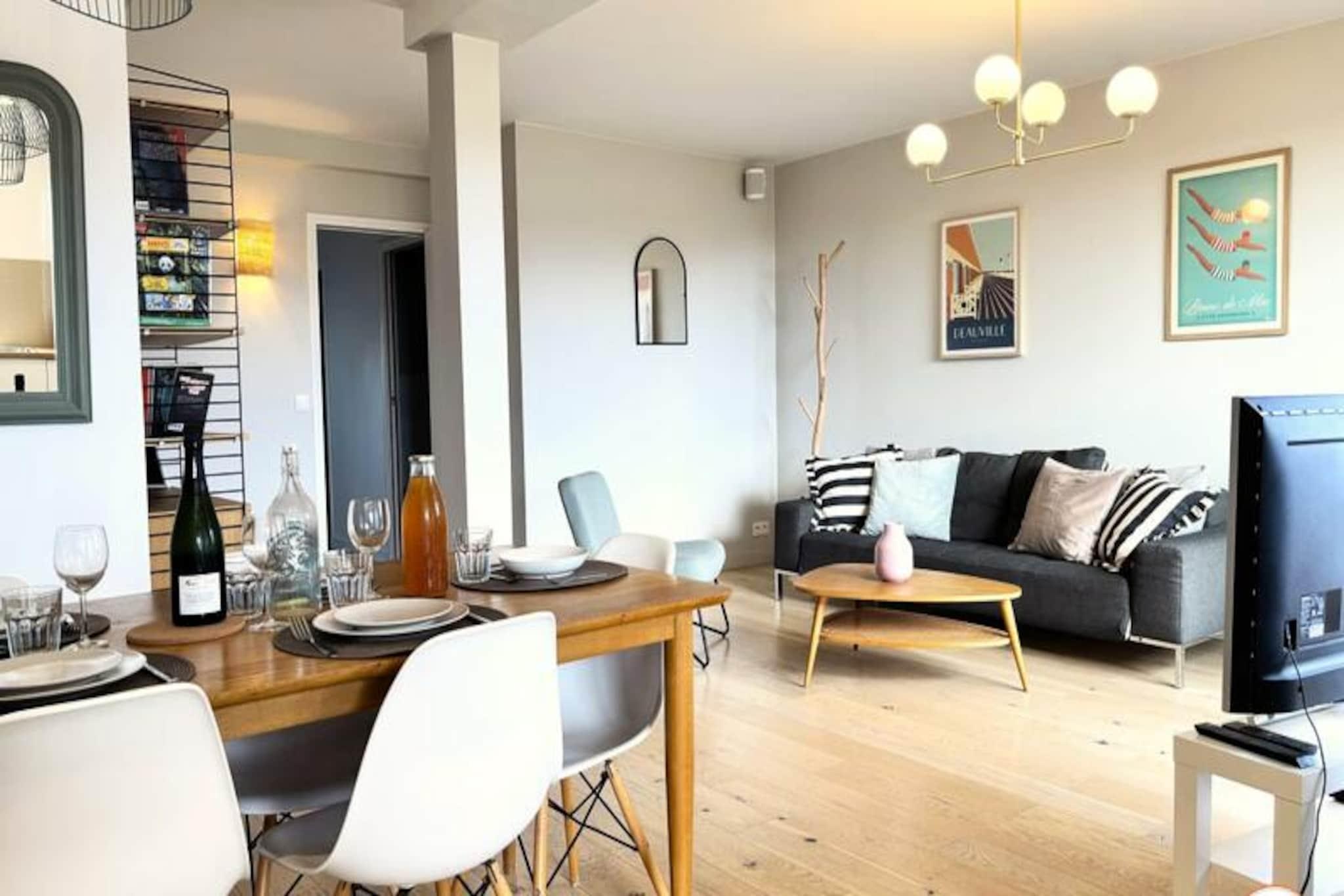 Med en storslået udsigt over Normandiets landskab og et glimt af havet tilbyder denne elegante lejlighed i den prestigefyldte Les Terrasses-residens et idyllisk tilflugtssted kun få skridt fra Deauvilles gyldne strande og livlige restauranter. Perfekt til familier, der søger en blanding af ro og kystcharme, inviterer denne ejendom dig til at fordybe dig i det nordlige Frankrigs skønhed, mens du nyder moderne komfort og elegant design. Uanset om du nyder den friske havbrise fra den solrige balkon eller udforsker den nærliggende Mont Canisy, føles hvert øjeblik her som en hyldest til natur og afslapning.\n\nLejligheden har komfortabel plads til op til fem gæster og er omhyggeligt designet til både stil og bekvemmelighed. Den rummelige stue har en hyggelig opholdsstue, en spiseplads og direkte adgang til balkonen, hvor du kan slappe af med panoramaudsigt. Det åbne køkken er fuldt udstyret med moderne apparater, herunder ovn, mikrobølgeovn, opvaskemaskine og induktionskogeplade, hvilket gør det nemt at tilberede lækre måltider. Soveværelset kan prale af en queensize-seng og rigelig opbevaringsplads, mens børneværelset tilbyder tre enkeltkøjesenge, perfekt til yngre gæster. To elegante badeværelser med brusere og oplyste spejle sikrer en forfriskende start på dagen.\n\nDenne lejlighed ligger på grænsen mellem Deauville og Tourgéville, kun en kort gåtur fra byens centrum og kasinoet, men alligevel i et fredeligt område, der er ideelt for familier. Tennisentusiaster vil sætte pris på de nærliggende baner med udsigt over havet, som er tilgængelige efter reservation. For ekstra bekvemmelighed kan privat parkering arrangeres efter anmodning, og gratis Wi-Fi, sengelinned og håndklæder er inkluderet.\n\nUanset om du slentrer langs strandpromenaden, opdager Deauvilles skjulte perler eller blot slapper af i den rolige atmosfære i Les Terrasses, er denne lejlighed din port til en uforglemmelig flugt i Normandiet.