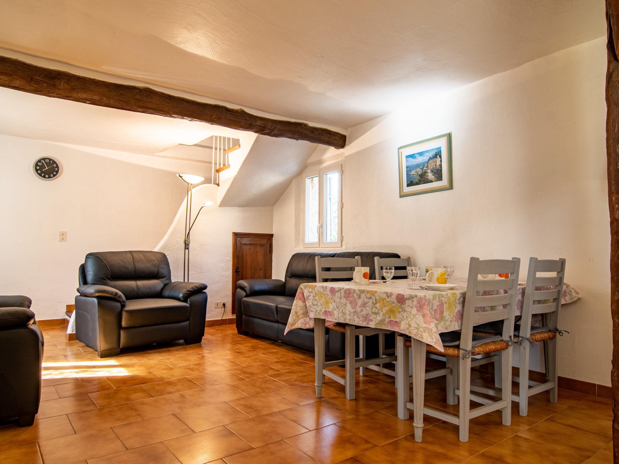 "La Foux", 3-room house 70 m2 on 2 levels. Practical and rustic furnishings: living/dining room with dining table, satellite TV, radio and CD-player. Open kitchen (1 hot plate, oven, dishwasher, 3 gas rings, toaster, kettle, microwave, electric coffee machine). Upper floor: 1 room with 1 french bed (140 cm, length 190 cm). 1 room with 2 beds (90 cm, length 190 cm). Bath/WC. Electric heating, air-conditioning. Patio 30 m2, patio 15 m2. Terrace furniture, electric barbecue (portable). Facilities: washing machine, iron, children's high chair, baby cot. Please note: non-smoking house. Maximum 1 pet/ dog allowed. Smoke alarm.