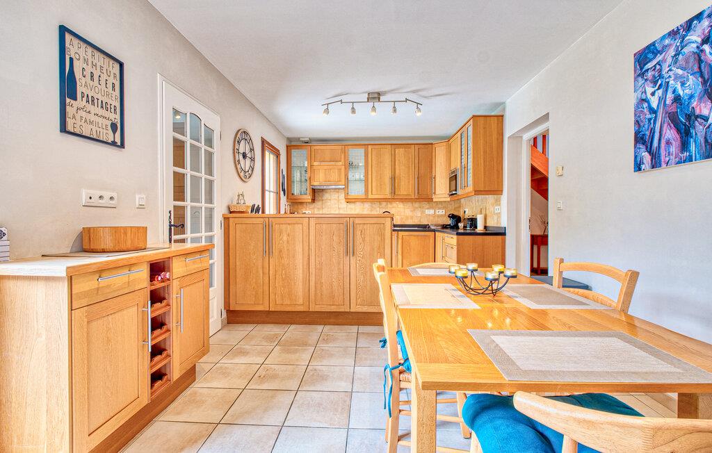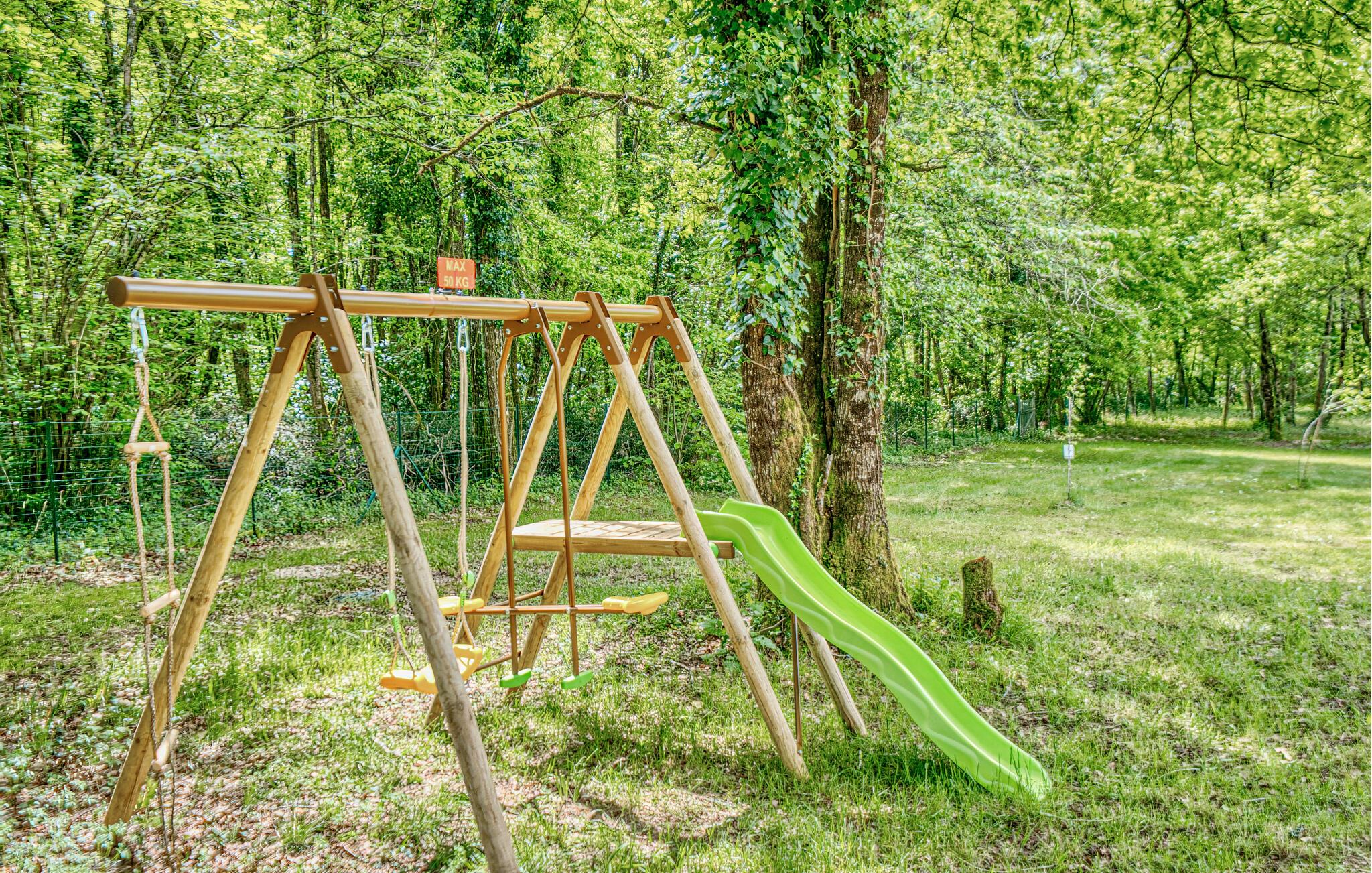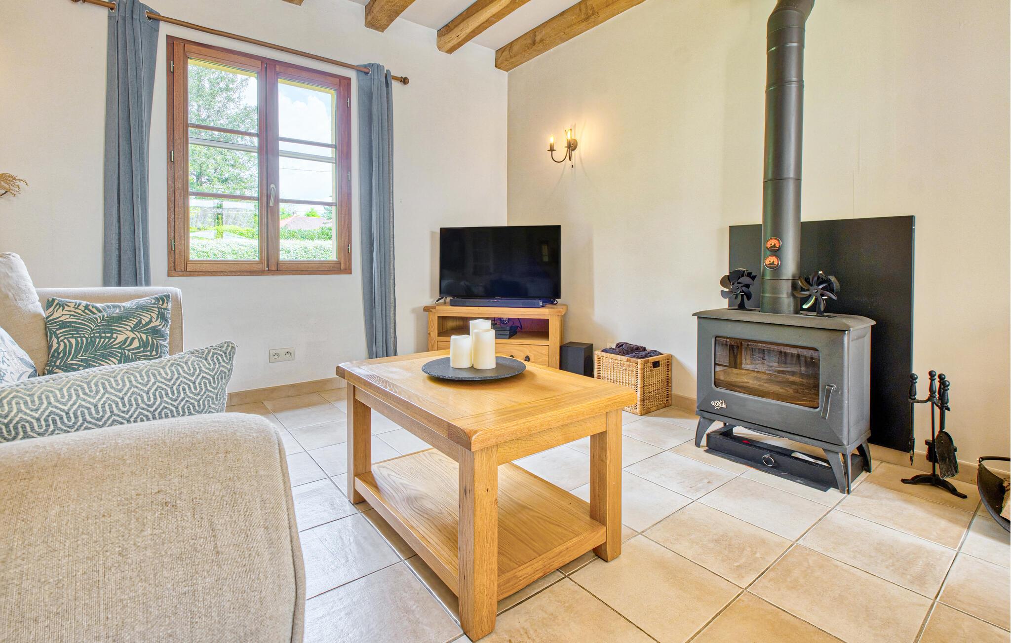 I hjertet af Dordogne tilbyder denne rummelige villa jer en hyggelig base for rolige dage og interessante ture med venner eller familie. Tilbered regionale specialiteter sammen i det lyse køkken og nyd den varme atmosfære i den stilfulde spiseplads med udsigt til haven. Arranger spilleaftener sammen på de komfortable sofaer, stream en spændende film og lad brændeovnen give ekstra komfort på køligere dage.