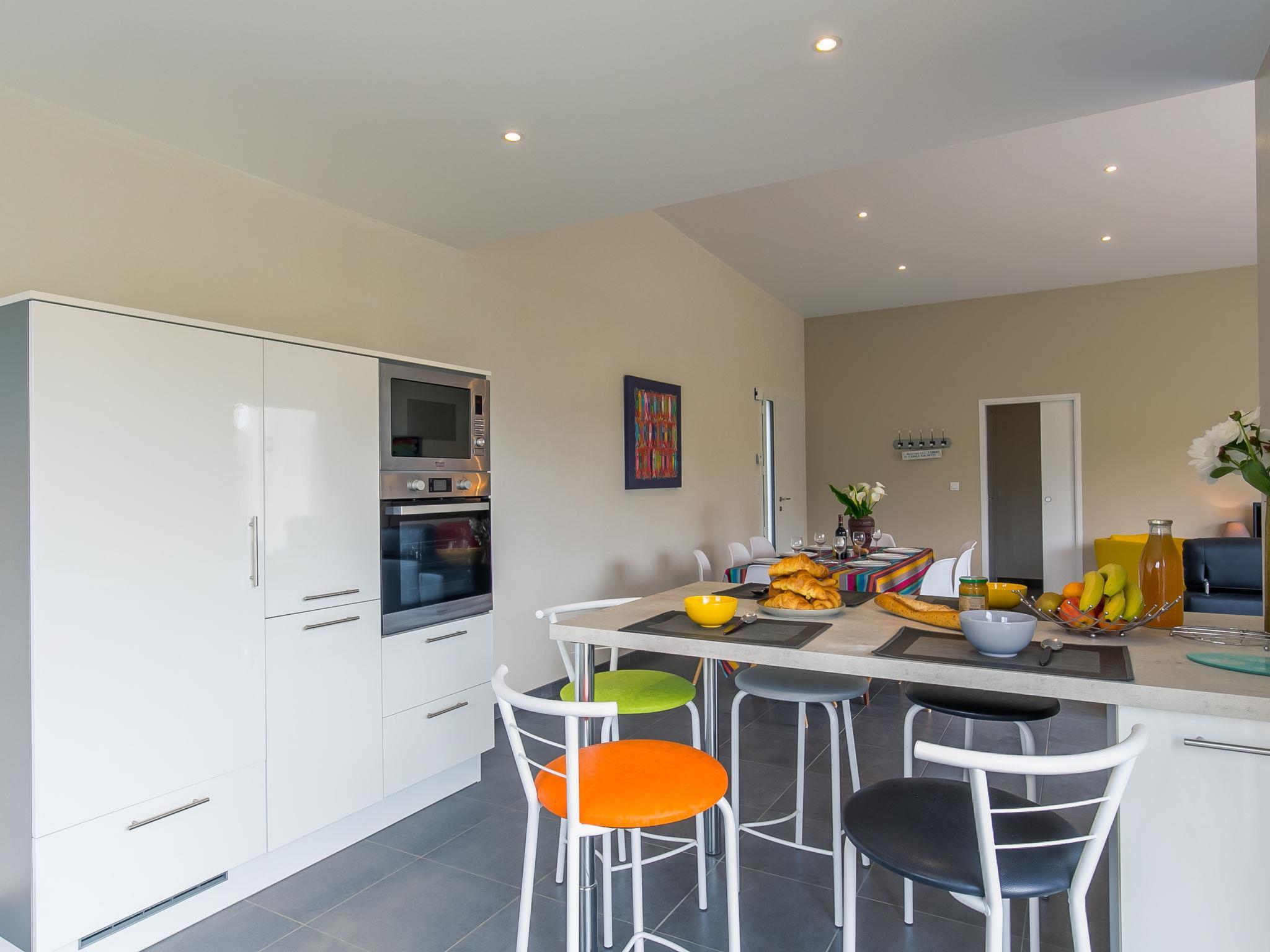 "Terre et Mer", 4-room house 110 m2. Bright, modern furnishings: living/dining room with dining table and TV. Exit to the terrace. 1 room with 1 french bed (160 cm, length 200 cm), shower/WC. 1 room with 1 french bed (140 cm, length 190 cm). 1 room with 2 beds (90 cm, length 190 cm). Open kitchen (oven, dishwasher, 3 induction hot plates, toaster, kettle, microwave, freezer, electric coffee machine) with dining table. Exit to the terrace. Shower, sep. WC. Heating. Terrace. Terrace furniture, barbecue (portable), deck chairs (3), box-room. Facilities: washing machine. Internet (WiFi, free). Please note: non-smoking house. Smoke alarm.