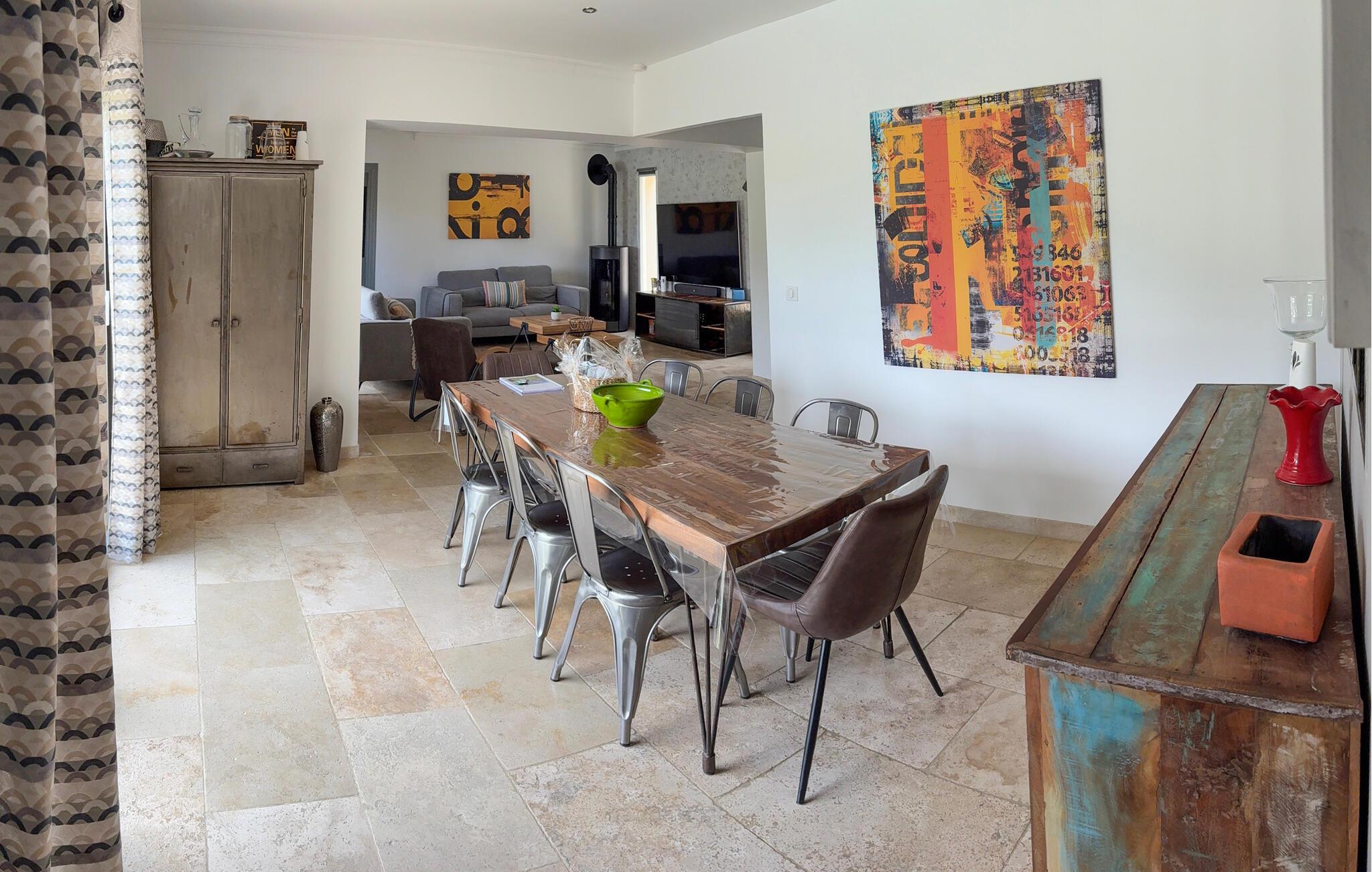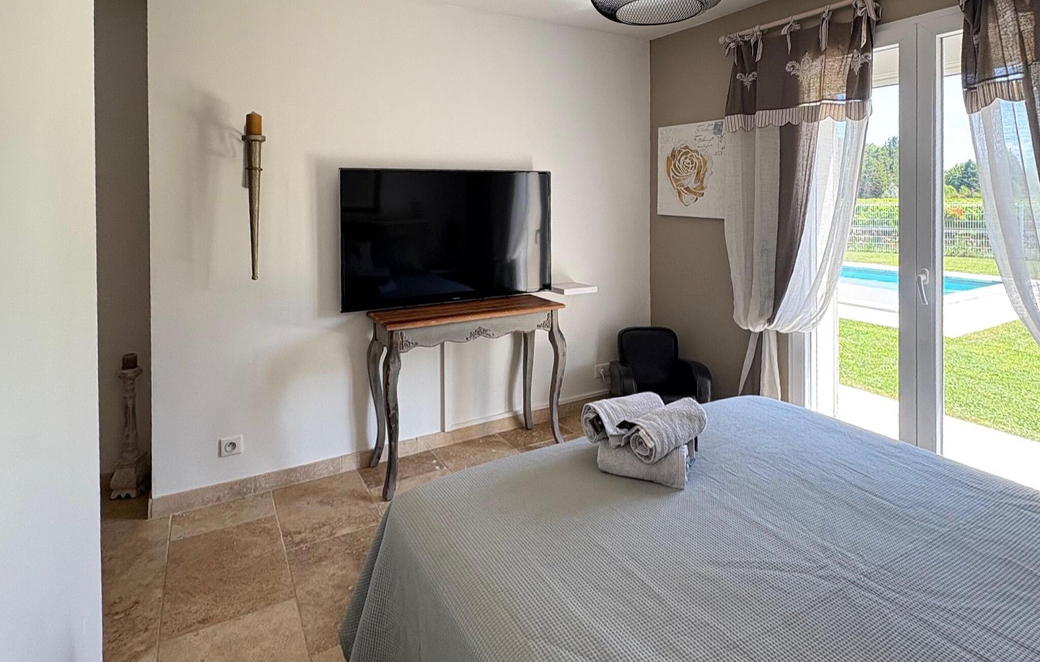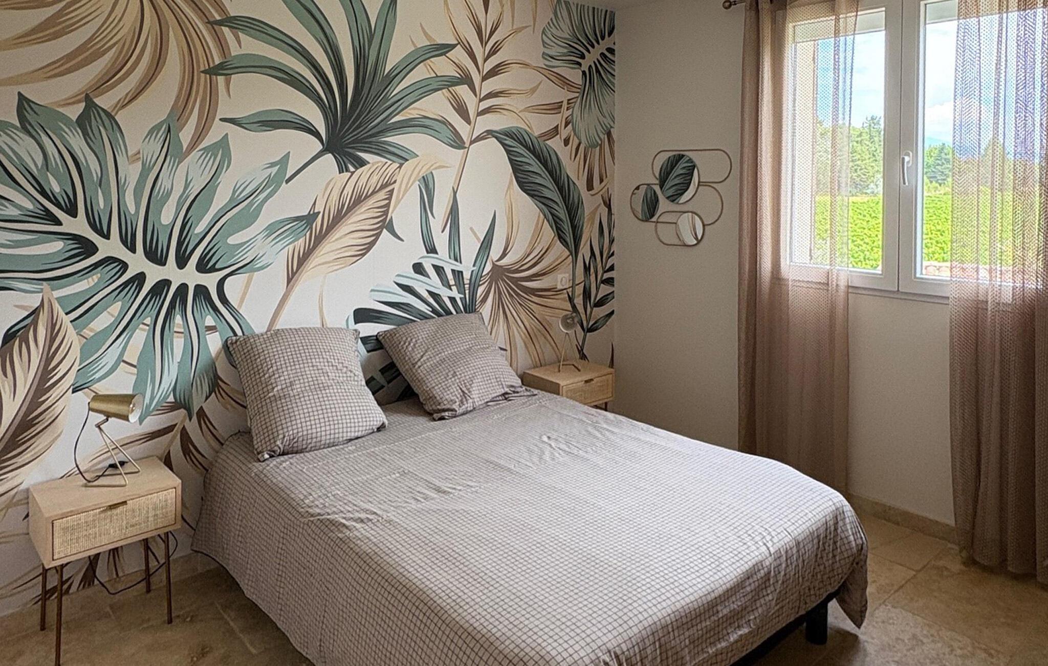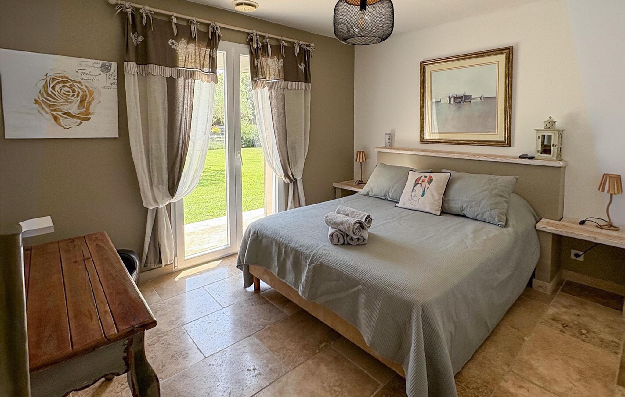 Denne ferievilla i Uchaux, beliggende mellem Vaucluse og Drôme Provençale, tilbyder en rolig flugt. Det har en privat pool og aircondition i alle soveværelser og opholdsområder. Gæsterne kan nyde den maleriske udsigt over Mont Ventoux og de omkringliggende vinmarker. I stueetagen finder du et køkken udstyret med de nødvendige faciliteter samt en Nespresso-kaffemaskine. Den tilstødende d spisestue åbner gennem et stort karnapvindue til terrassen og haven, med udsigt over poolen. Stuen har komfortable siddepladser og et tv, der også åbner ud til terrassen. Der er også et ensuite soveværelse på denne etage. Ovenpå er der yderligere to soveværelser med fælles badeværelse. Udenfor har den lukkede jord en have prydet med palmer og oliventræer med naturskøn udsigt over Mont Ventoux. Villaen har to terrasser - den ene giver en dejlig udsigt over Mont Ventoux, og den anden med udsigt over haven og poolen. Den private pool, der måler 8m x 4m med en dybde på 1,50m, er udstyret med liggestole, liggestole og en parasol til afslapning. En barneseng og høj stol er til rådighed til brug. Villaen er beliggende i udkanten af den lille landsby Uchaux (2 km) og landsbyen Piolenc (3,5 km), hvor du finder butikkerne: købmand, bageri, restauranter. Uchaux strækker sig over et stort område af bakker og dale bevokset med skove og vinmarker, på grænsen mellem Drôme Provençale og Vaucluse. Ideelt område til mountainbike- og vandreture i Uchaux-massivet. I nærheden kan du besøge "Côtes du Rhône"-vinmarkerne: Cairanne, Gigondas, Vacqueyras, Châteauneuf du Pape. Byen Orange, dets gamle teater og dets Chorégies (8 km).