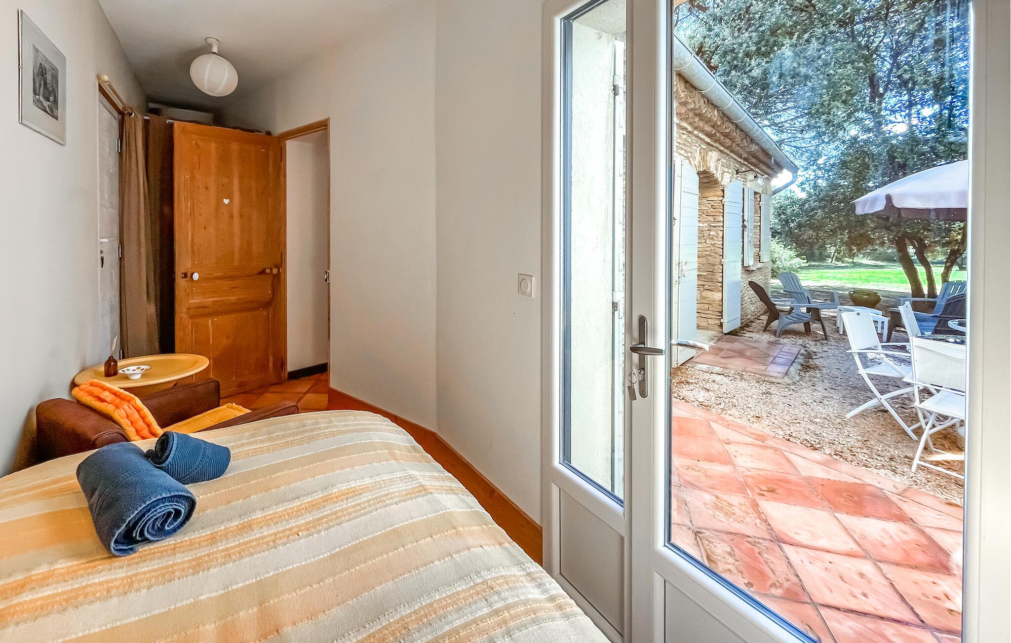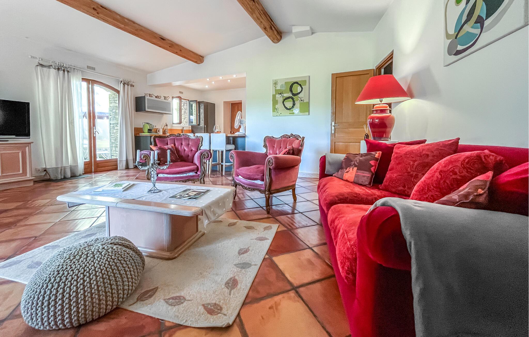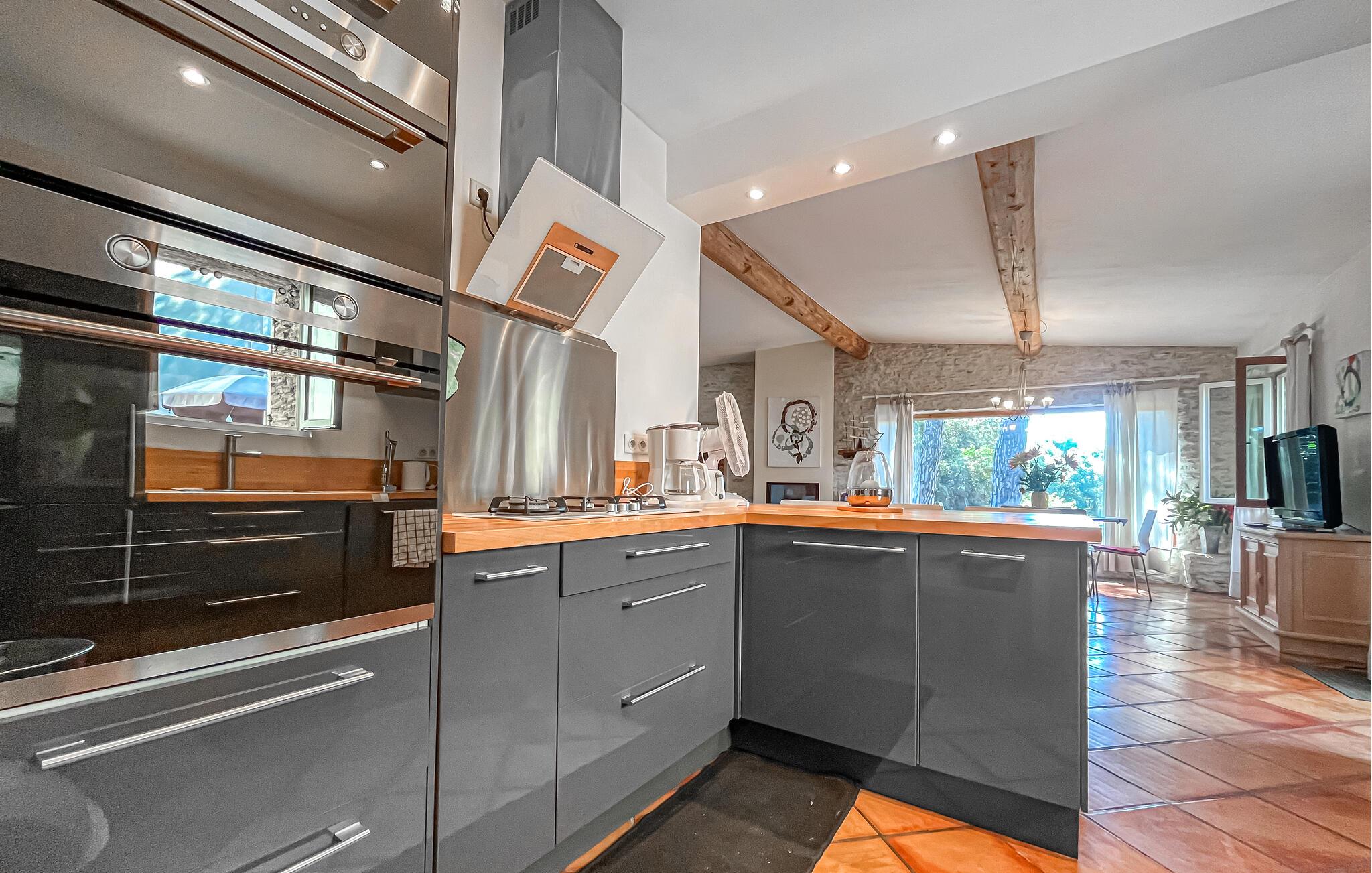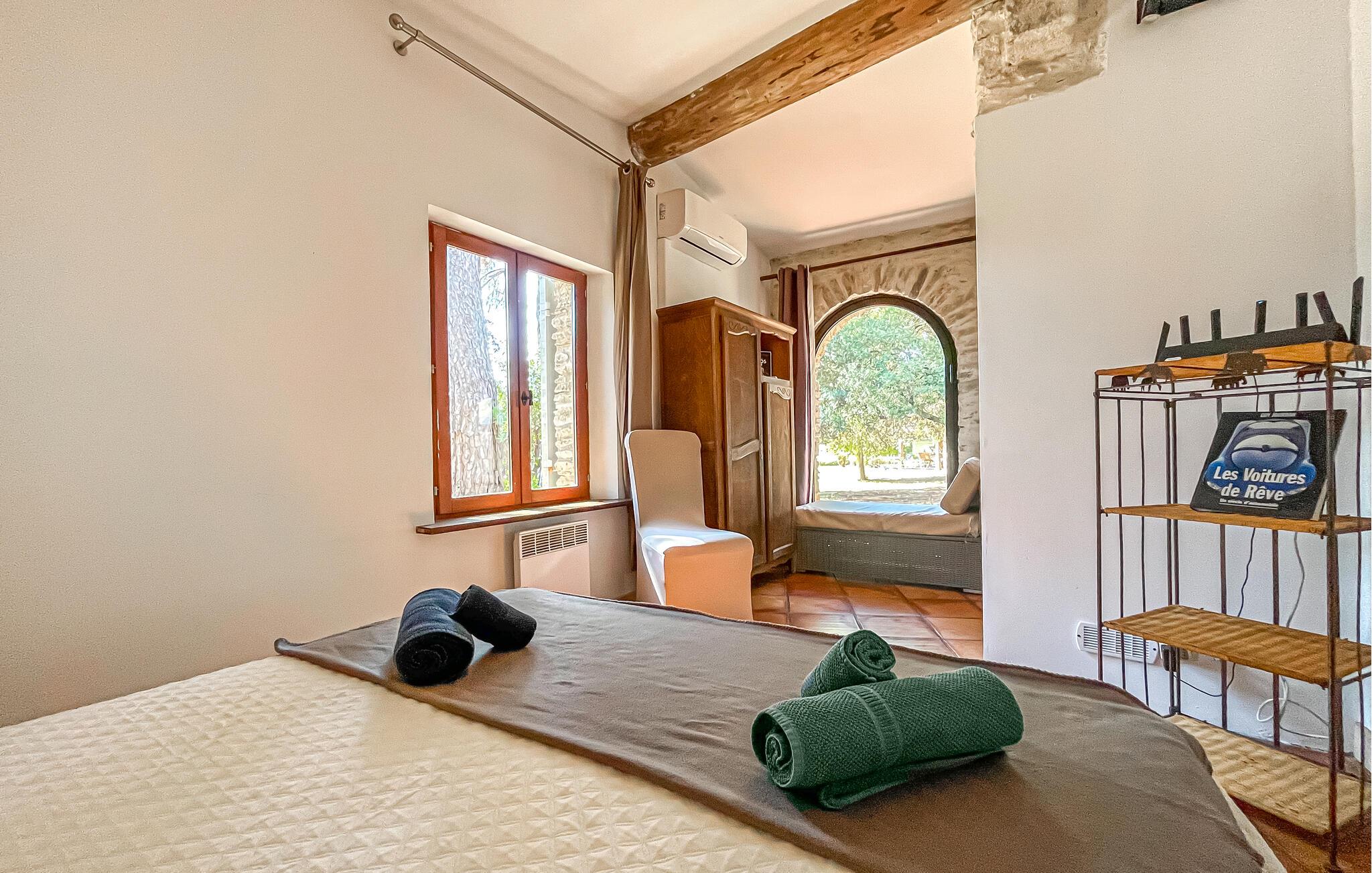 Dette provencalske hus tilbyder naturelskere og dem, der søger fred og ro, et komfortabelt tilflugtssted, hvor store vinduer tilbyder udsigt over det omkringliggende landskab, og stilfulde møbler sikrer en hyggelig atmosfære. Fremtryll lækre retter i det moderne køkken, planlæg jeres aktiviteter over harmoniske måltider i den indbydende spisestue og afslut en begivenhedsrig dag med afslappende læsning eller sjove spil.