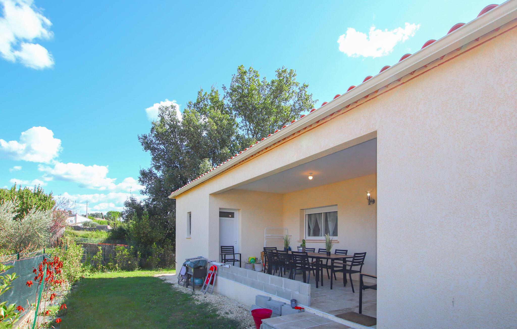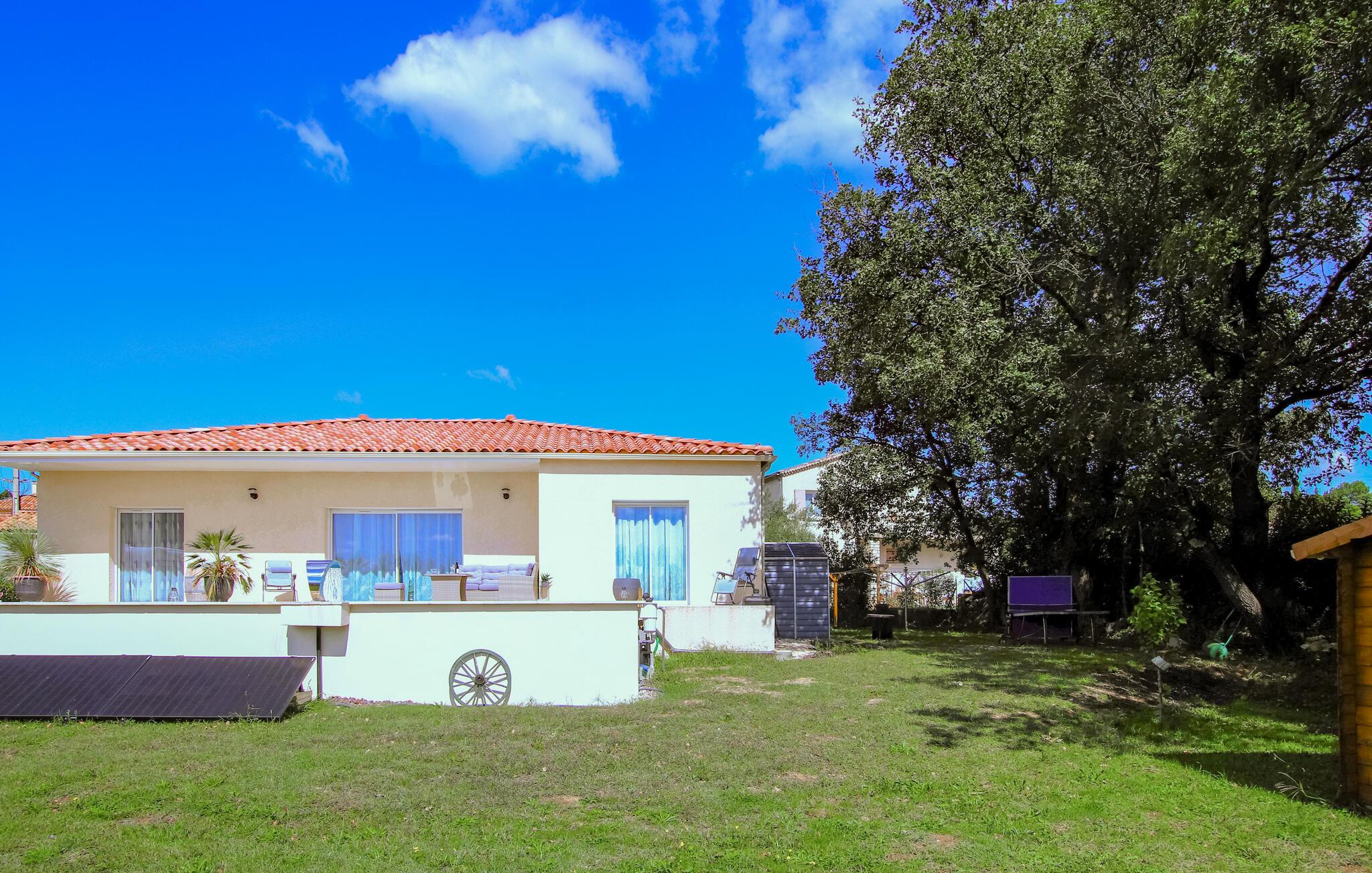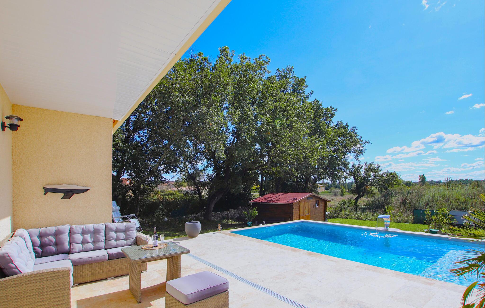Indlejret i en grøn, blomstrende have omgivet af træer, kan I nyde udendørsaktiviteter og bruge den store solrige terrasse, inden I smager regionale specialiteter fra grillen. I kan også glæde jer over den smukke private pool, der er beskyttet mod nysgerrige blikke.
