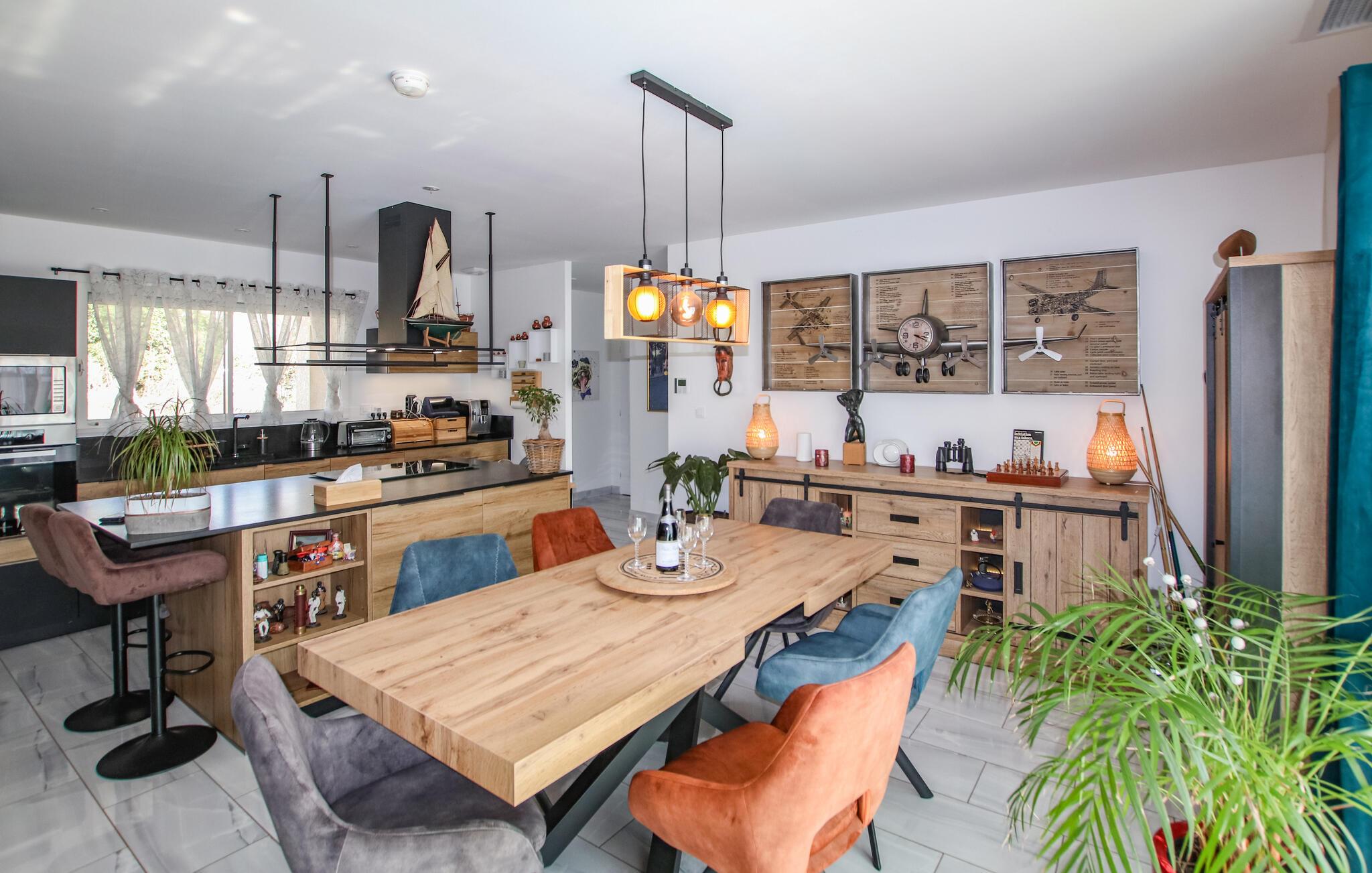 Dette charmerende provencalske hus, lyst og meget komfortabelt, er indrettet med en omhyggelig, varm og hyggelig atmosfære. De kvalitetsmøbler og udsøgte materialer skaber en rolig stemning og ægte velvære. Det rummelige opholdsområde med dets højkvalitetskøkken åbner sig mod syd til poolterrassen og mod nord til den overdækkede patio.