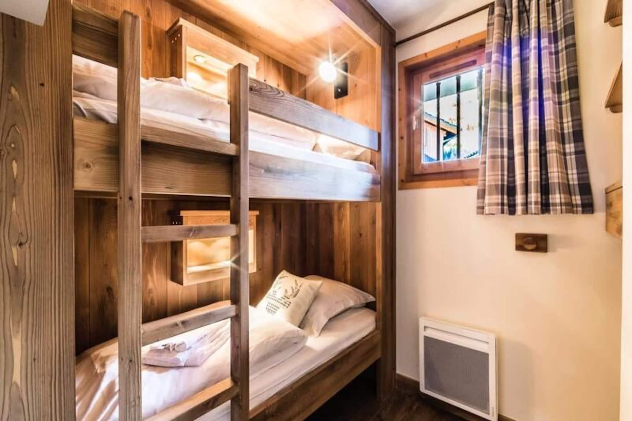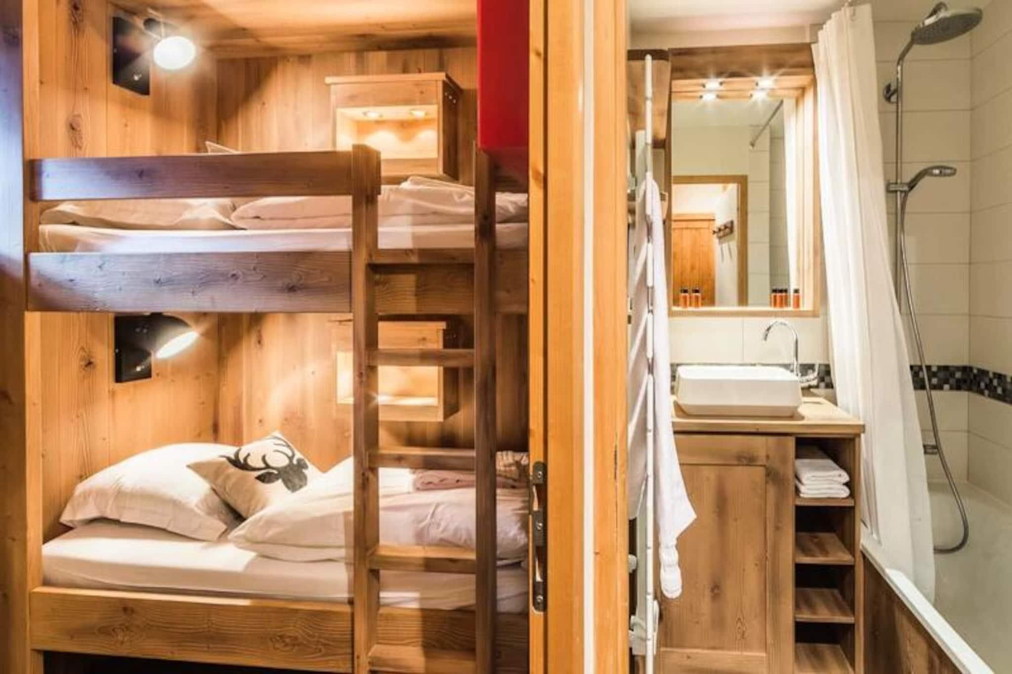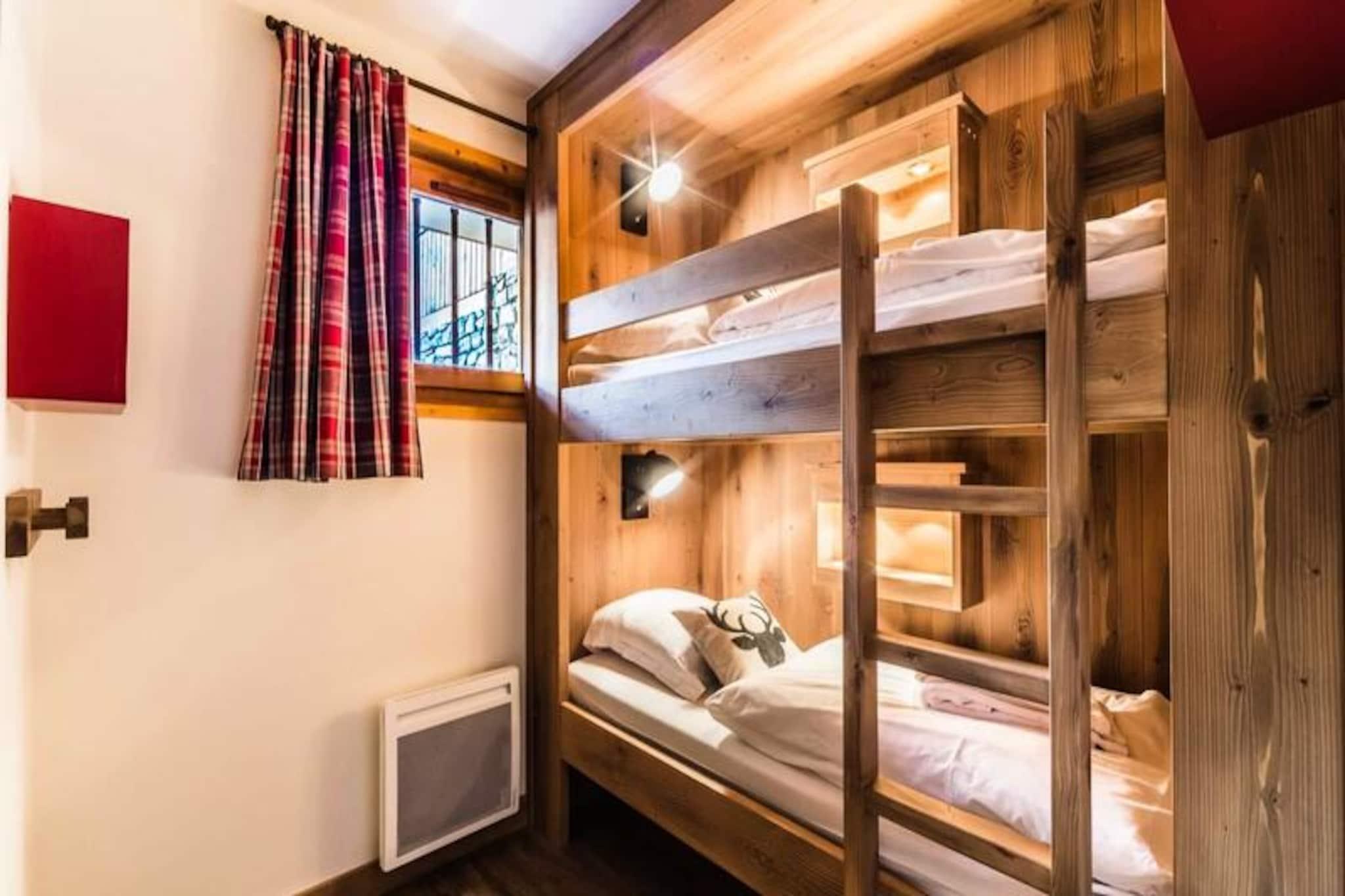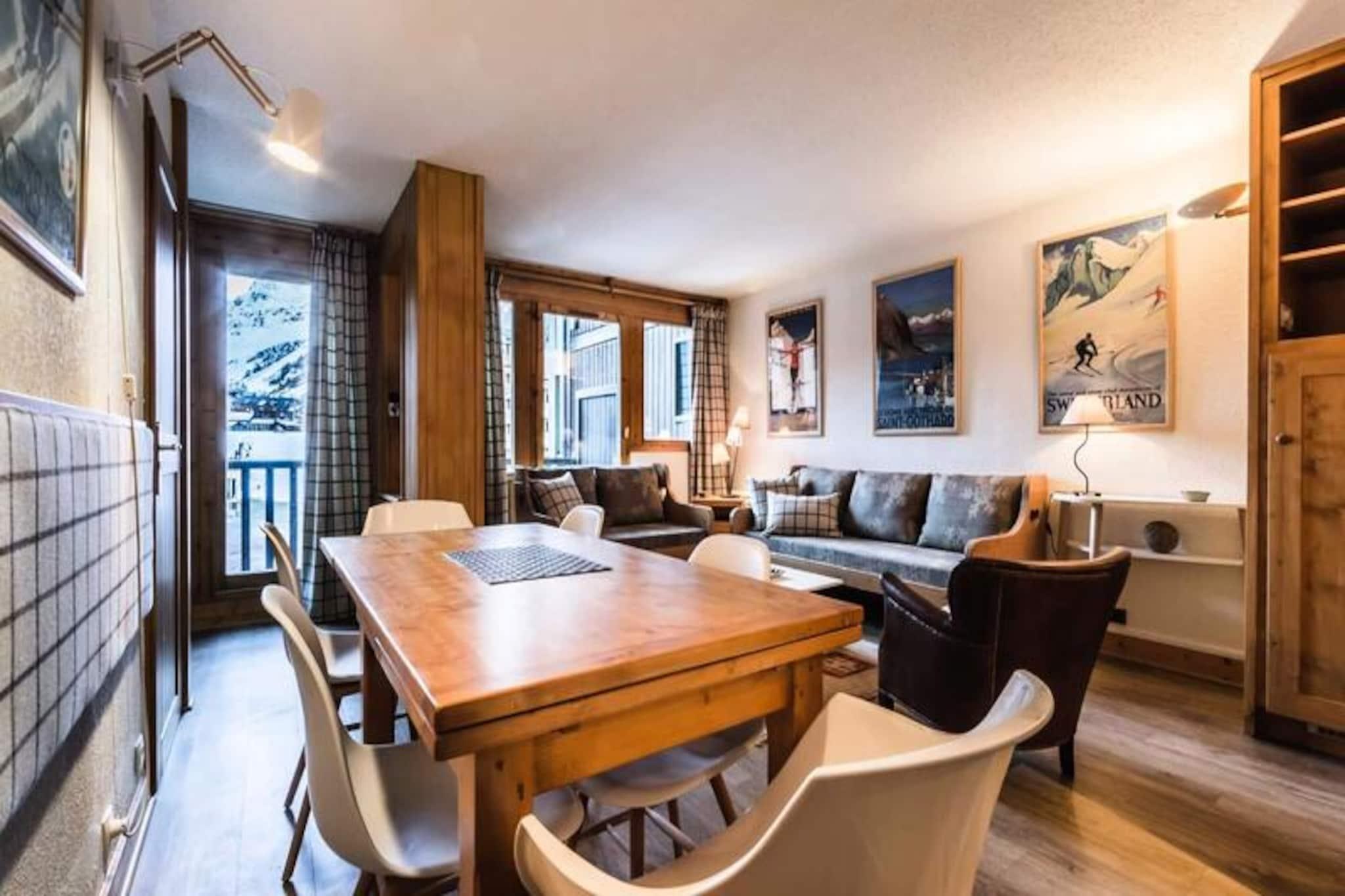 Under de tårnhøje tinder i de franske alper tilbyder denne charmerende lejlighed i Val d'Isère Village et uovertruffent alpint tilflugtssted. Med sin traditionelle savoyard-arkitektur af sten og træ udstråler boligen en varm og indbydende atmosfære, der perfekt kombinerer rustik charme med moderne komfort. Den sydvendte balkon tilbyder en betagende udsigt over de snedækkede skråninger, hvilket gør det til et idyllisk sted at nyde din morgenkaffe eller slappe af efter en dag med eventyr.\n\nDenne lejlighed på tredje sal i Saturne-residensen er designet til at rumme op til seks gæster og er både hyggelig og funktionel. Den har en rummelig stue med fladskærms-tv, et fuldt udstyret køkken med Nespresso-maskine og en spiseplads, der er perfekt til fælles måltider. Sovepladserne omfatter et komfortabelt dobbeltværelse med eget badeværelse samt to soveværelser med køjesenge, hver med et sæt køjesenge. Et andet badeværelse med badekar og vaskemaskine sikrer bekvemmelighed for alle gæster. Yderligere faciliteter såsom et skirum, overdækket parkering og gratis Wi-Fi forbedrer dit ophold.\n\nDenne lejlighed ligger kun få skridt fra pisterne, den franske skiskole og en række butikker og restauranter og er et paradis for både skientusiaster og fritidsrejsende. Nyd afterskiing-drinks på Coin des Amis, eller dans natten væk på Le Doudoune Club. Når du skal spise, kan du nyde de lokale smagsoplevelser på La Corniche eller drage fordel af eksklusive rabatter på skiudlejning i den nærliggende INTERSPORT Front de Neige MATTIS-butik.\n\nUanset om du er her for at grave dig gennem frisk puddersne, udforske den charmerende landsby eller blot slappe af i de rolige alpine omgivelser, lover dette Val d'Isère-tilflugtssted en uforglemmelig bjergferie. Med sin førsteklasses beliggenhed, moderne faciliteter og fantastiske udsigt er det den perfekte base for at skabe dyrebare minder i hjertet af de franske alper.