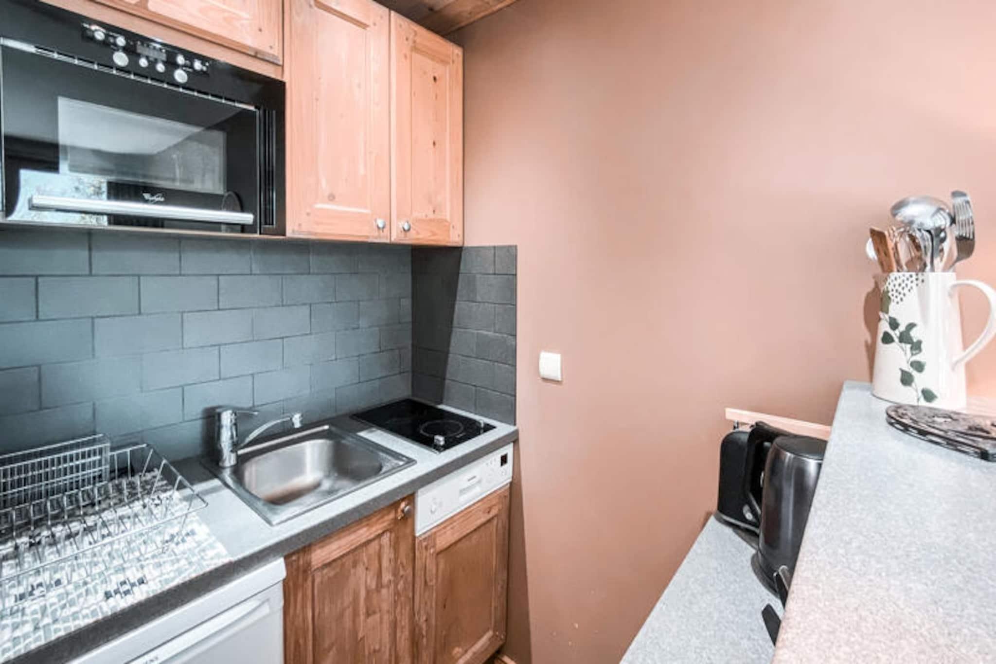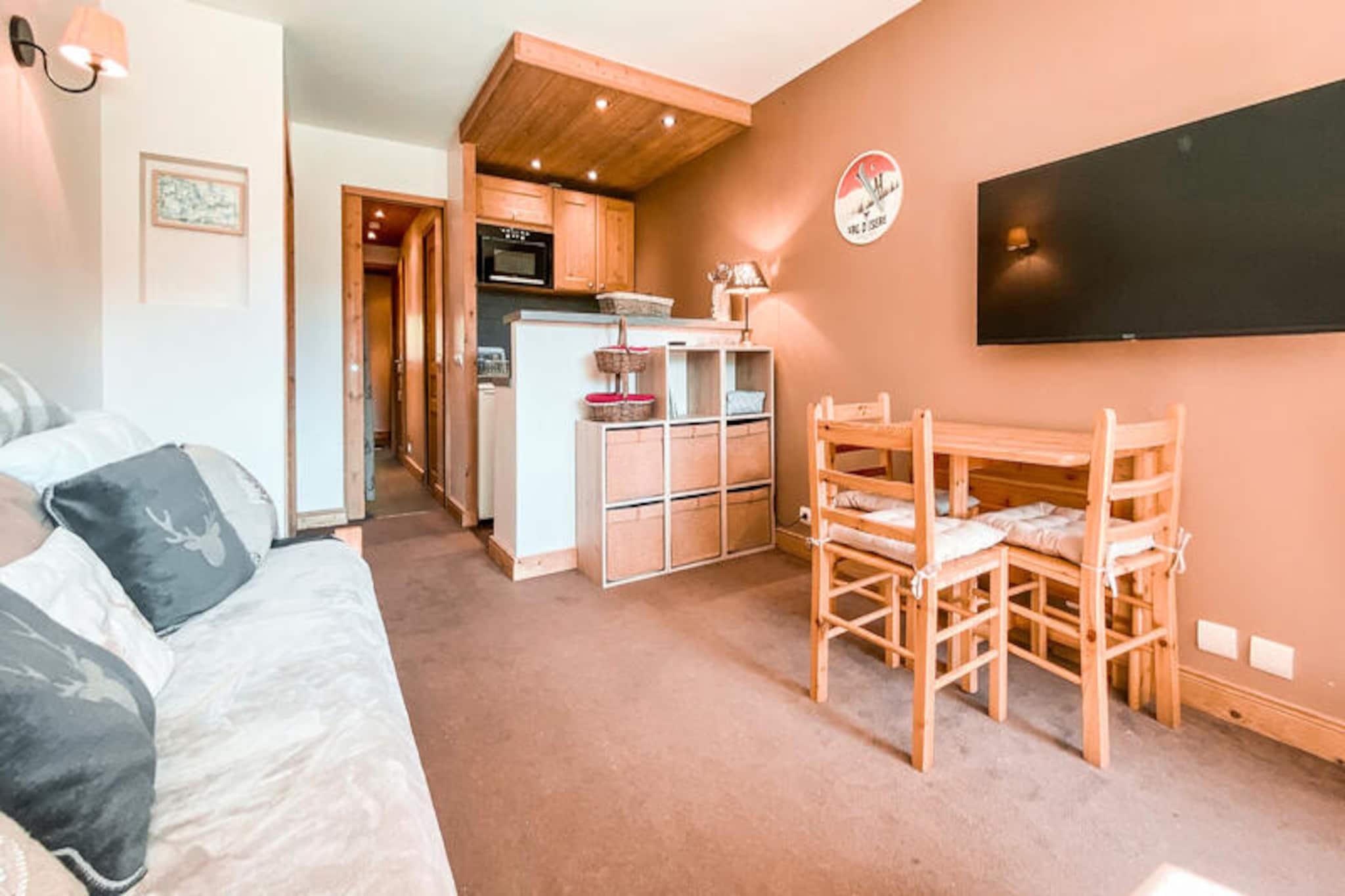 I hjertet af den charmerende landsby La Daille tilbyder Saint-Michel Residence et roligt alpint tilflugtssted kun få øjeblikke fra Val d'Isères pister. Forestil dig at vågne op til den friske bjergluft og træde ud på din sydøstvendte terrasse, hvor en betagende udsigt over de omkringliggende tinder møder dig hver morgen. Denne fredelige bolig er perfekt beliggende, kun en kort gåtur fra La Daille-svævebanen, hvilket sikrer problemfri adgang til det verdensklasse skiterræn i Espace Killy-området. Uanset om du besøger stedet om vinteren for at nyde spændingen ved skiløb eller om sommeren for at udforske de frodige alpine stier, er denne hyggelige lejlighed din port til uforglemmelige bjergeventyr. Den 29 m² store lejlighed er omhyggeligt designet til at rumme op til seks gæster, hvilket gør den ideel til familier eller små grupper. Stuen har et sæt udtrækssenge, mens et separat soveværelse i entréen er udstyret med to køjesenge. Et ekstra soveområde, smart gemt væk bag et gardin i gangen, tilbyder også to køjesenge, hvilket sikrer komfort og privatliv for alle. Lejlighedens veludstyrede køkken inkluderer keramisk kogeplade, kombineret ovn/mikrobølgeovn, Nespresso-kaffemaskine, opvaskemaskine og køleskab, der indeholder alt hvad du behøver for at tilberede solide måltider efter en dag på pisterne. En hyggelig opholdsstue med tv inviterer dig til at slappe af, mens badeværelset med badekar og separat toilet gør dit ophold mere behageligt. Beliggende kun få skridt fra La Daille-svævebanen og en række lokale butikker, placerer The Saint-Michel Residence dig i hjertet af begivenhedernes centrum, samtidig med at den opretholder en rolig atmosfære. Det nærliggende shuttlebusstoppested og den overdækkede parkeringsgarage gør det nemt at udforske det bredere Val d'Isère-område. Om sommeren forvandles landsbyen til et paradis for vandrere og naturentusiaster med stier, der fører til fantastiske udsigter og skjulte alpine perler. Med sin førsteklasses beliggenhed, praktiske faciliteter og hyggelige charme er The Saint-Michel Residence det perfekte valg for dem, der søger en mindeværdig bjergferie i enhver sæson.
