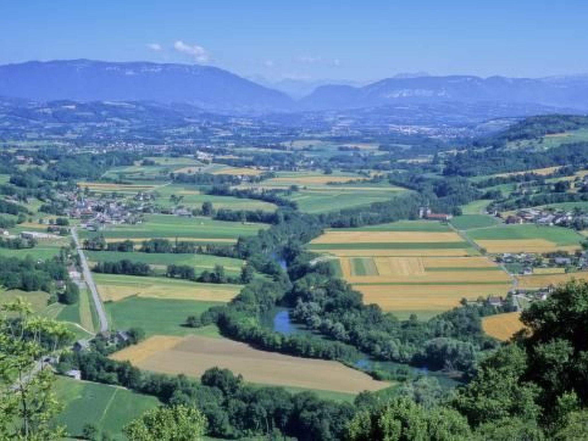* On one side, after the impressive defile of the Val, you can see the Jura mountains. To the south are the peaks of the Bauges, Aravis and Mont Blanc.