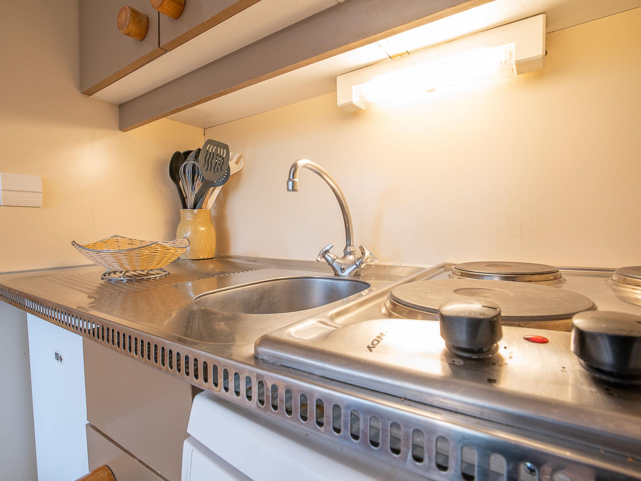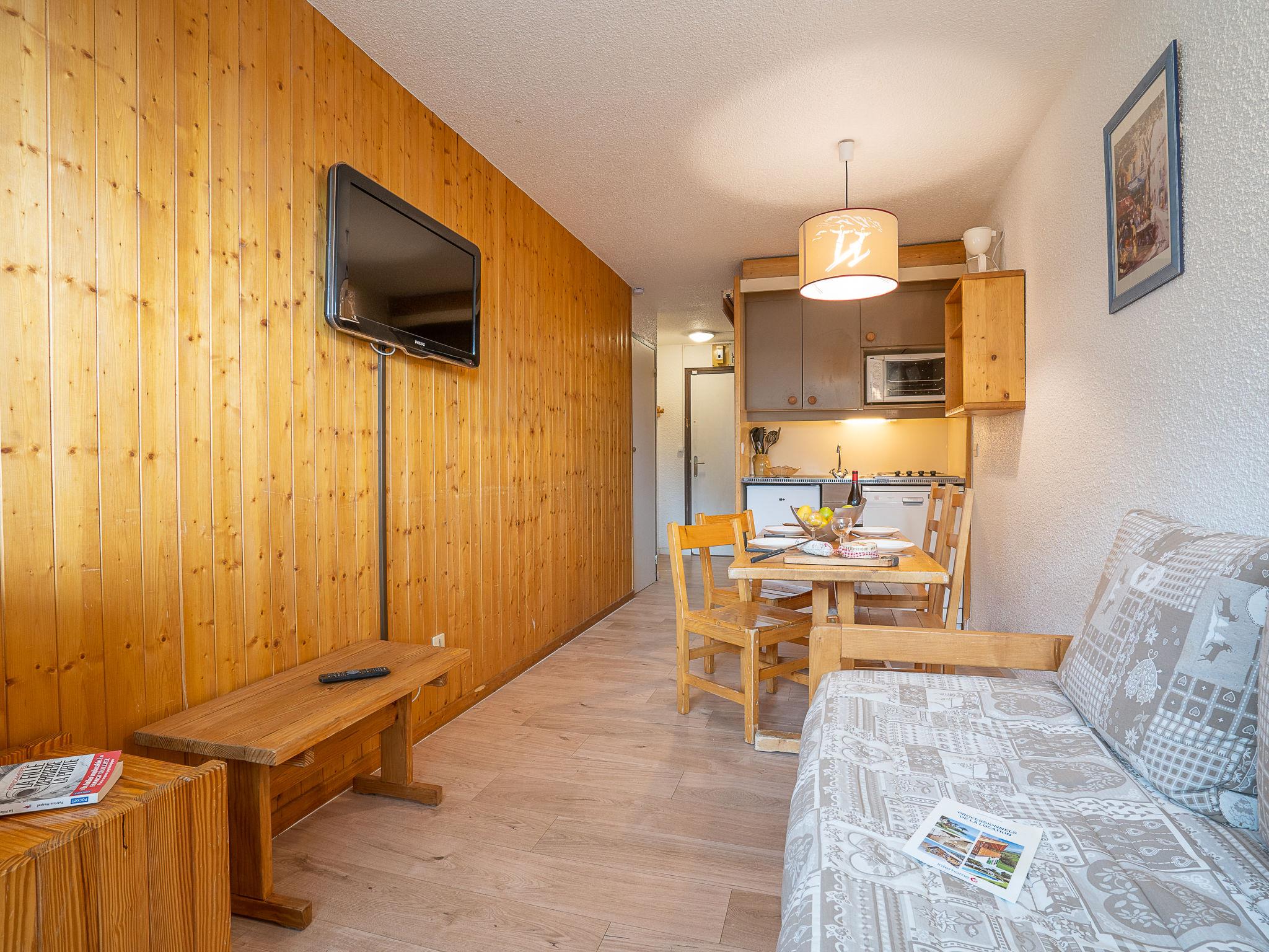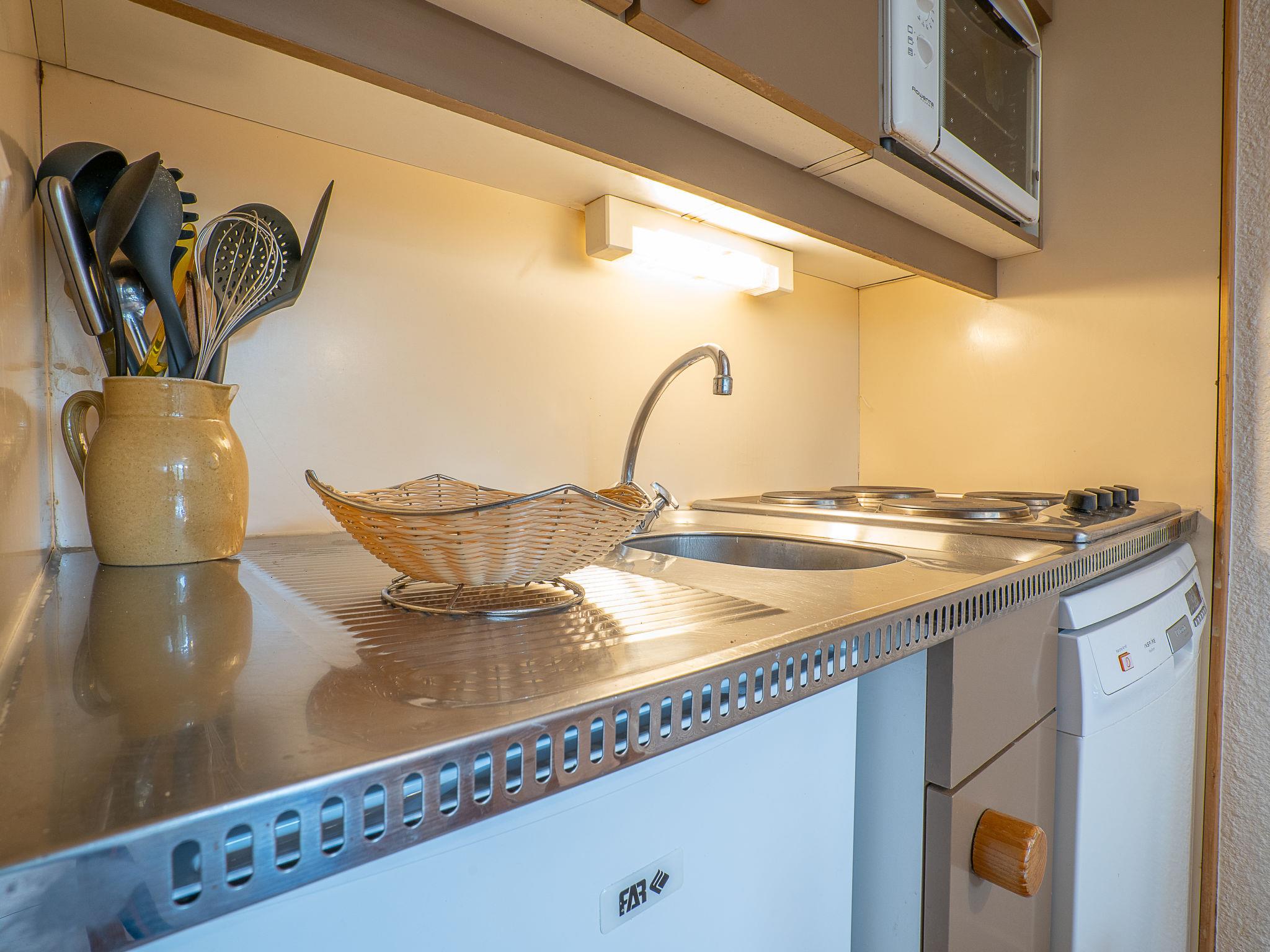 "Arcelle 614", 1-room apartment 24 m2 on 6th floor, north facing position. Very comfortable and cosy furnishings: living/dining room with 1 pull-out bed (2 pers. 2 x 80 cm, length 190 cm), TV, flat screen and electric heater. Sleeping alcove with 1 x 2 bunk beds (80 cm, length 190 cm), electric heater. Kitchenette (4 hot plates, oven, dishwasher, kettle, electric coffee machine). Bathroom, sep. WC. Parquet floors. View of the mountains. Facilities: Internet (WiFi, extra). Please note: suitable for families. Non-smokers only. Maximum 1 pet/ dog allowed. Smoke alarm. Instead of an enclosed bedroom, some sleeping areas are located in an open-plan area (gallery, alcove, etc.). 73257008456HT