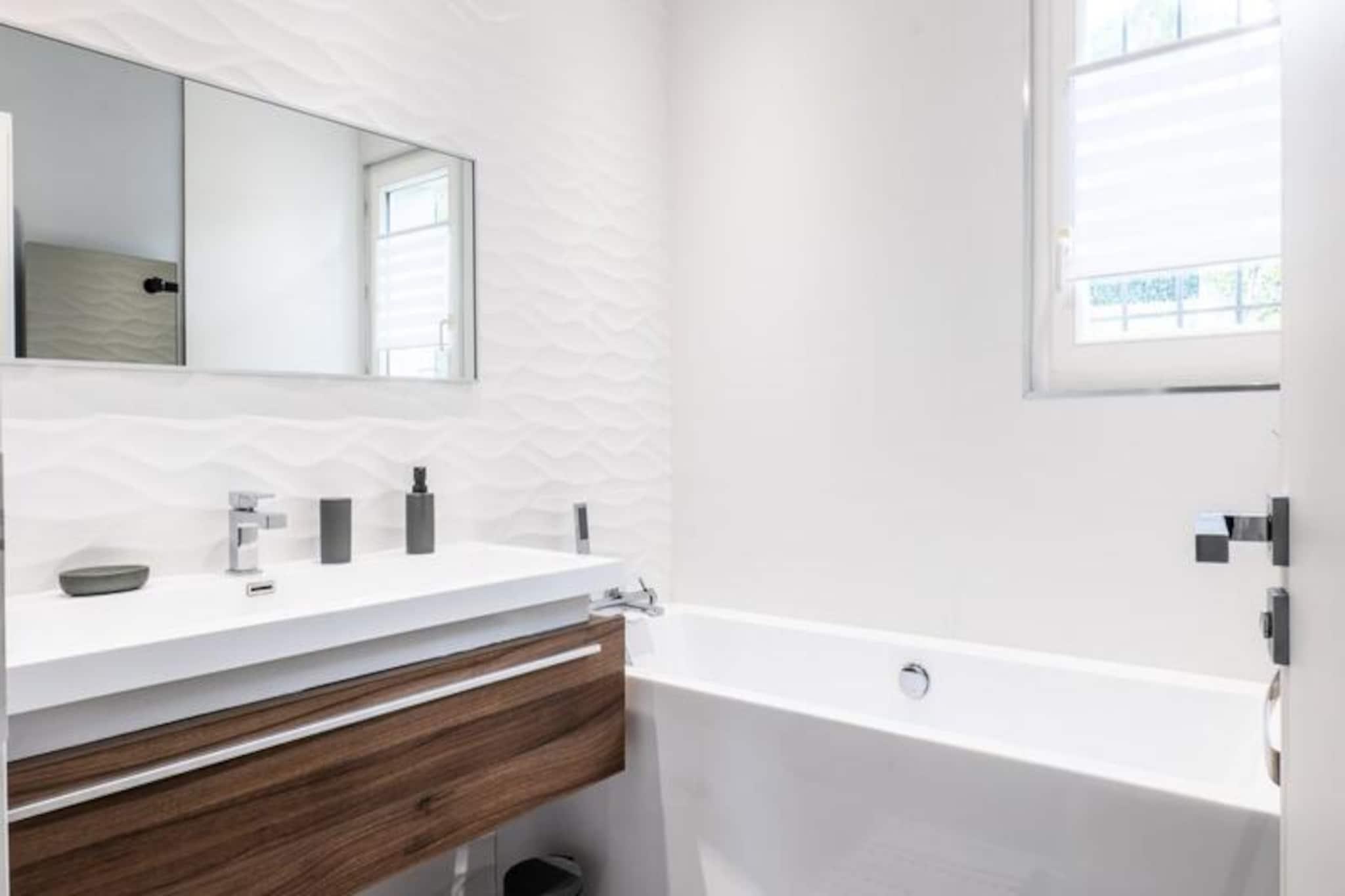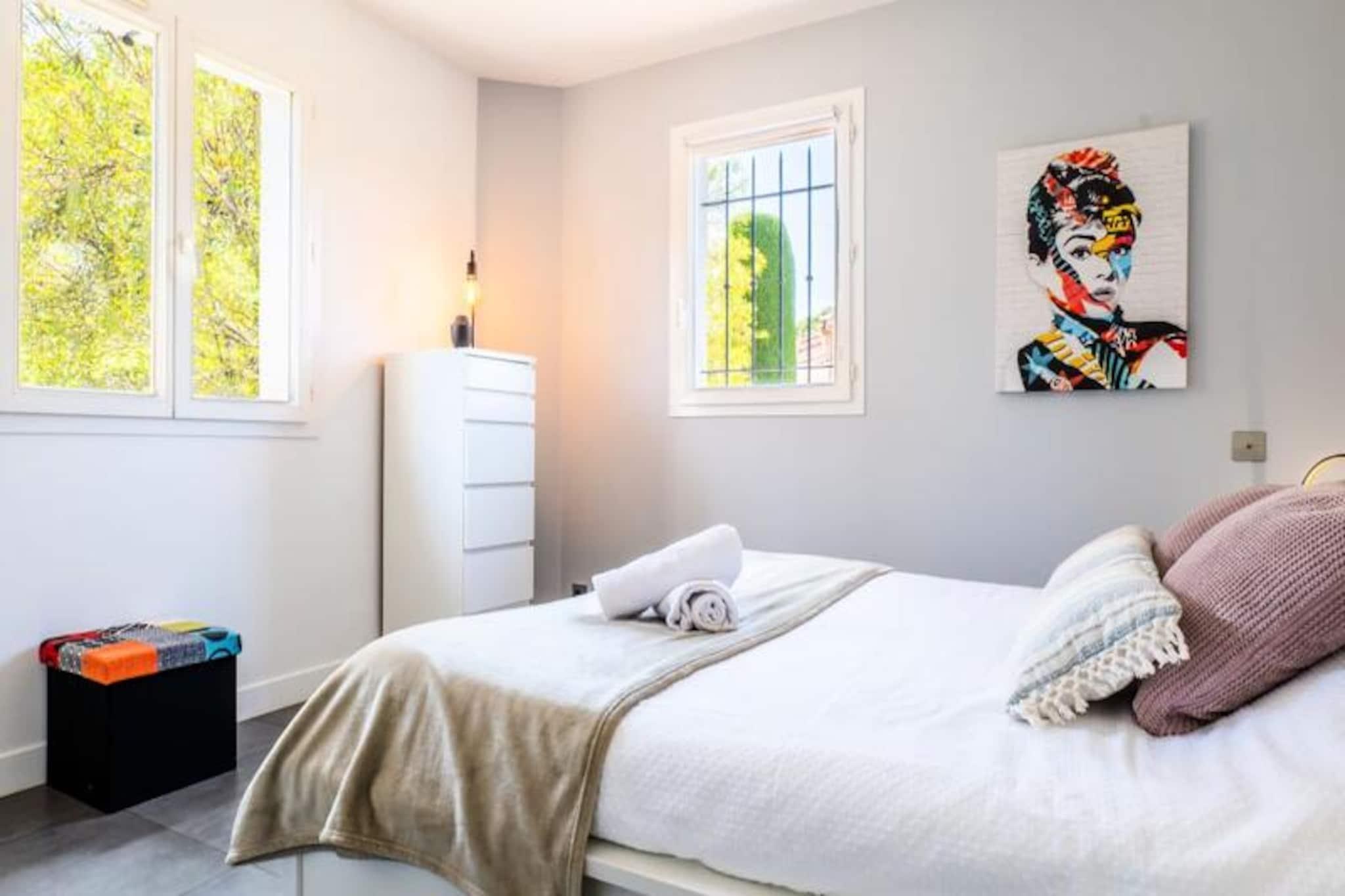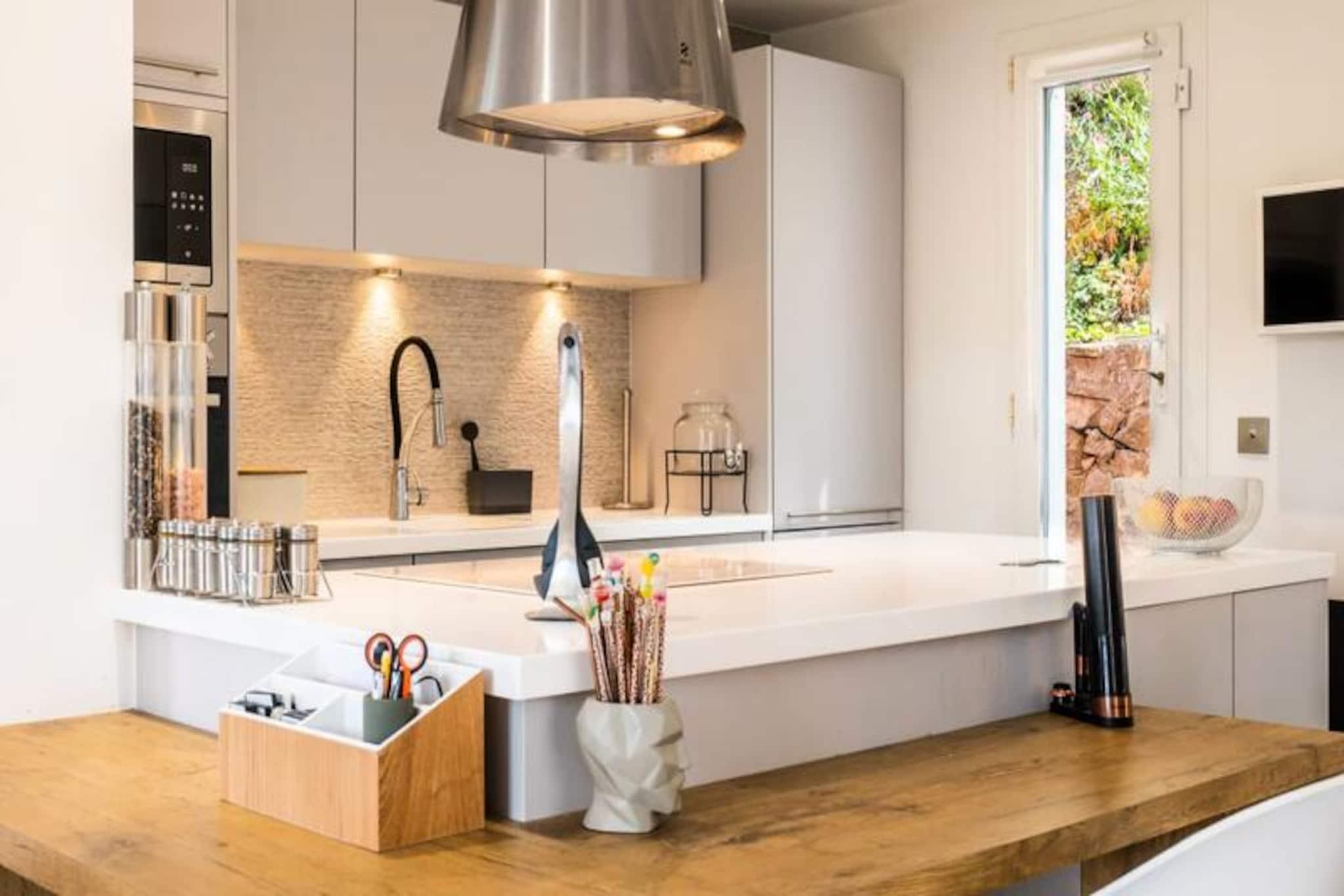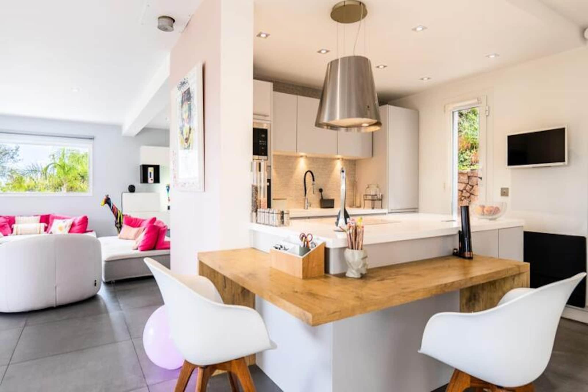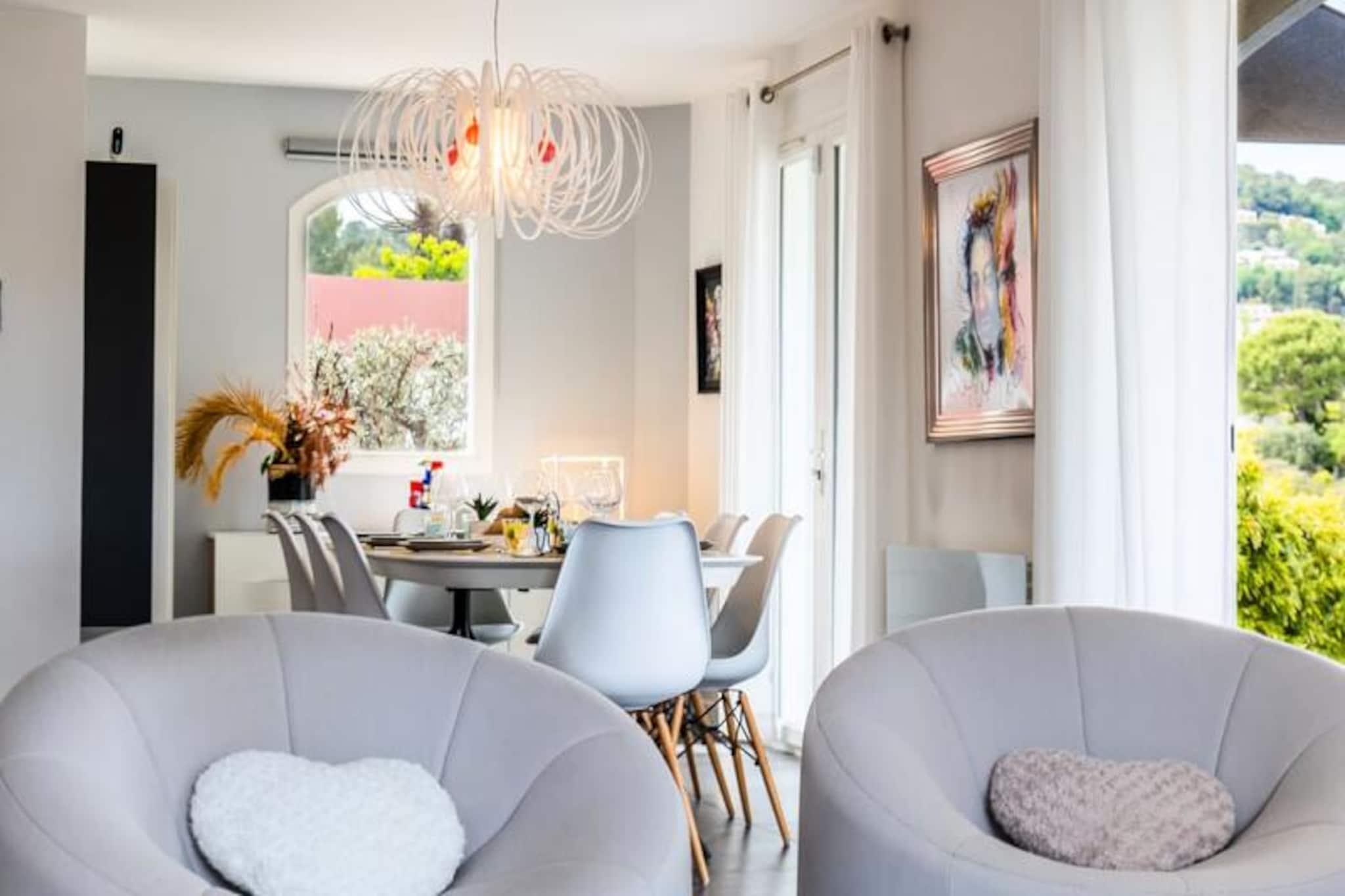 Beliggende i de fredfyldte bakker over Golfe-Juan og Vallauris tilbyder denne fantastiske villa et stykke paradis på den franske riviera. Omgivet af frodigt grønt og soler sig i middelhavssolen, er det det perfekte tilflugtssted for familier eller vennegrupper, der søger ro og luksus. Med en betagende udsigt og en fredelig atmosfære inviterer denne ejendom dig til at slappe af og omfavne charmen ved Côte d'Azur-livet. Villaen kan prale af fem smukt indrettede soveværelser og tre moderne badeværelser, hvilket sikrer rigelig plads og komfort til op til ti gæster. Den åbne opholdsstue er et mesterværk af design med store karnapvinduer, der oversvømmer rummet med naturligt lys og problemfrit forbinder til de udendørs terrasser. Et fuldt udstyret køkken med en central køkkenø gør madlavning til en fornøjelse, mens opholdsstuen med et Smart TV og brætspil tilbyder underholdning for alle aldre. Master-suiten i stueetagen tilbyder en privat oase, komplet med et påklædningsværelse og eget brusebad. Ovenpå sikrer yderligere soveværelser, inklusive et charmerende børneværelse, at alle føler sig hjemme. Gå udenfor for at opdage flere terrasseområder designet til afslapning og socialisering. Fra den sydvendte terrasse med udsigt over poolen til den hyggelige lounge med dagsenge og spisepladsen til ti personer er hvert hjørne skabt til uforglemmelige øjeblikke. Den private pool, liggestole og grill sætter scenen for dovne eftermiddage, mens petanquebanen tilføjer et strejf af lokalt præg. Uden støj udefra, der forstyrrer din fred, vågner du til den blide lyd af fuglesang og cikader. Denne villa ligger kun få minutter fra strandene i Golfe-Juan og Cannes og er perfekt placeret til at udforske det bedste af Rivieraen. Uanset om du slentrer langs Croisetten, spiser i Juan-les-Pins eller besøger de charmerende landsbyer Biot og Valbonne, er regionens skatte lige ved hånden. Med nem adgang til Nice Côte d'Azur Lufthavn og en concierge-service, der imødekommer dine behov, lover denne villa en luksuriøs og mindeværdig ferie.