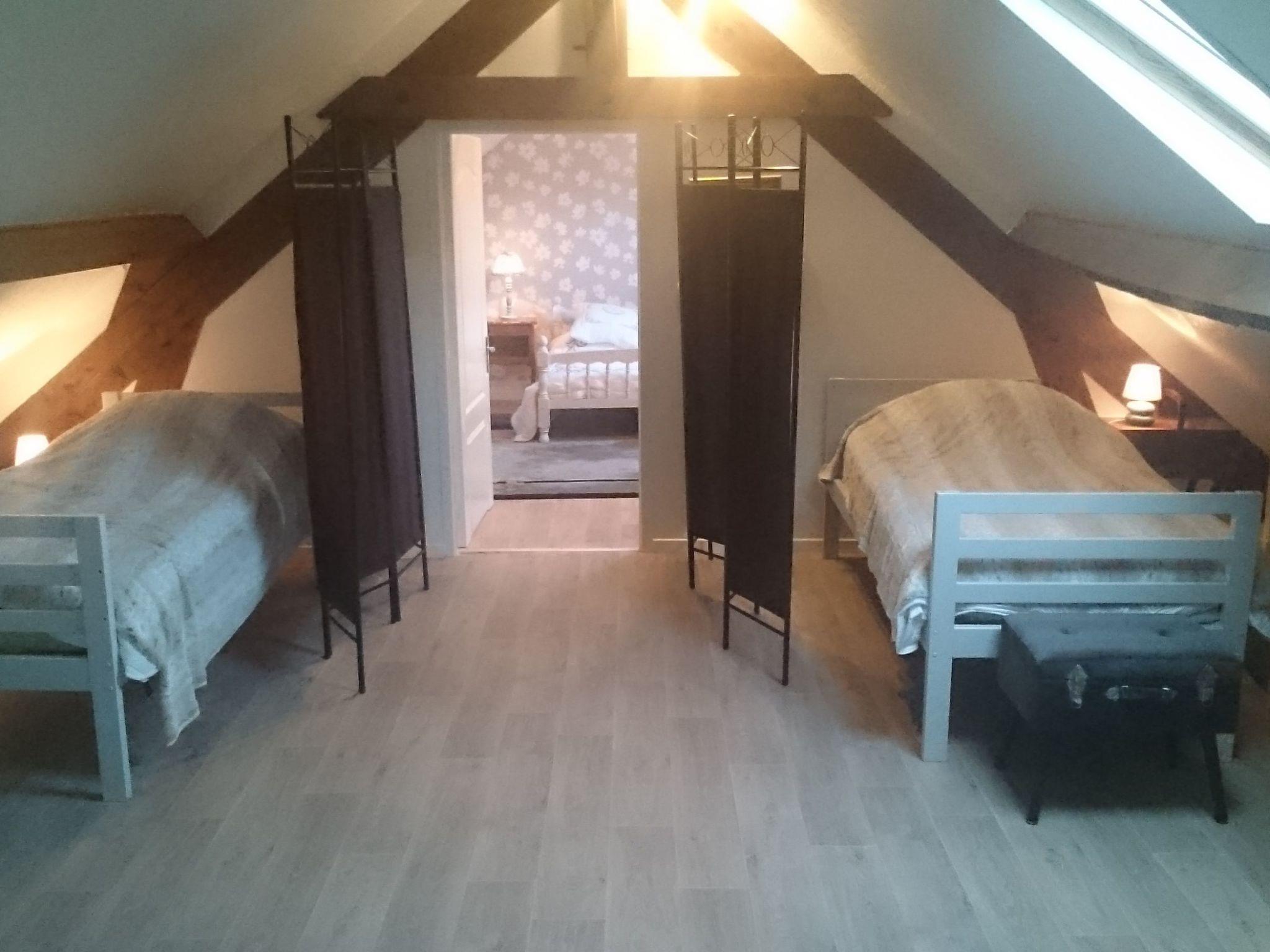 Sleeping accommodation: 1.40m bed, two 0.90m single beds, a sofa bed or camp bed. Pillows, duvets and blankets are provided, as well as soap and shampoo. Table football, darts, 4/21 dice, exercise bike, TV, radio. Grandma's crockery and kitchen utensils. The extra bed is a heated bed or a camp bed (see photo) on which a deckchair mattress can be added. A barbecue and garden table are available on request.