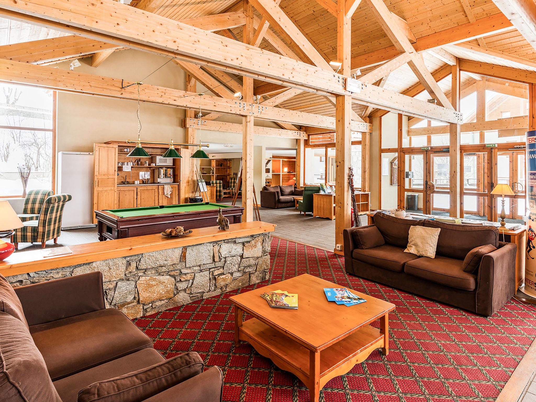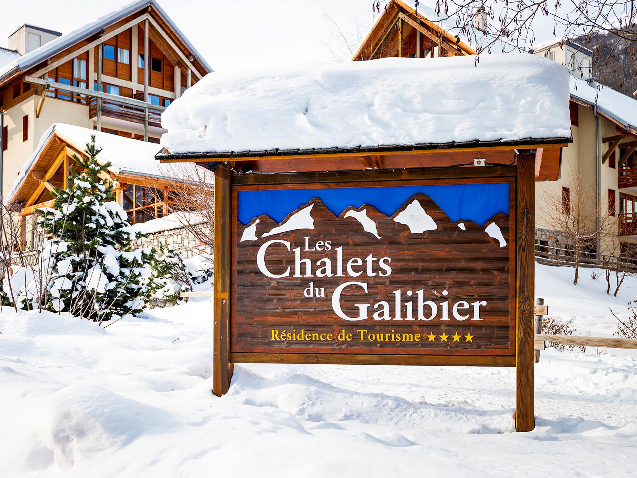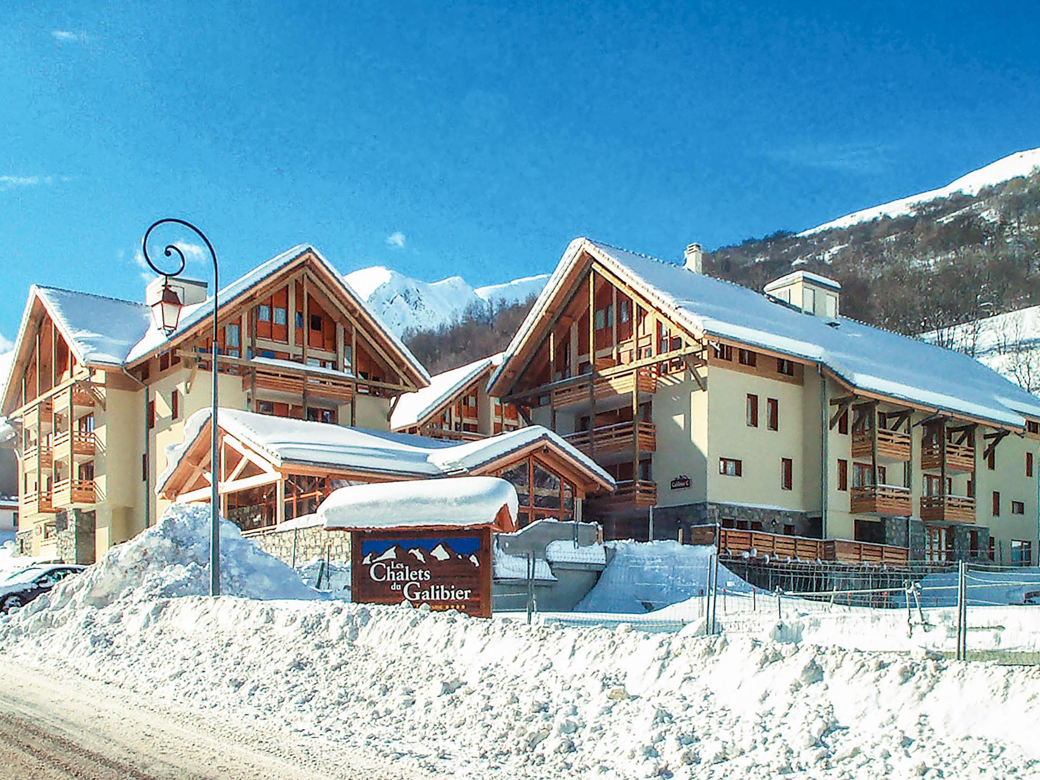 Cosy, rustic residence "Les Chalets du Galibier". 10 houses in the residence. 800 m from the centre of Valloire, 200 m from the skiing area. For shared use: 2 swimming pools, indoor pool heated (6 x 8 m, seasonal availability: 15.Dec. - 10.Apr. pool opening hours: 10:00-19:30). Shower/WC in the pool area. In the complex: reception, lounge, sauna (extra). Steam room (extra). Billiard table, lift, storage room for skis, washing machine (extra), tumble dryer (extra). Bread roll service (extra). Parking (extra). Parking space or garage only for small to medium-sized cars. Dimension: height 190 cm. Shop 800 m, bus stop "Saint-Michel-de-Maurienne" 12.2 km. Slopes 200 m, ski bus stop 10 m. Well-known ski regions can easily be reached: Valmeinier 12 km, Saint-Jean-de-Maurienne 30 km. Please note: reception open 17:00-20:00 hrs. Please note: the photograph shows a typical example. The holiday properties may differ in living space, floorplan, equipment and furnishing.
