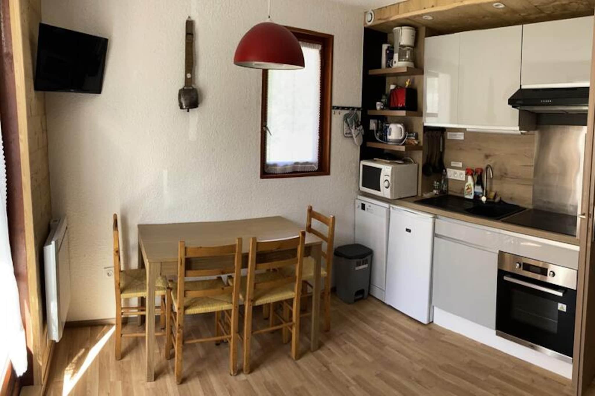 Midt i Valloires charmerende gader tilbyder denne hyggelige lejlighed et indbydende tilflugtssted for dine alpine eventyr. Uanset om du besøger den om vinteren eller sommeren, placerer dens centrale beliggenhed i Clos des Etoiles dig kun få skridt fra landsbyens hjerte, hvor lokale butikker, restauranter og aktiviteter venter. Forestil dig morgener tilbragt med at nippe til kaffe på din vestvendte balkon, med frisk bjergluft og udsigt over de omkringliggende tinder, der sætter tonen for en dag med udforskning. Denne bolig er perfekt til par eller små familier, der søger en komfortabel og bekvem base i de franske alper. \n\nIndvendigt er lejligheden omhyggeligt designet til at maksimere komfort og funktionalitet. Soveværelset har køjesenge, mens stuen har en sovesofa med plads til op til fire gæster. Tekøkkenet er fuldt udstyret med moderne apparater, herunder induktionskogeplade, køleskab, fryser, ovn, mikrobølgeovn og opvaskemaskine, hvilket gør det nemt at tilberede måltider efter en dag på pisterne eller stierne. Badeværelset er udstyret med bruser, håndvask, vaskemaskine og hårtørrer, hvilket sikrer alle de nødvendige faciliteter til et afslappende ophold. Wi-Fi og et tv sørger for underholdning på roligere aftener, mens skiboksen og den fælles parkering gør dit besøg mere praktisk. \n\nOm vinteren ligger Crêt de la Brive-svævebanen og skiskolens mødested kun 280 meter væk, hvilket giver problemfri adgang til Valloires berømte skiløjper. Om sommeren ligger fritidscentret med swimmingpool, skøjtebane og wellness-område kun 220 meter væk, mens der er en legeplads inden for en kort gåtur på 400 meter. Uanset om du cykler gennem frisk puddersne eller nyder solrige eftermiddage ved poolen, henvender denne beliggenhed sig til enhver årstids fornøjelser. \n\nMed sin blanding af komfort, bekvemmelighed og nærhed til Valloires attraktioner lover denne lejlighed en uforglemmelig alpin ferie. Lad charmen fra de franske alper og den indbydende atmosfære i Clos des Etoiles skabe varige minder til din næste ferie.