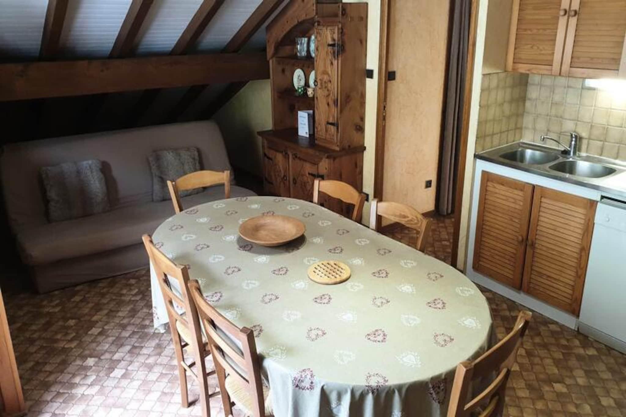 Midt i Valloires maleriske charme inviterer denne rummelige hytte dig til at opleve de franske alpers skønhed i enhver sæson. Uanset om du er dækket af sne eller solbader i sommersolen, sikrer hyttens centrale beliggenhed, at du kun er få skridt fra landsbyens pulserende hjerte, der tilbyder både bekvemmelighed og en varm alpin atmosfære. Med sit hyggelige loftsdesign og gennemtænkte faciliteter er dette tilflugtssted perfekt til familier eller grupper, der søger en mindeværdig bjergferie. \n\nChaleten har komfortabel plads til op til seks gæster fordelt på sit soveværelse på loftet og hytten, med fleksible sovepladser med bløde dyner for ekstra komfort. Opholdsstuen, badet i naturligt lys, kan prale af et tekøkken udstyret med moderne apparater, en lounge med tv og Wi-Fi samt en balkon med nordvestvendt udsigt over de omkringliggende tinder. Efter en dag med eventyr kan du slappe af i badeværelsets badekar eller nyde den fælles have, komplet med en gynge og havemøbler til afslappende sommeraftener. \n\nOm vinteren ligger Crêt de la Brive-svævebanen og skiskolens mødested kun 430 meter væk, hvilket gør det nemt at få adgang til pisterne og skifaciliteterne. Sommeren forvandler området til et fristed for afslapning, med det nærliggende centrum, der tilbyder en swimmingpool, skøjtebane og wellness-område kun 290 meter fra din dør. Lokale butikker, restauranter og aktiviteter sikrer, at du har alt, hvad du behøver, inden for gåafstand. \n\nUanset om du er tiltrukket af spændende alpine sportsgrene eller rolige sommerture, tilbyder denne hytte den perfekte base for at udforske Valloires fortryllende landskaber. Skab uforglemmelige minder i omgivelser, hvor bjergene møder charmen fra en traditionel fransk landsby.