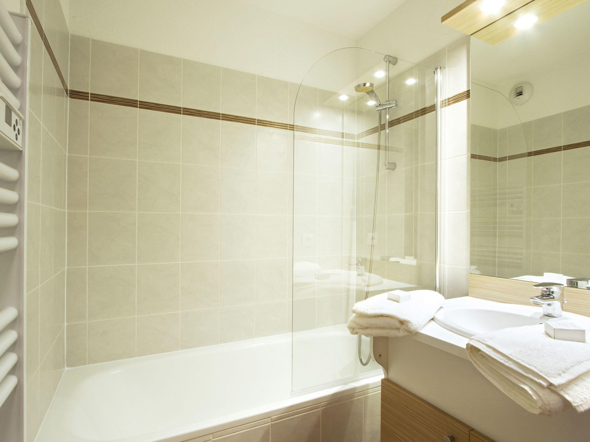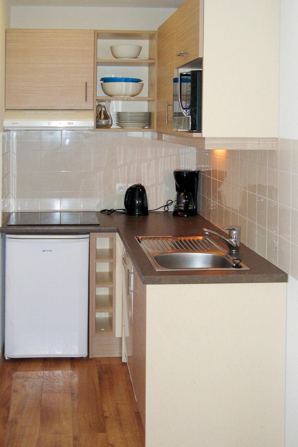"Odalys Référence Le Grand Panorama 1", 3-room apartment 35 to 40 m2. Rustic furnishings: living/sleeping room with 1 sofabed, 1 pull-out bed, dining table and TV (flat screen). Exit to the balcony. 1 room with 1 french bed (140 cm, length 190 cm). 1 room with 1 x 2 bunk beds. Open kitchen (dishwasher, 4 ceramic glass hob hotplates, toaster, kettle, electric coffee machine, combination microwave). Sep. WC, bath or shower. Electric heating. Small balcony or small terrace. Facilities: children's high chair, baby cot (extra). Internet (WiFi, free). Please note: non-smokers only. Maximum 1 pet/ dog allowed. Smoke alarm.