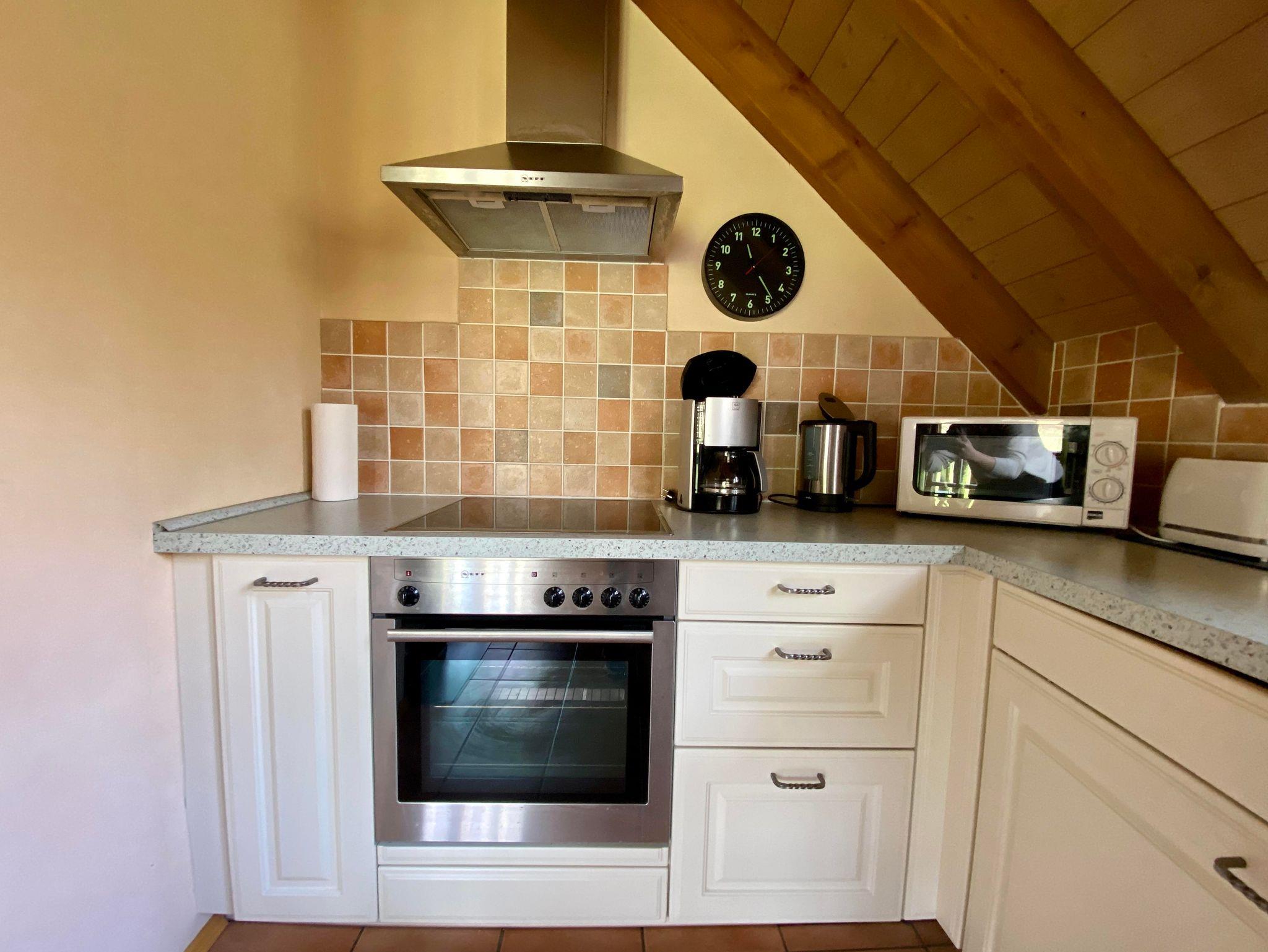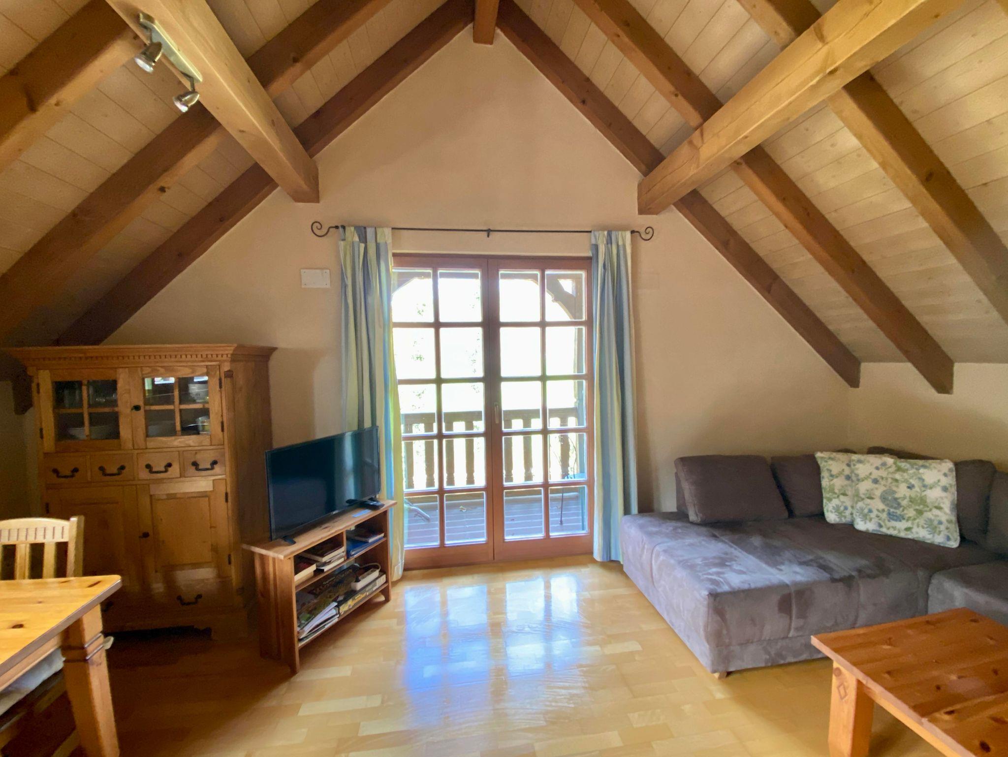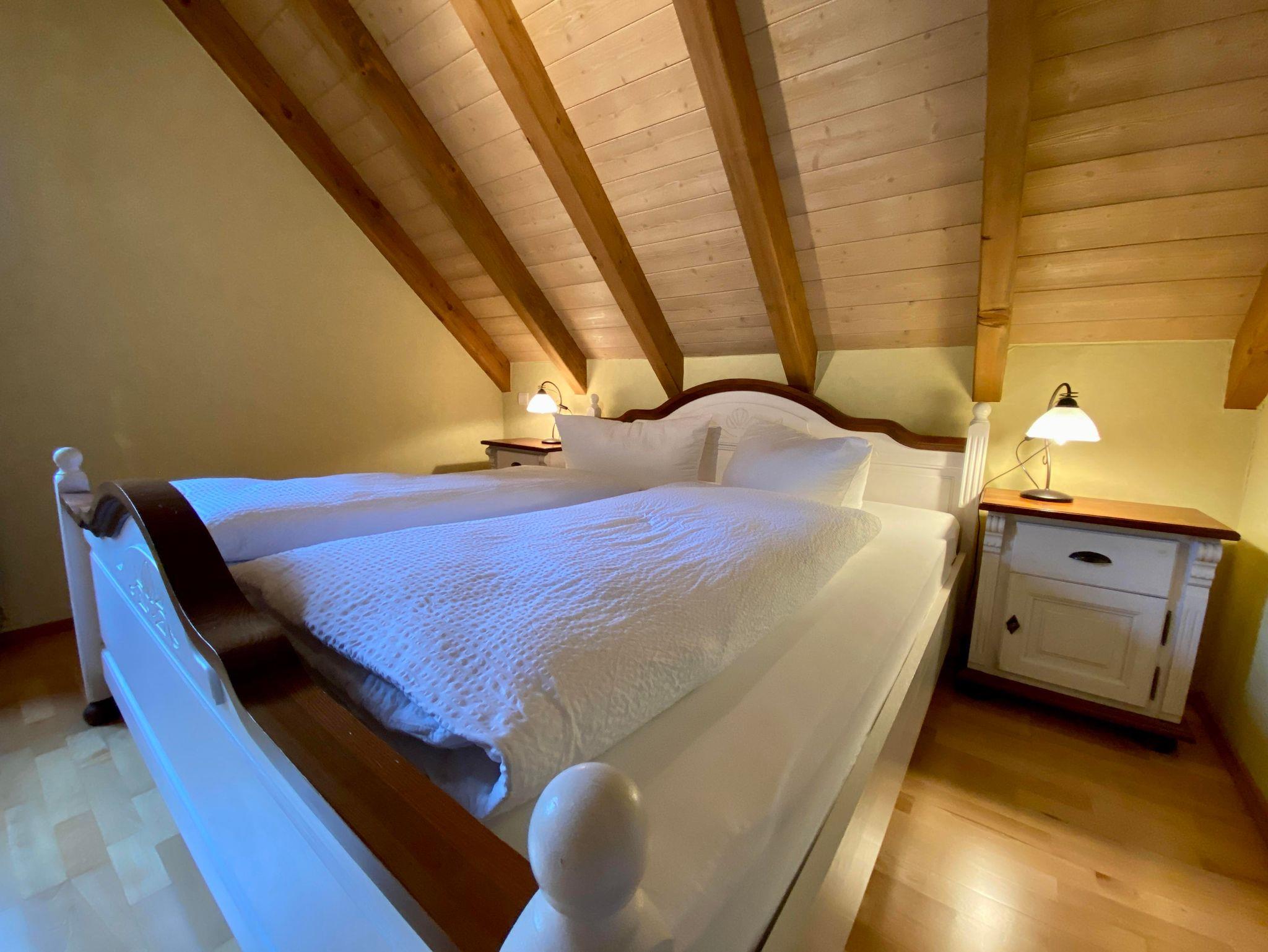 Die Wohnung ist für 2-4 Personen geeignet. Sie besteht aus einer großen Wohnküche mit offenen Dachbalken, einem separaten Schlafzimmer, Bad sowie einer Schlafnische mit Dachfenster. Die Räume haben durchgehend Parkettböden.