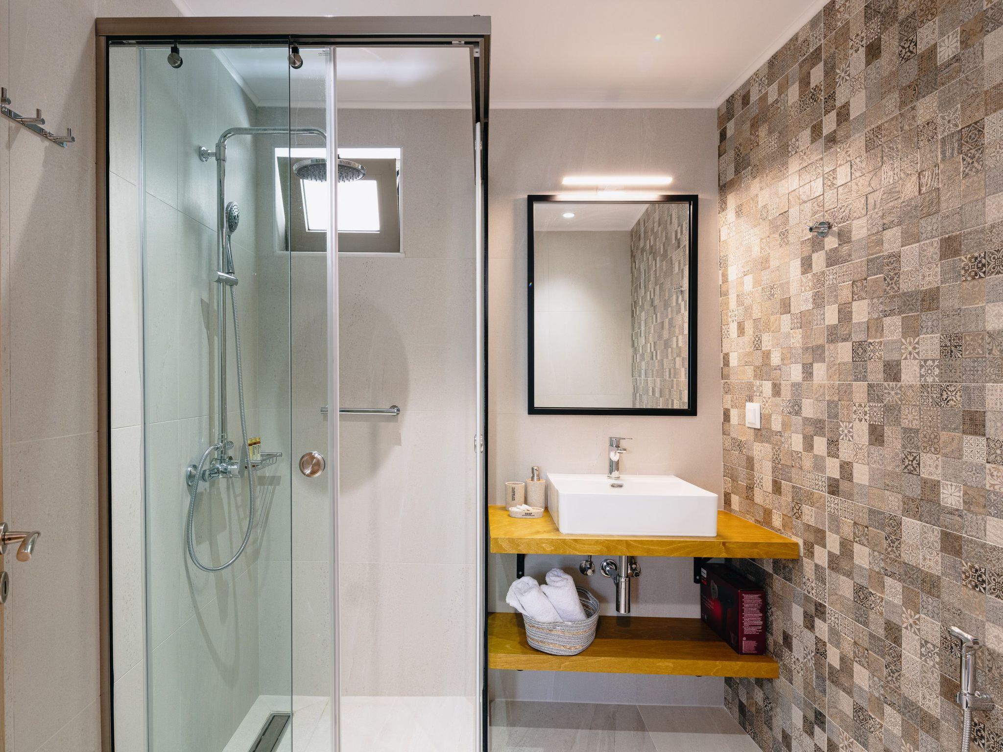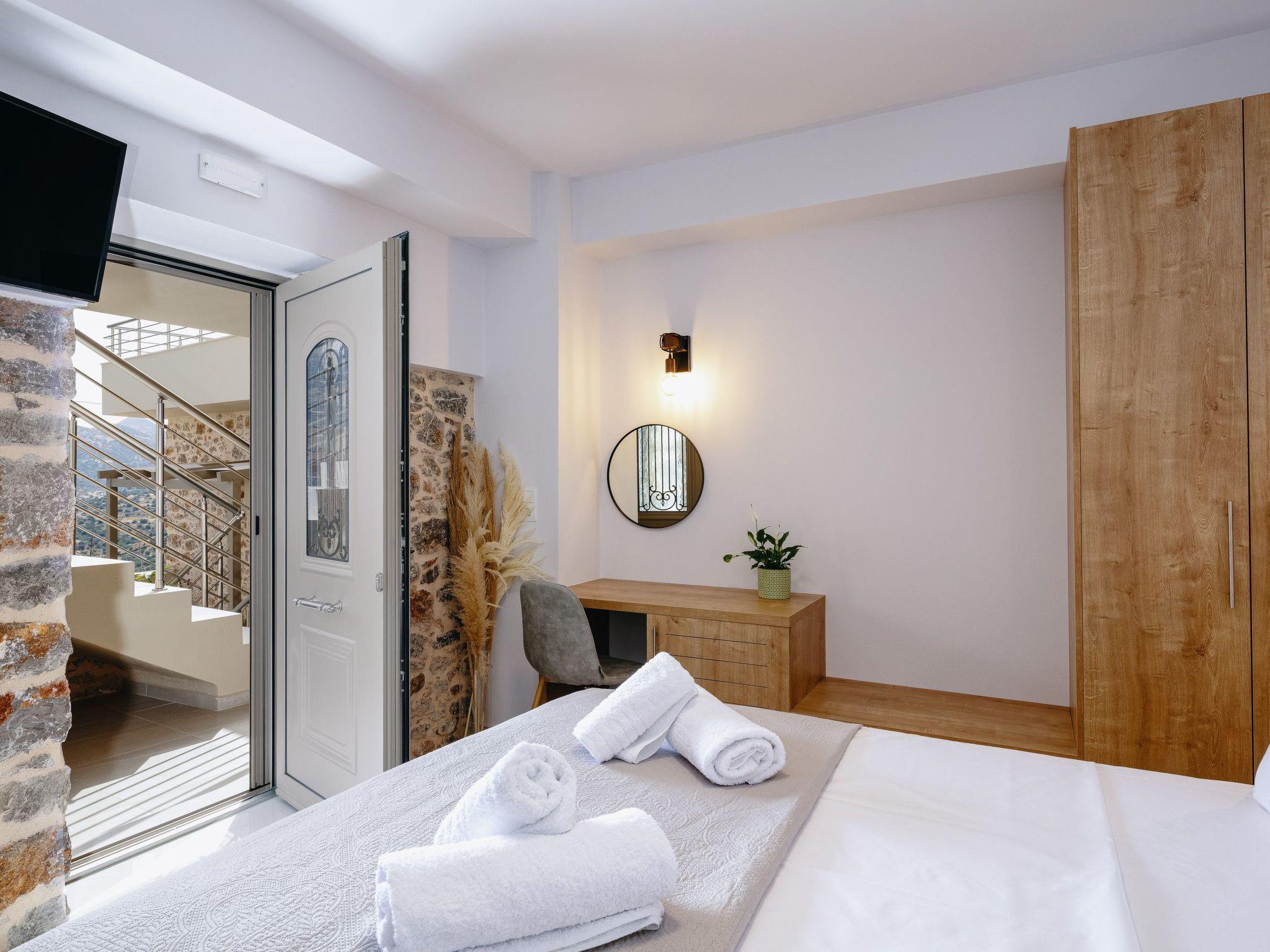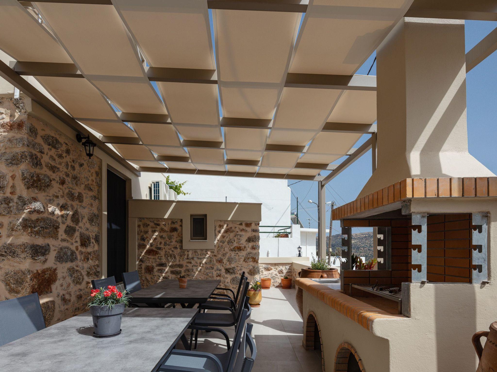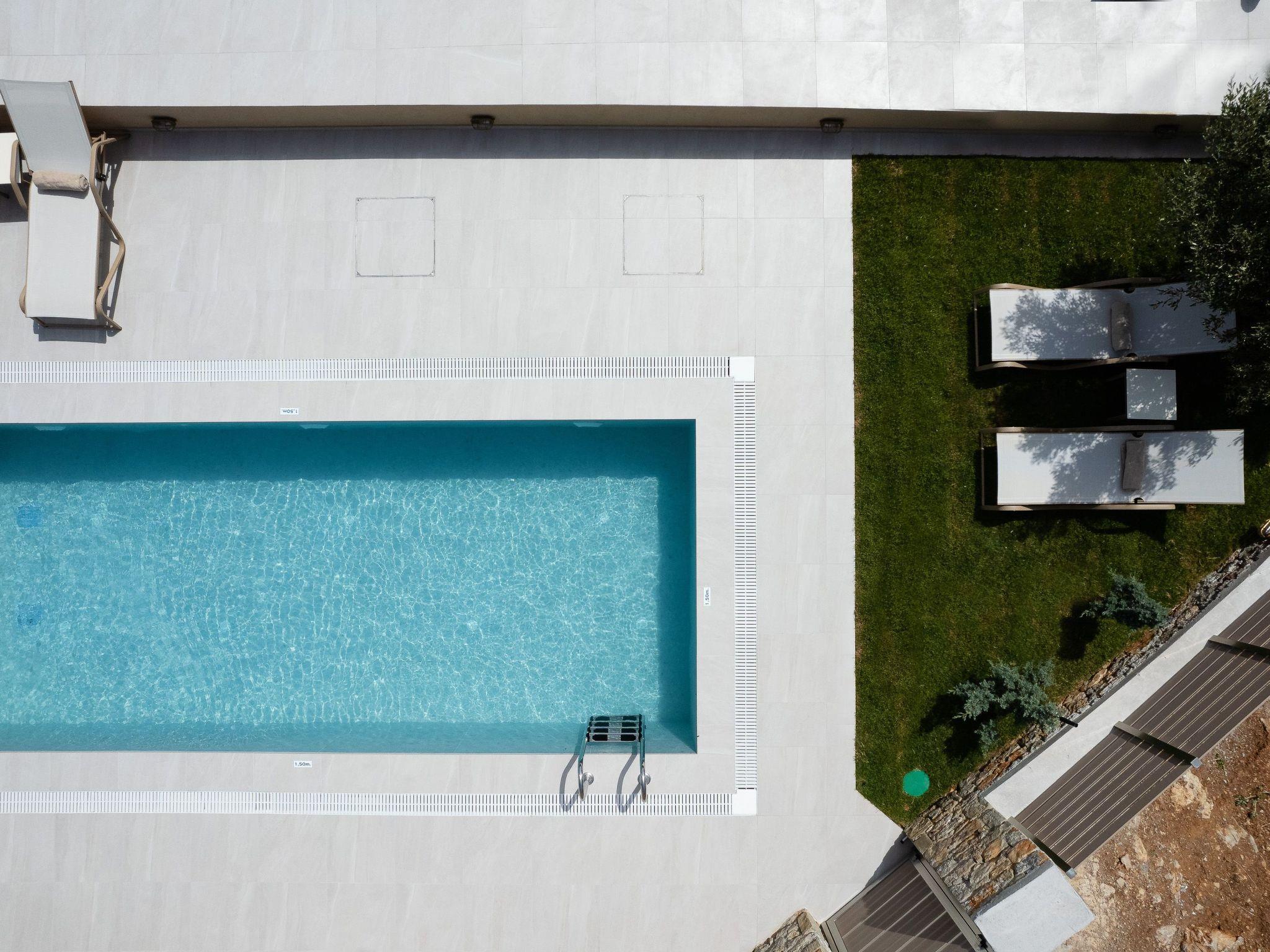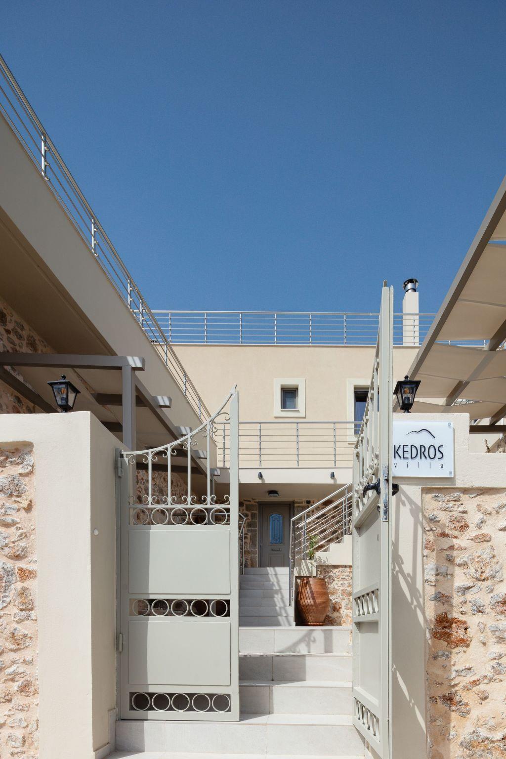 The outdoor area of Kedros Villa is nothing short of breathtaking, designed to offer ultimate relaxation and awe-inspiring panoramic views of the mountains. The focal point is the private outdoor swimming pool, surrounded by a terrace with comfortable sunbeds, umbrellas, and an outdoor shower. Additional features include various furnished relaxation spots, a shaded pergola with an outdoor barbecue, a sink, dishes, utensils, and a large dining table. The whole area is fenced, providing 100% privacy through a private entrance with a gate. Conveniently, free street parking is available just a few meters away from the villa.