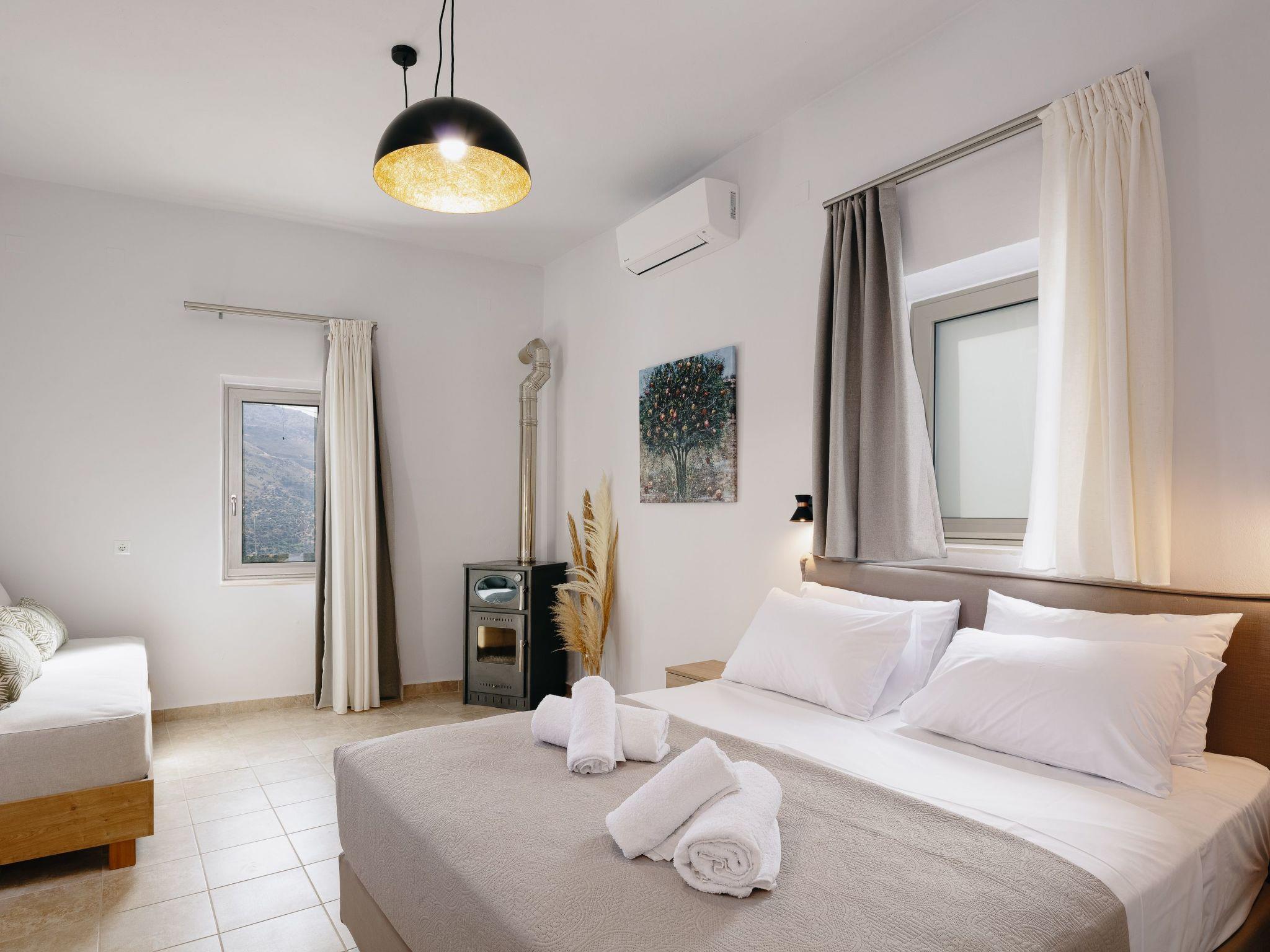 Kedros Villa, nestled in this serene landscape, offers a luxurious interior designed for comfort and elegance. The villa features master bedrooms on its lower and upper levels, each equipped with a large double bed, a private sitting area with an indoor fireplace, a sofa, HDTV, and an ensuite bathroom with a shower. For flexibility and convenience, one of the bedrooms can be adjusted to feature a king-size bed upon request. The ground floor embraces an open plan area that combines a fully-equipped kitchen with a welcoming terrace, ensuring every home comfort is met.