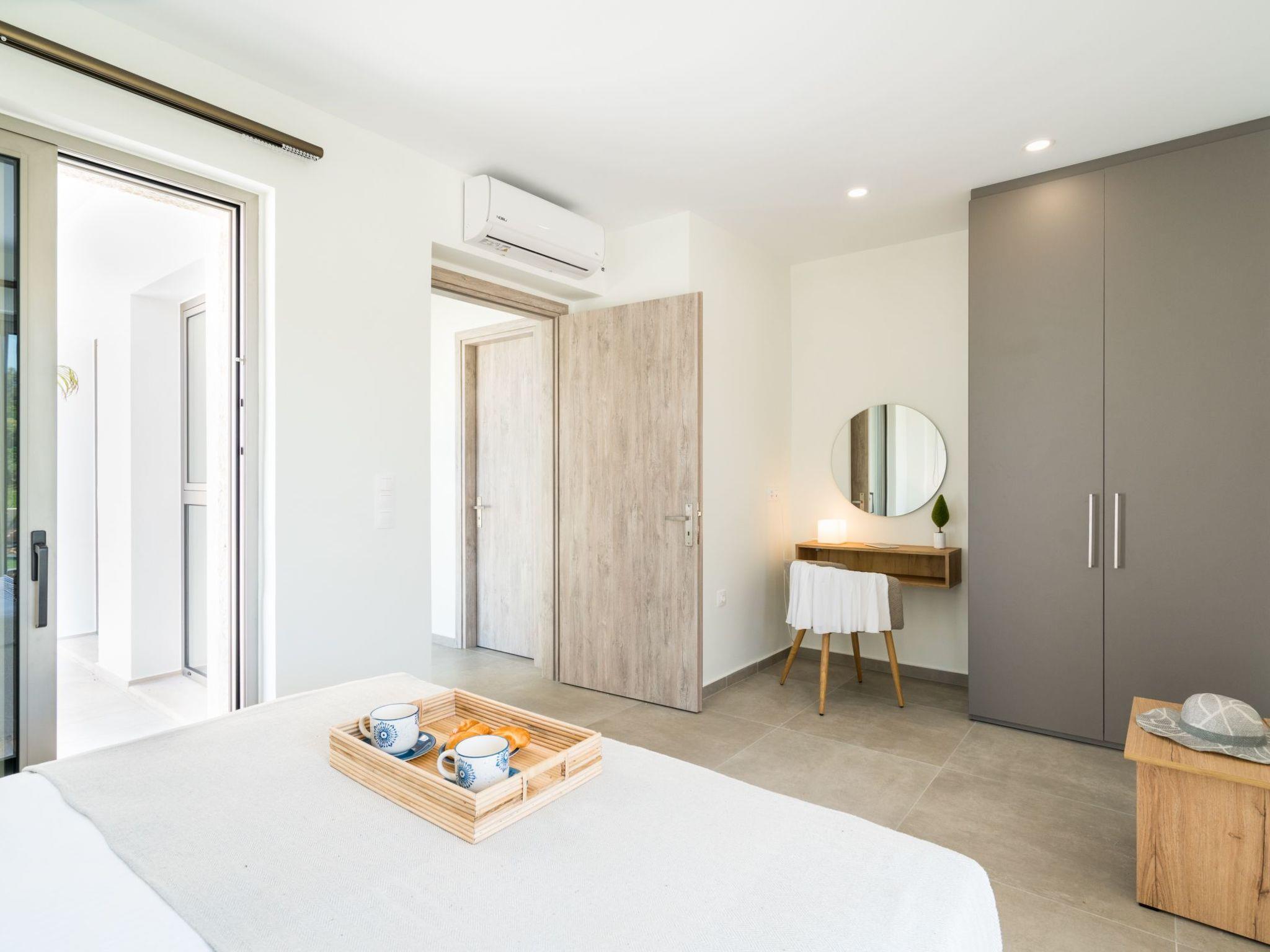 Nymphes villa is an architectural wonder with large garden and can accommodate with comfort up to 7 guests in its 3 spacious bedrooms and 3 en suite bathrooms. Two of the bedrooms area double bedded and one of them is twin bedded. The two bedrooms in each villa are located on the first floor offering an amazing sea view from their balconies and the other one is located on the lower ground floor. The main house area has a cozy living room with large window doors, flat screen TV, air condition and Wifi. The kitchen is fully equipped and the dining area has a large table. On the lower ground floor there is a laundry room for your needs and also there is free parking area at the house.