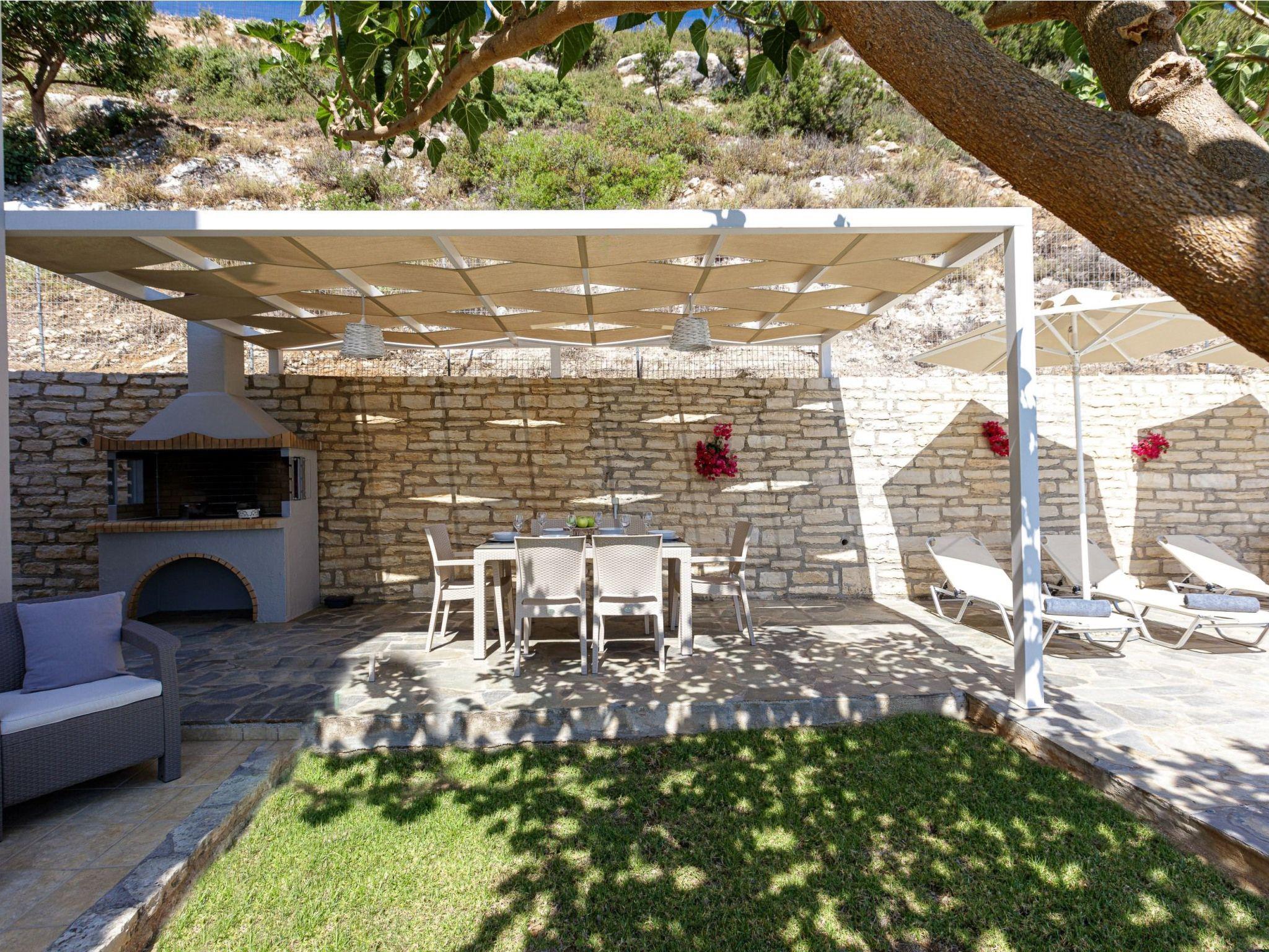 Villa Morfeas is a recently built holiday villa that reflects a relaxing local atmosphere, due to its position, construction and service. It’s the villa’s amazing views and the private pool that visitors remember most, as they take a seat on the shady terrace where you’re likely to be distracted from your lunch by the views of the high mountains and the vast sea. Divided in two levels, Villa Morfeas can accommodate in comfort up to 8 guests in three decent bedrooms with views across the countryside to the sea. The open plan living area, which consists of a living room with a fireplace and a fully equipped with a dining table, offers direct access to the pool terrace. Outdoors, Villa Morfeas has a 25 m2 private swimming pool with comfortable sun beds is commanded by the awesome views while at night time, its amazing lighting creates a romantic, almost magical atmosphere. The fenced gardens are perfect for children to roam free and play around the terrace, while the lawns a great for athletic purposes or activities such as yoga and games. Additionally, next to the pool terrace you will find the BBQ facilities, as well as outdoor dining table for the whole family, giving you the chance to enjoy your homemade meals in the fresh air while gazing the stunning sea views and enjoy al fresco dining!
