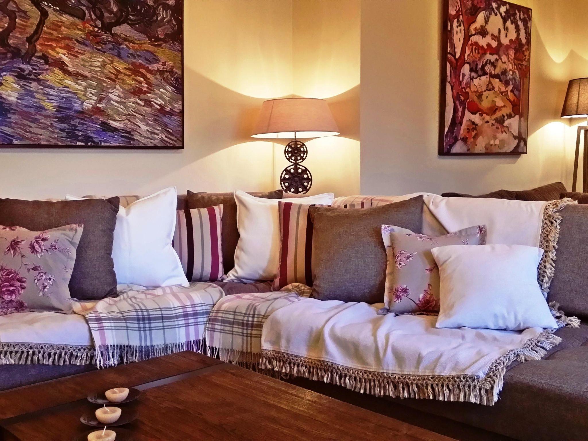 Inside, Villa Agape combines country-chic aesthetic with affordable luxury. The house accommodates guests comfortably in two double bedrooms and one single bedroom, supplemented with complimentary bedding to ensure a restful sleep. Additionally, two bathrooms— including one with a contemporary shower cabin and free toiletries—cater to all your refreshment needs. The heart of the home lies in its spacious living area that houses two sofa beds for extra guests, a cozy fireplace, and a mini-bar. A collection of books on various subjects and a well-equipped kitchen provide everything necessary for leisure and living.
