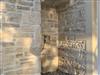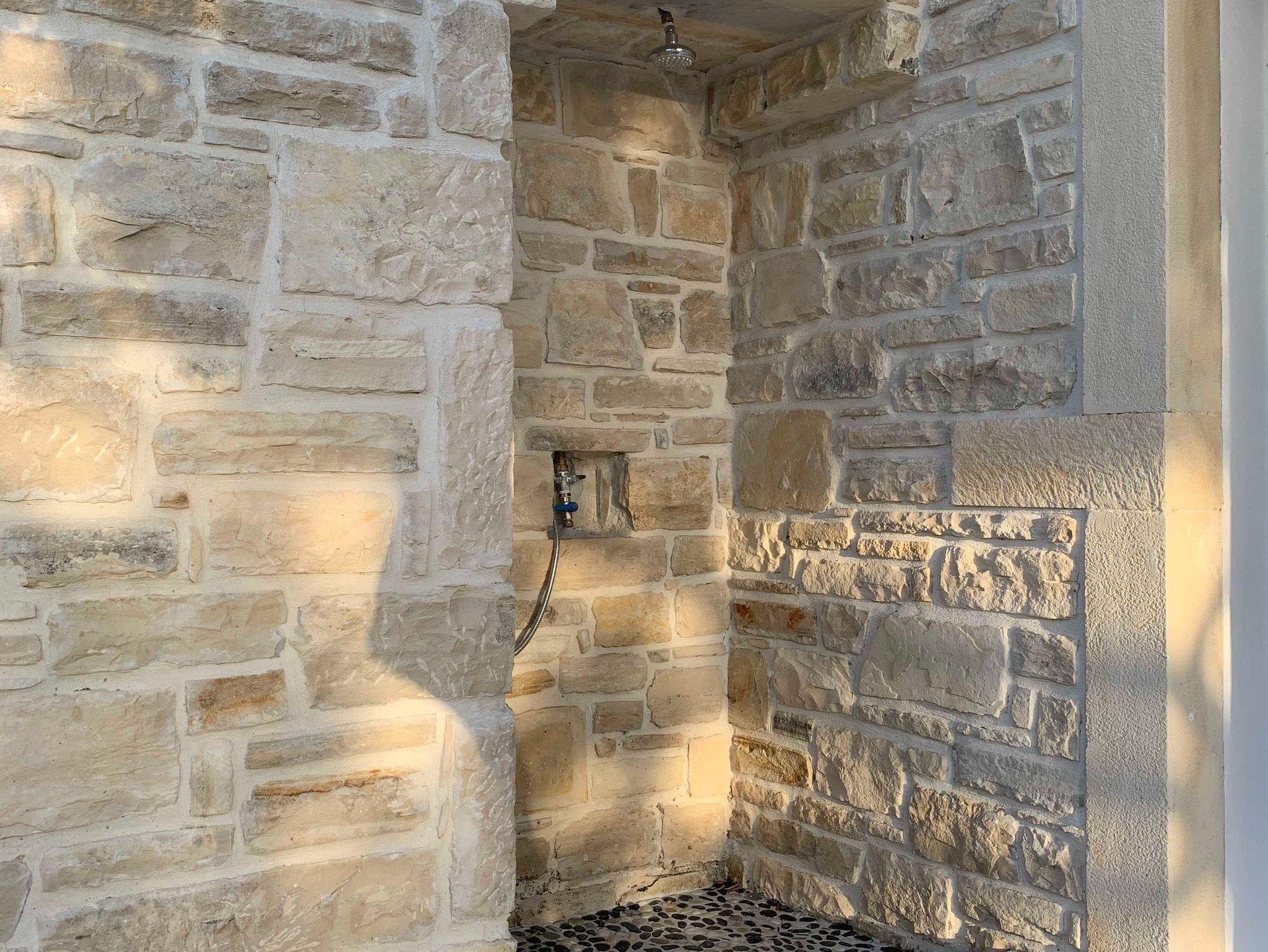 Eine in das Mauerwerk und mit Mosaikboden ausgestattete Außendusche lädt zum Abkühlen oder Abduschen nach einem Strandgang ein.