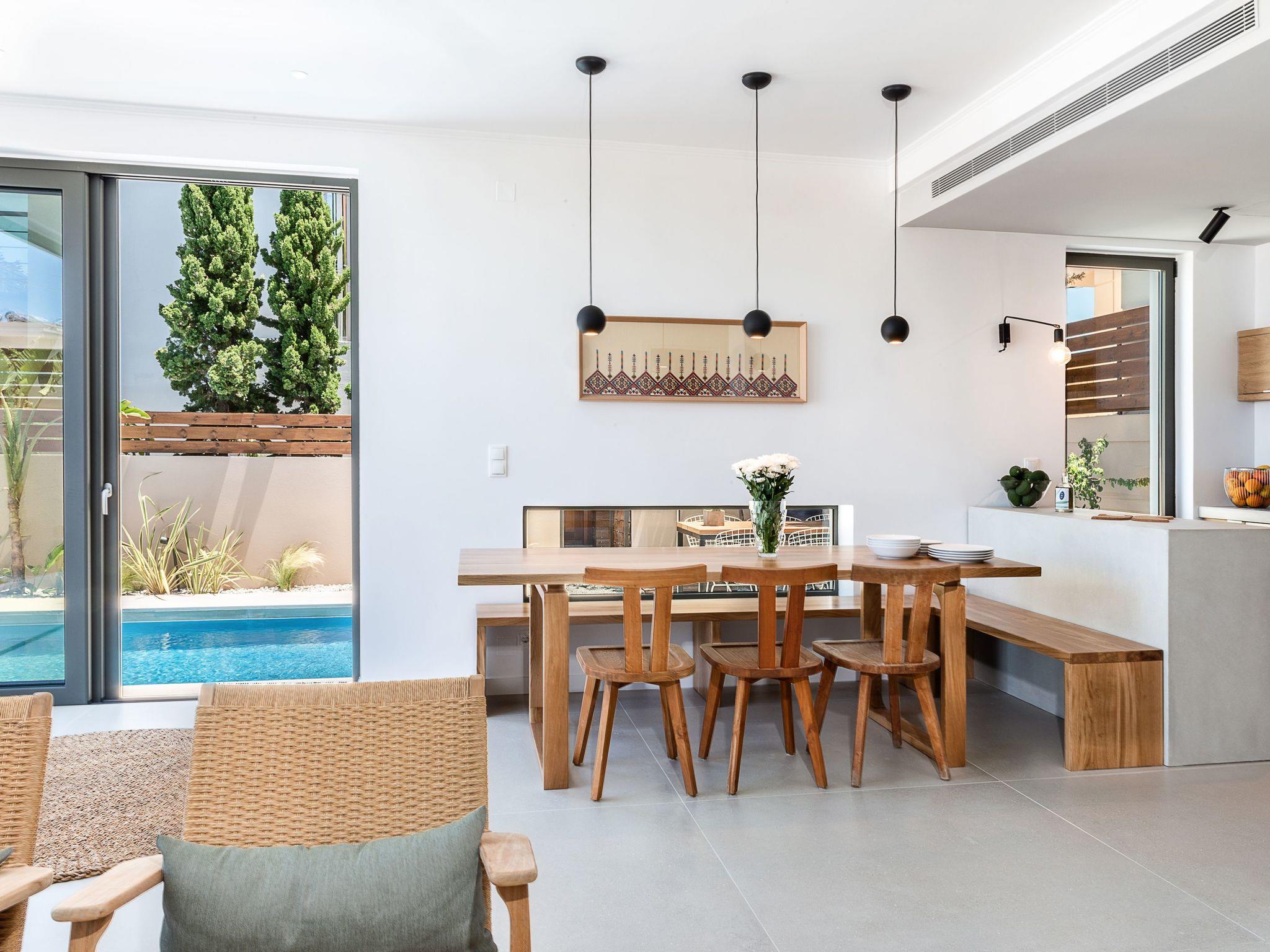 Fos Villa is a brand new house located at the entrance of Galatas village and enjoys views of the Mediterranean sea, Ag. Theodori island and Chania town. The villa is designed and decorated by the owner and architect Christini Polatou. The Villa consists of a basement looking in a patio, a ground floor, a first floor and a top floor a total of 185m2. Also, the outdoor space includes a 150m2 free space and garden with a 30m2 swimming pool.