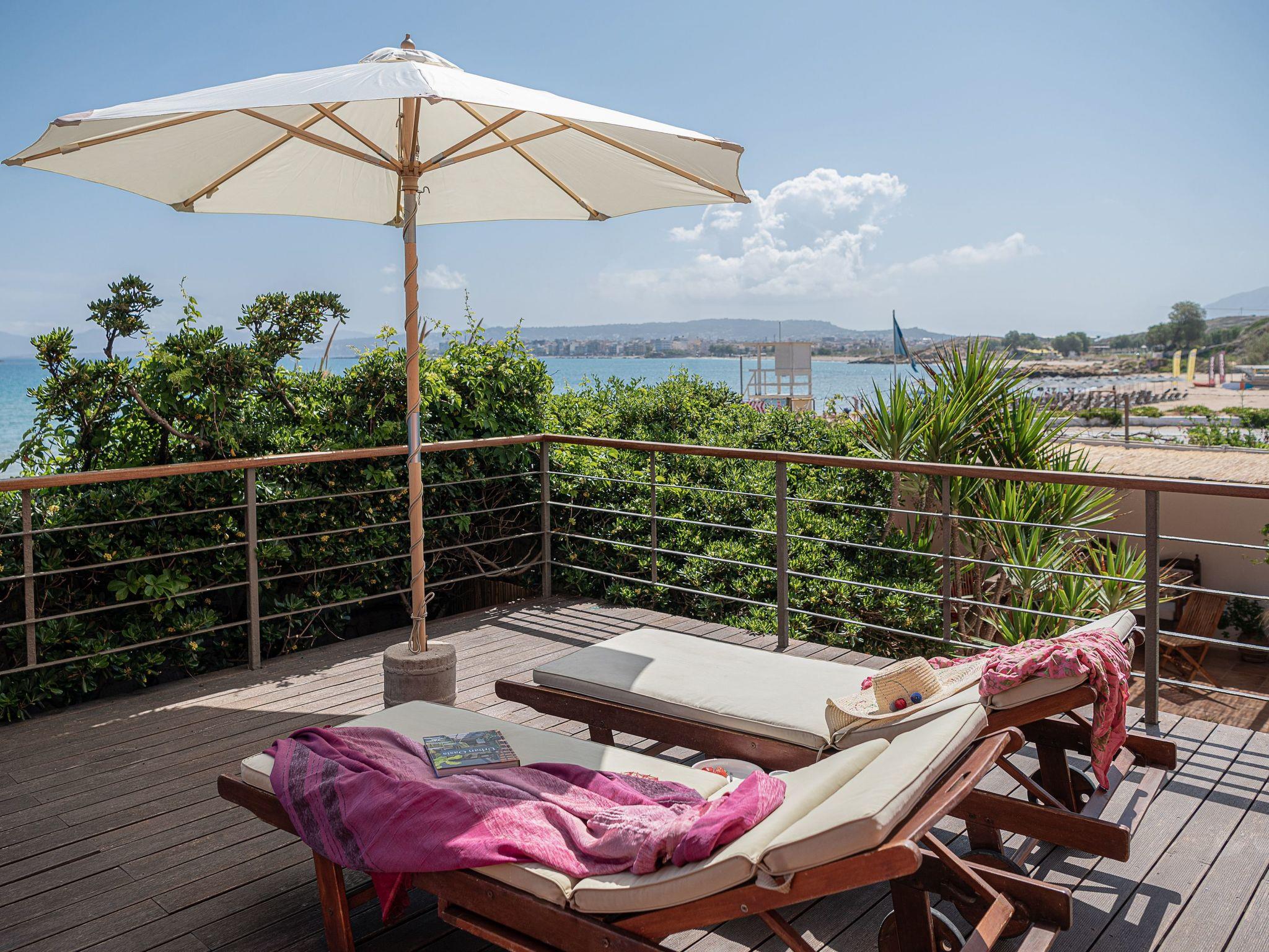 “The House by the Sea” - a stylish and relaxed family-friendly beach house near Chania in Crete, in a lovely position, situated behind the middle of Chrissi Akti Beach, only a few steps away from the sand..Designed to provide the ultimate in convenience and privacy, for a unique stay, this summer getaway is the perfect place for guests to escape the hustle and bustle of everyday life in a unique holiday ambience.From most of the spacious rooms the panoramic views across the Mediterranean sea, to the small island of Lazaretta and the town of Chania, is breathtaking. The traditional main building, is strategically located area, just in the front of the sandy beach and has been carefully renovated to preserve its character.There are two apartments with a shared courtyard and garden and rented together.The whole villa can be booked only by one guest, one family, or two friend-families or relatives, but only by one booking.Both apartments are furnished and decorated with romantic style. The prospect of a totally relaxing holiday in Crete close to nature is completed by the beach, patio and garden. Scheduled flights to Athens arrive daily from just about everywhere. You can then either fly on to Crete or take the overnight ferry. Aegean Air is generally a bit cheaper than Olympic for the domestic hop Athens-Chania, and you can book online.We can arrange for a taxi or hire car to meet you at Chania airport or Souda ferry port.Chania airport is about 30 minutes drive from Chrissi Akti Ferries:If you fly to Athens airport there is a bus to Piraeus (the port of Athens) which takes about an hour, or you can take a taxi. Make sure your flight arrives in time to get to the port.The ANEK line ferries usually leave Piraeus at 21.00 and arrive at Souda (The port for Chania) at 05.30 am the next day. The return ferry leaves Souda at 21.00 and arrives at Piraeus at 05.30.They are very comfortable and you can book a cabin.Souda is about 10 minutes' drive from Chrissi Akti.Walking from the house to Chania town:Continue along the beach of Chrissi Akti, through Aptera beach, continue along the beach of Nea Chora and arrive at the Firkas Fort in the Old TownIt is a very nice bike ride.Finding us by busBuses start at “Nea Katastimata” square, and it is about 10 minutes' ride to the house.The bus stop in Chrissi Akti is 50m from the house (Chrissi Akti station)