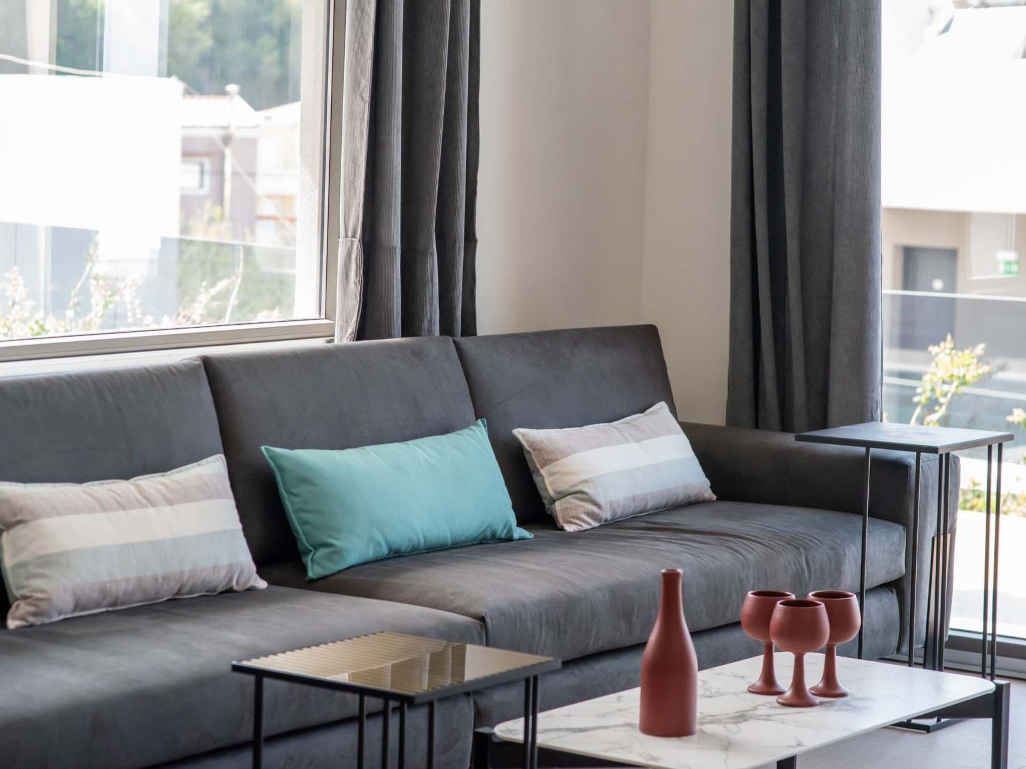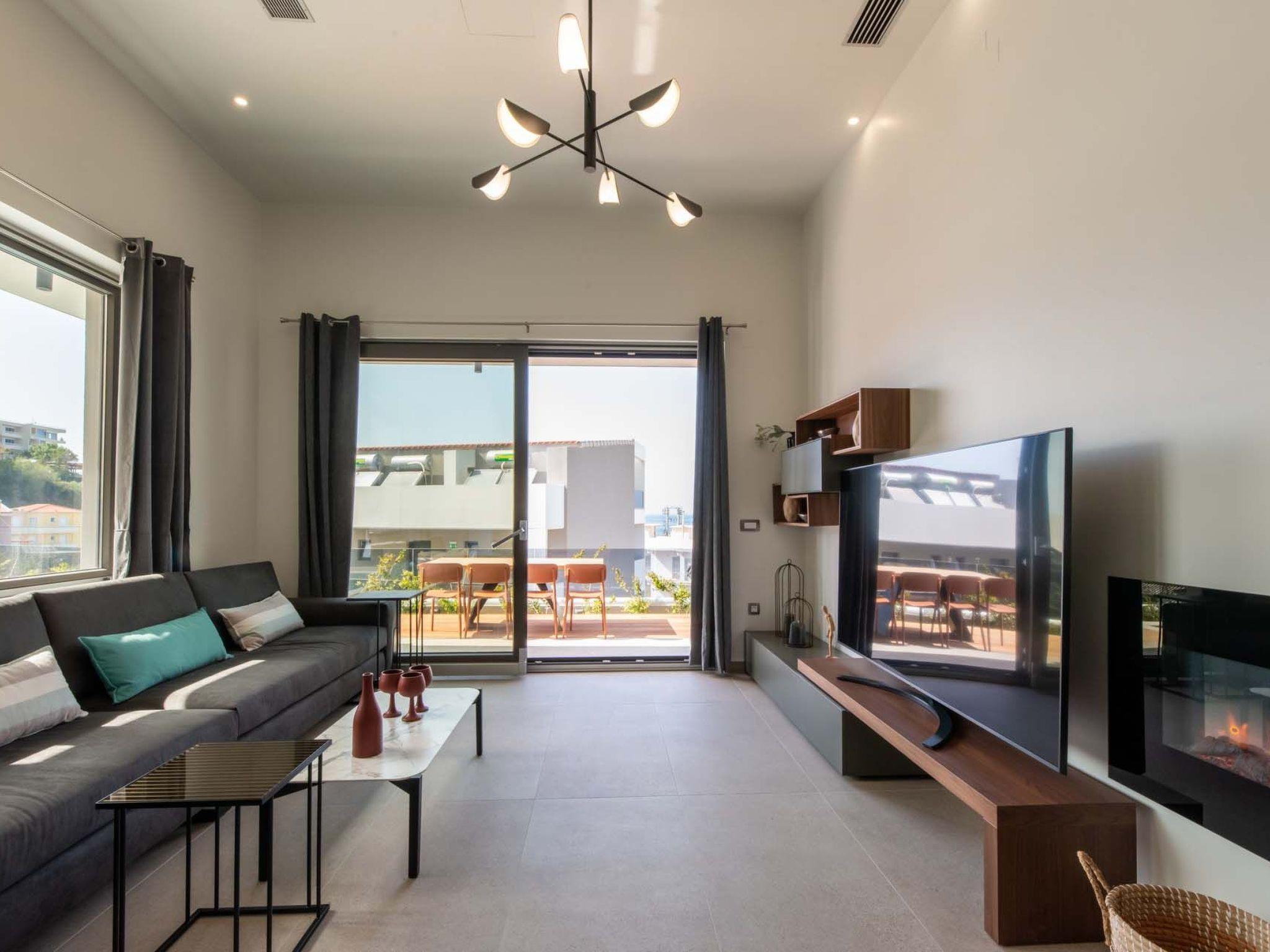 Living area with sofa, 60’’ satellite Smart TV, electrical fireplace, access to the pool terrace, sea view