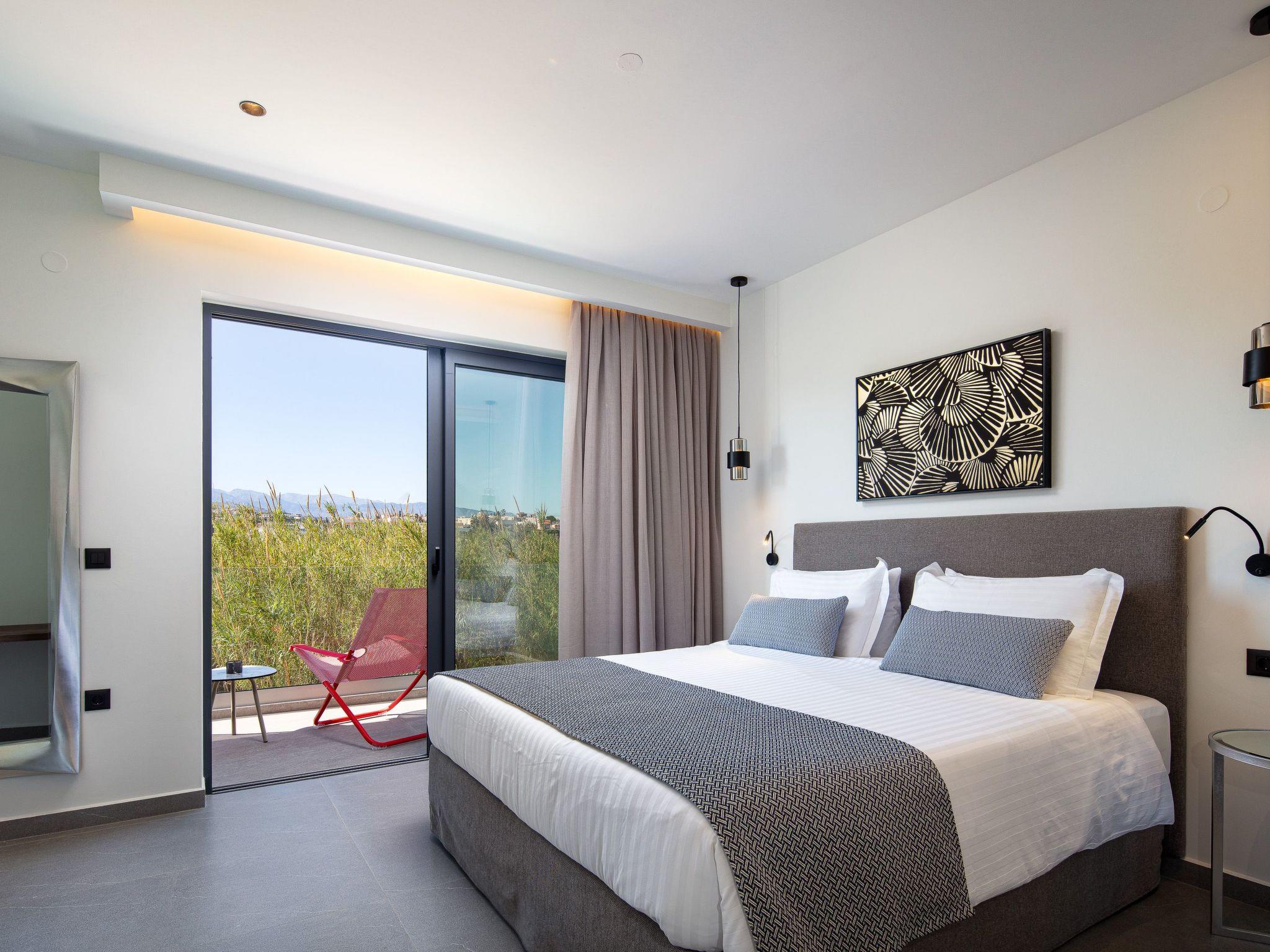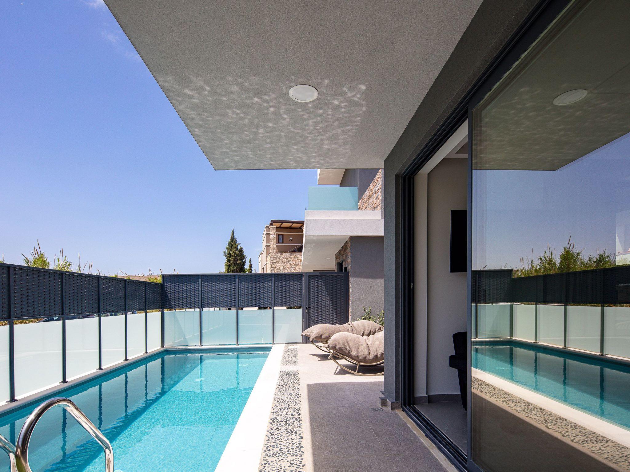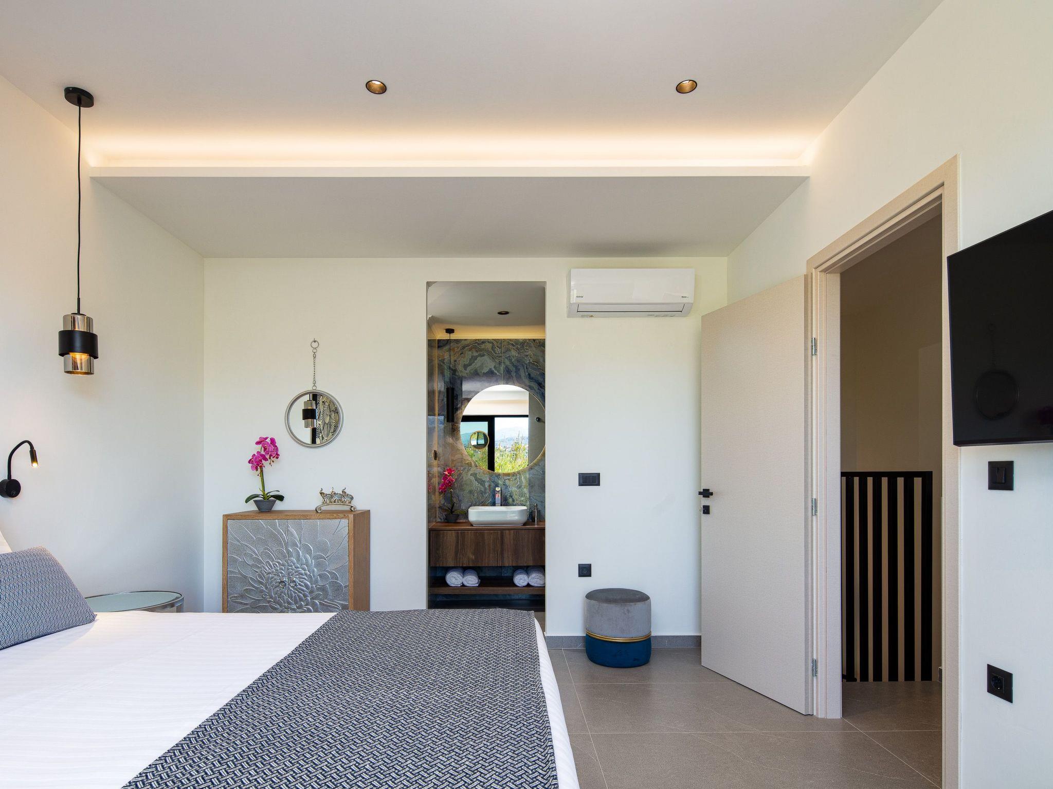 On the same level, Bedroom 1 offers a king-size bed (1.80 x 2.00m) with a high-quality Coco-Mat mattress, air conditioning, a 44’’ Smart TV, an ensuite bathroom with a walk-in shower, and direct access to the pool.