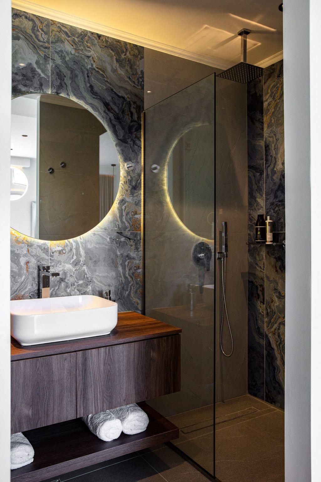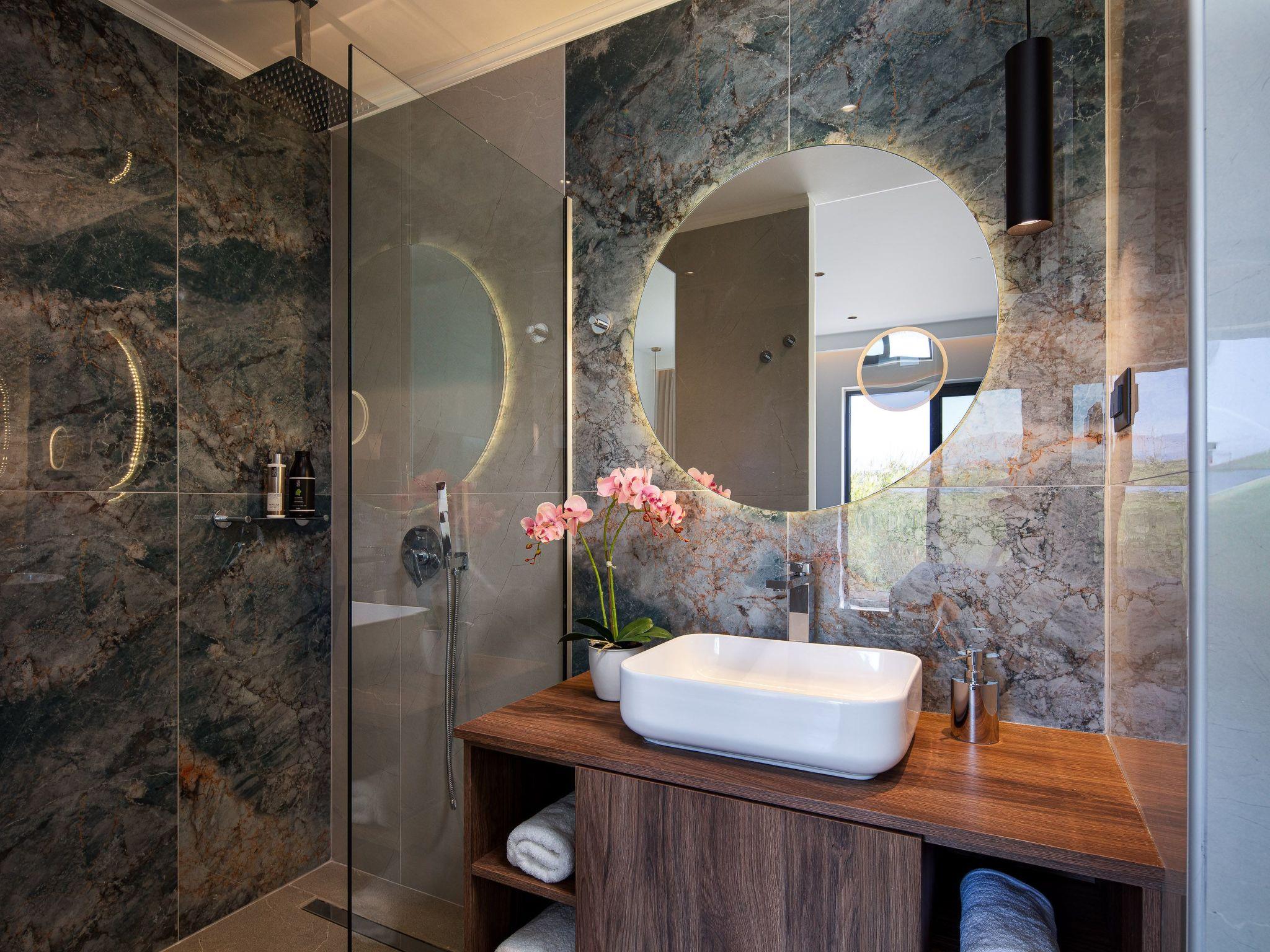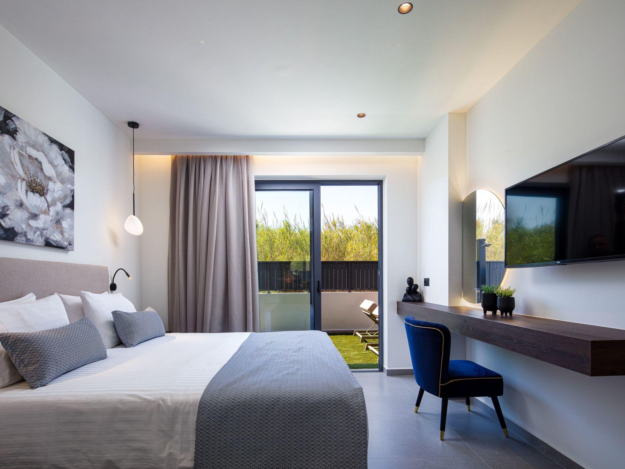 On the same level, Bedroom 1 offers a king-size bed (1.80 x 2.00m) with a high-quality Coco-Mat mattress, air conditioning, a 44’’ Smart TV, an ensuite bathroom with a walk-in shower, and direct access to the pool.