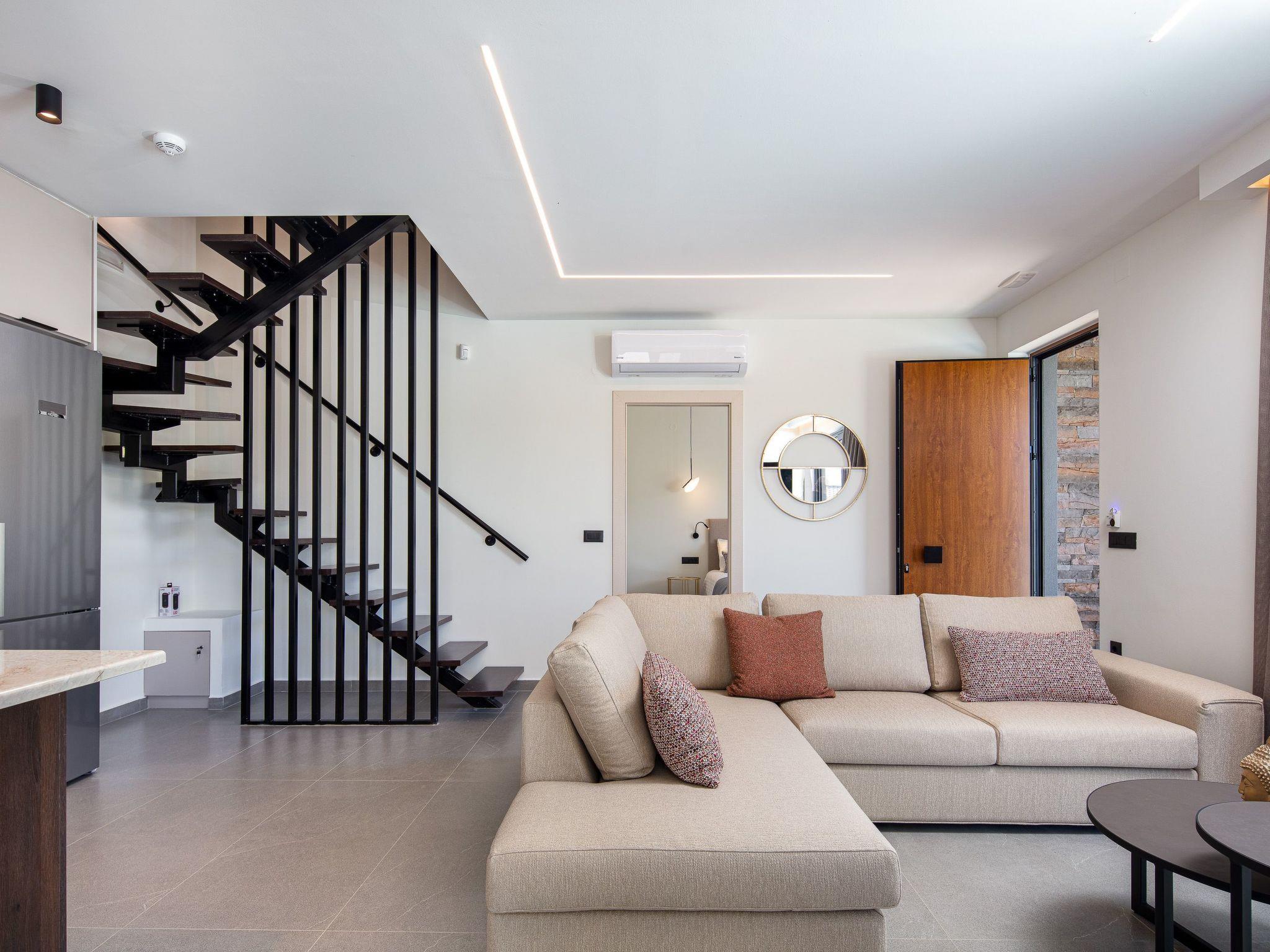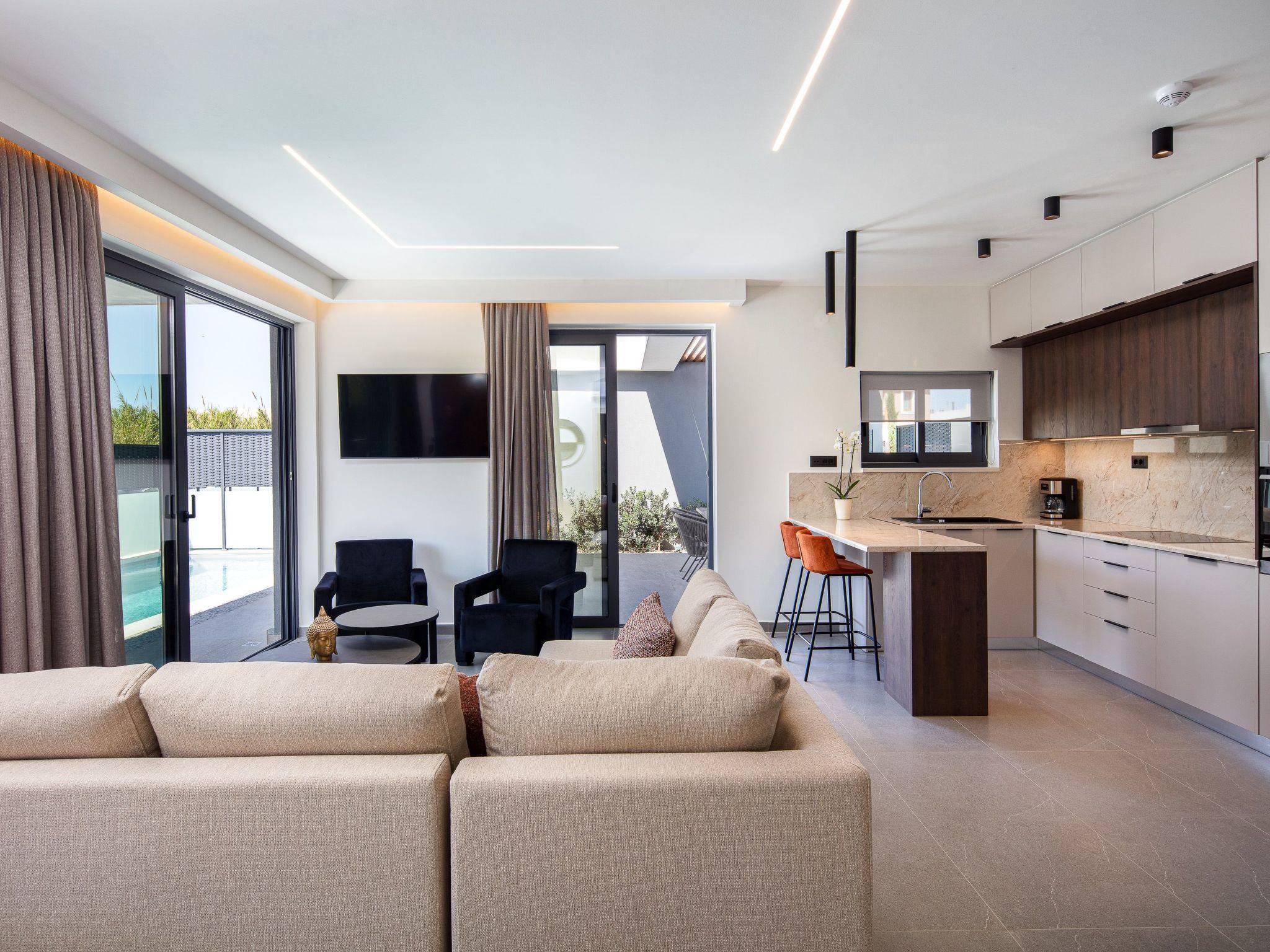 The ground level features a bright open-plan living area with minimalist design and warm neutral tones. The space includes a comfortable sofa, a 50’’ Smart satellite TV, and a Bluetooth speaker, making it ideal for relaxed gatherings. Large glass doors offer seamless access to the pool area, creating a fluid indoor-outdoor living experience. The adjacent fully equipped kitchen includes all modern appliances and a kitchen island with 2 bar stools for casual dining.