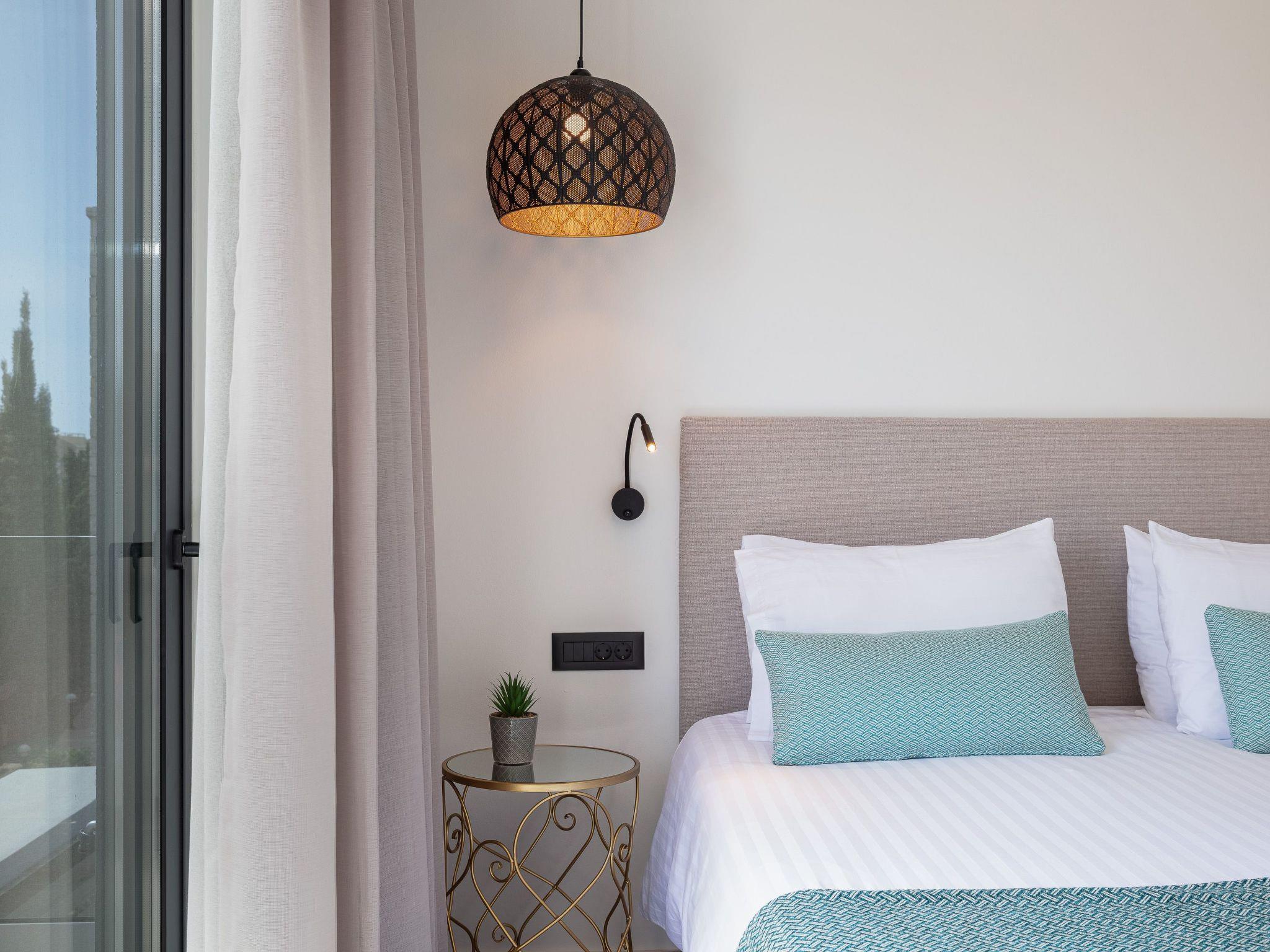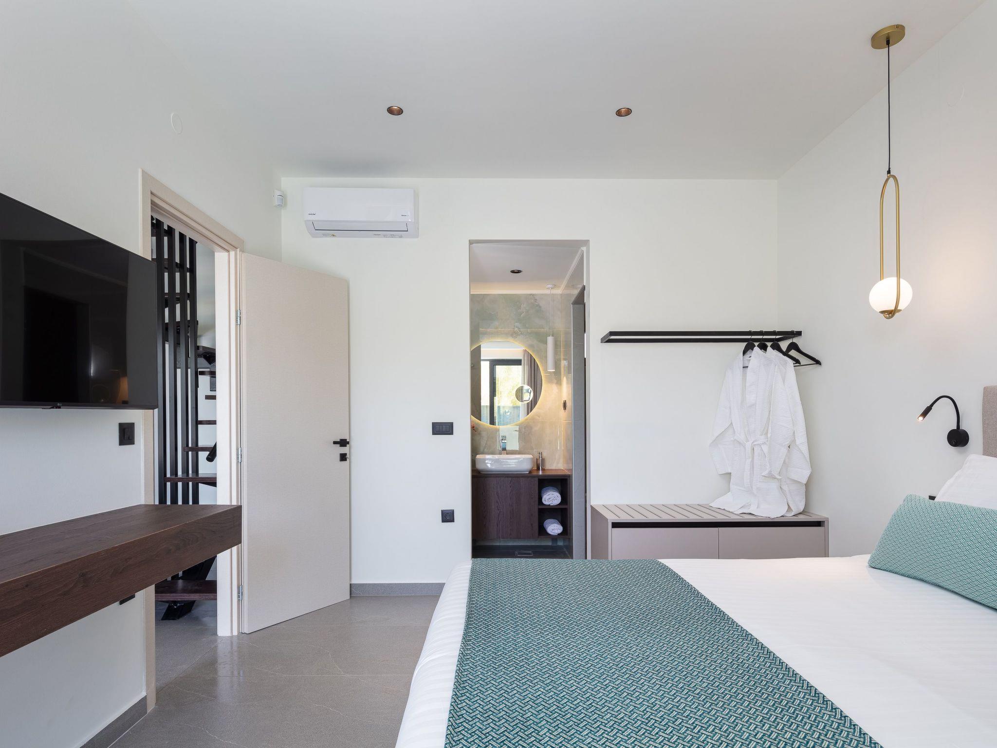 On the same level, Bedroom 1 offers a king-size bed (1.80 x 2.00m) with a high-quality Coco-Mat mattress, air conditioning, a 44’’ Smart TV, an ensuite bathroom with a walk-in shower, and direct access to the pool.