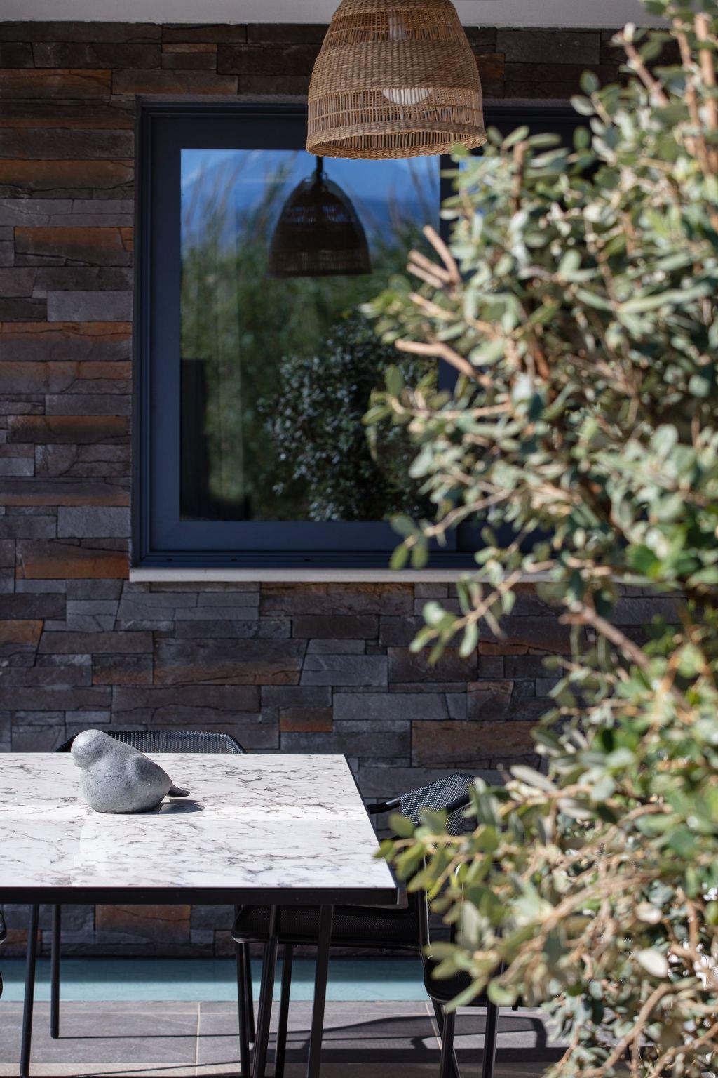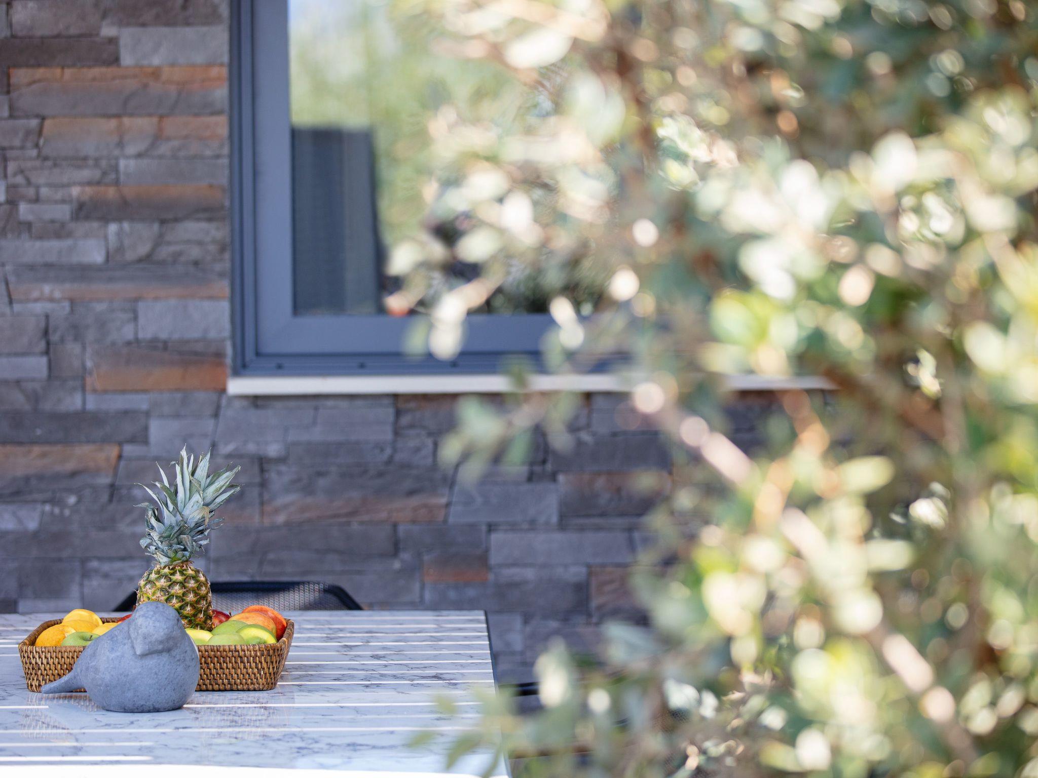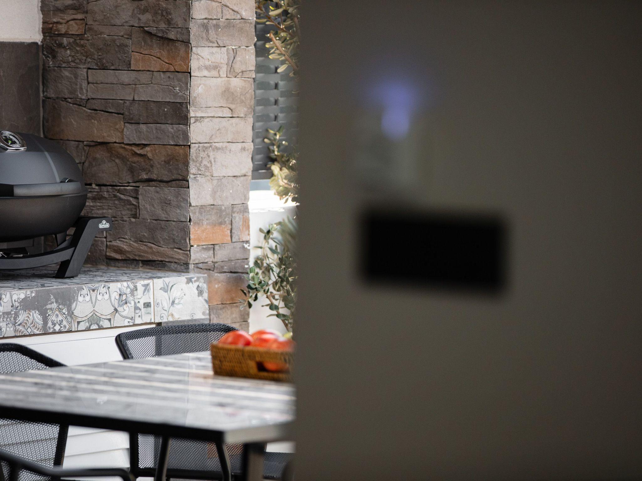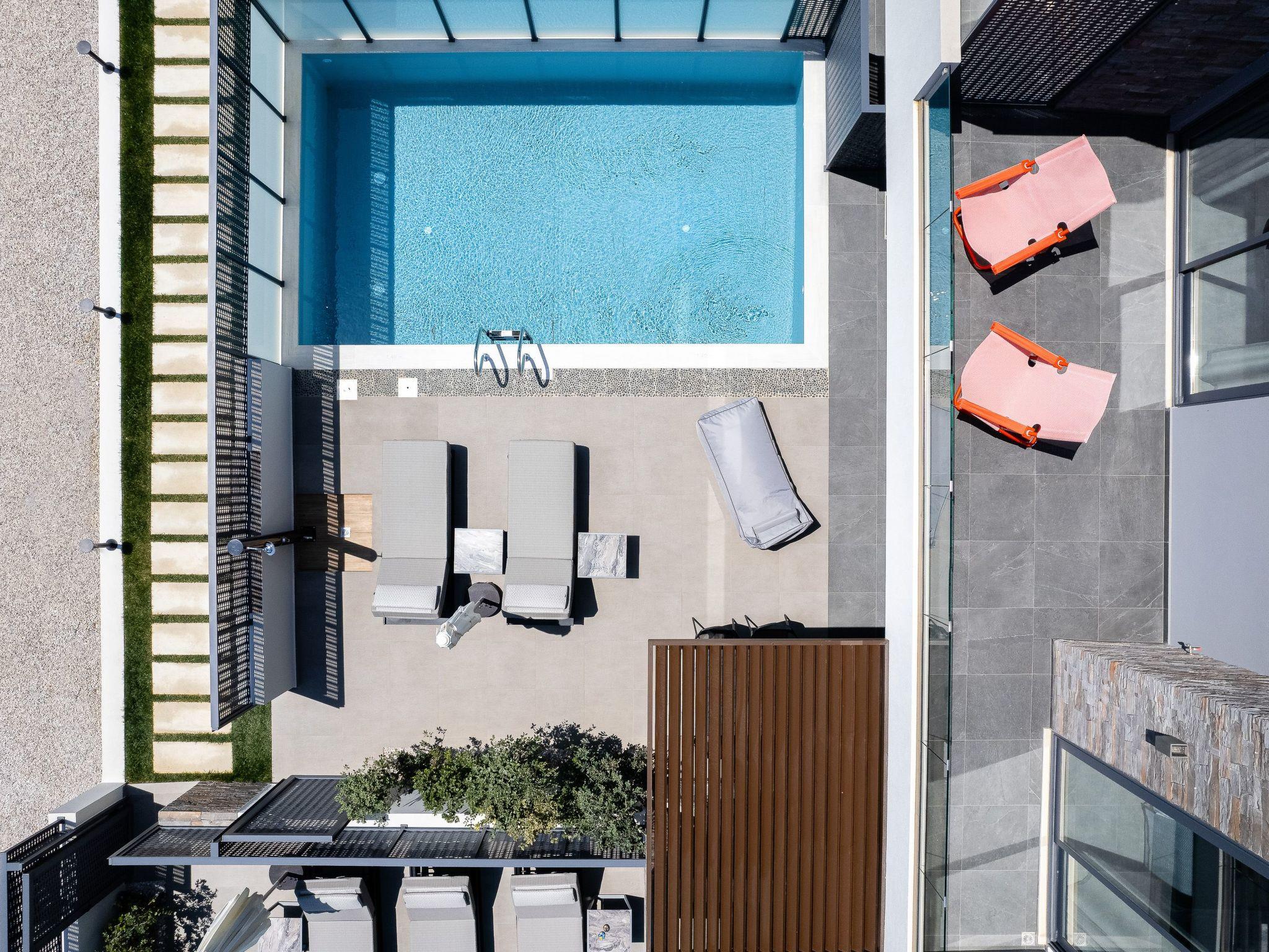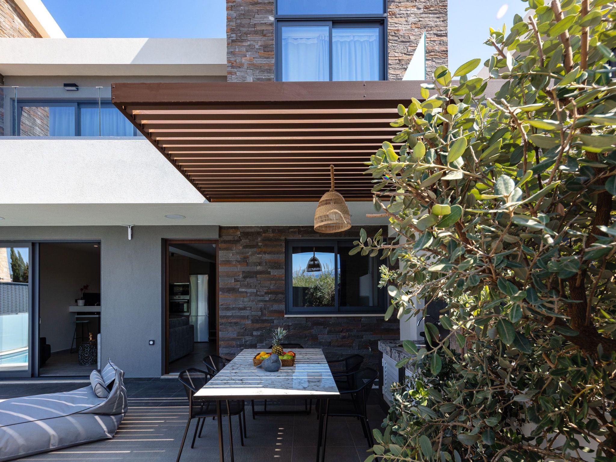 The outdoor area of VillAgioi Villa II has been thoughtfully arranged to provide a private and serene retreat. The 25 sqm private swimming pool is complemented by a poolside shower, sun loungers, and a shaded umbrella area. A fully equipped outdoor kitchenette with an electric BBQ and a large dining table makes it perfect for enjoying al fresco meals.